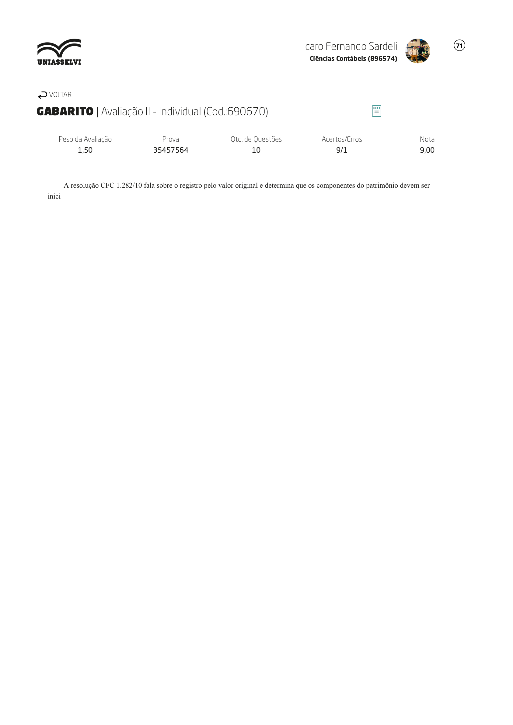 30/08/2021 AVA https://ava2.uniasselvi.com.br/subject/grades-and-tests/answer-book/eyJ0ZXN0Ijp7InRlc3RDb2RlIjoiNjkwNjcwIiwiZGVzY3JpcHRpb24iOiJBdmFsaWHDp8OjbyBJSSAtIEluZGl2aWR1YWwiLCJwYXJhbWV0ZXIiOjU0… 1/4 GABARITO | Avaliação II - Individual (Cod.:690670) Peso da Avaliação 1,50 Prova 35457564 Qtd. de Questões 10 Acertos/Erros 9/1 Nota 9,00 A resolução CFC 1.282/10 fala sobre o registro pelo valor original e determina que os componentes do patrimônio devem ser inicialmente registrados pelos valores originais das transações, expressos em moeda nacional. Considerando o exposto, analise as sentenças a seguir: I- No custo histórico, os passivos são registrados pelos valores dos recursos que foram recebidos em troca da obrigação, que são necessários para liquidar o passivo. II- No custo histórico, em algumas circunstâncias, os passivos são registrados pelos valores em caixa ou equivalentes de caixa, que são necessários para liquidar o passivo. III- Na variação do custo histórico, uma vez integrado ao patrimônio, os componentes patrimoniais do grupo de contas, tanto do ativo quanto do passivo, podem sofrer variações decorrentes de vários fatores. IV- No custo histórico, os passivos são registrados pelos valores que integram os valores dos juros ativos recebidos ou a receber. Assinale a alternativa CORRETA: FONTE: http://www1.cfc.org.br/sisweb/SRE/docs/RES_1282.pdf. Acesso em: 31 mar. 2020. A As sentenças II, III e IV estão corretas. B As sentenças I, II e IV estão corretas. C As sentenças I, II e III estão corretas. D As sentenças I, III e IV estão corretas. A baixa da duplicata como perda, quando da falência, é facultado à contabilização, pois caracteriza impossibilidade de recebimento. A decisão pela contabilização, está amparada por qual Princípio Contábil? A Entidade. B Continuidade. C Oportunidade. D Prudência. Os Princípios Fundamentais de Contabilidade abrangem regras que auxiliam na contabilidade das organizações, apresentando, assim, informações de forma correta, clara e objetiva. Diante deste contexto, sobre os princípios e suas características, associe os itens, utilizando o código a seguir: I- Princípio do registro pelo valor original. II- Princípio da competência. III- Princípio da prudência. ( ) Este princípio determina a adoção do menor valor para os componentes do ativo e do maior para os do passivo. ( ) Este princípio determina que os efeitos das transações e outros eventos sejam reconhecidos nos períodos a que se referem. ( ) Neste princípio, a avaliação dos componentes patrimoniais deve ser feita com base nos valores de entrada. VOLTAR Alterar modo de visualização 1 2 3 Icaro Fernando Sardeli Ciências Contábeis (896574) 71 Usuario Destacar Usuario Destacar Usuario Destacar Usuario Destacar Usuario Destacar Usuario Destacar Usuario Destacar Usuario Destacar 30/08/2021 AVA https://ava2.uniasselvi.com.br/subject/grades-and-tests/answer-book/eyJ0ZXN0Ijp7InRlc3RDb2RlIjoiNjkwNjcwIiwiZGVzY3JpcHRpb24iOiJBdmFsaWHDp8OjbyBJSSAtIEluZGl2aWR1YWwiLCJwYXJhbWV0ZXIiOjU0… 2/4 Agora, assinale a alternativa que apresenta a sequência CORRETA: A II - I - III. B III - II - I. C III - I - II. D II - III - I. O Princípio da Prudência também é um dos integrantes dos Princípios Fundamentais de Contabilidade adotados pela legislação brasileira. Um exemplo clássico deste princípio é a Estimativa para Perdas com Créditos de Liquidação Duvidosa. Sobre o Princípio da Prudência, analise as seguintes sentenças: I- A aplicação do princípio da prudência sempre provocará uma diminuição do ativo, e será observada sempre que houver dúvidas quanto ao valor a ser registrado no ativo e no passivo. II- Um fator importante a ser relacionado no princípio da prudência é quanto ao cuidado que se deve ter ao decidir pelo ajuste, e também ao decidirmos pelo valor a ser ajustado, pois deve ser feito com critérios técnicos à luz dos demais princípios e normas contábeis. III- O princípio da prudência determina a adoção do maior valor para os componentes do ativo e do menor para os do passivo, sempre que apresentem alternativas igualmente válidas para a quantificação das mutações patrimoniais que alterem o patrimônio líquido. Agora, assinale a alternativa CORRETA: A As afirmativas I e III estão corretas. B As afirmativas II e III estão corretas. C Somente a afirmativa II está correta. D Somente a afirmativa I está correta. O postulado da Entidade se refere às atividades econômicas exercidas pela entidade contábil. É a base de toda a teoria da contabilidade. Qual é a única definição que está clara no postulado contábil com relação à entidade contábil? A A adoção do menor valor para os componentes do Ativo e do maior para os do Passivo. B As receitas e as despesas devem ser incluídas na apuração do resultado do período pela competência. C Contabilmente o que é da entidade deve ser lançado separadamente, com o que é dos sócios. D Na classificação e avaliação das mutações patrimoniais, quantitativas e qualitativas, deverão ser consideradas. Uma das bases de mensuração do princípio de registro pelo valor original determina que, uma vez integrados ao patrimônio, os componentes patrimoniais, ativo e passivo, podem sofrer variações decorrentes de alguns fatores. Com relação a estes fatores, classifique V para as sentenças verdadeiras e F para as falsas: ( ) Um destes fatores é o valor justo. ( ) A atualização monetária também compõe estes fatores. ( ) O ajuste de provisão é um fator que influencia nas variações. ( ) O uso da moeda no país é o fator mais relevante. Agora, assinale alternativa que apresenta a sequência CORRETA: A F - V - F - V. B V - V - F - F. C F - F - V - V. D V - F - F - V. 4 5 6 Icaro Fernando Sardeli Ciências Contábeis (896574) 71 Usuario Destacar Usuario Destacar Usuario Destacar 30/08/2021 AVA https://ava2.uniasselvi.com.br/subje