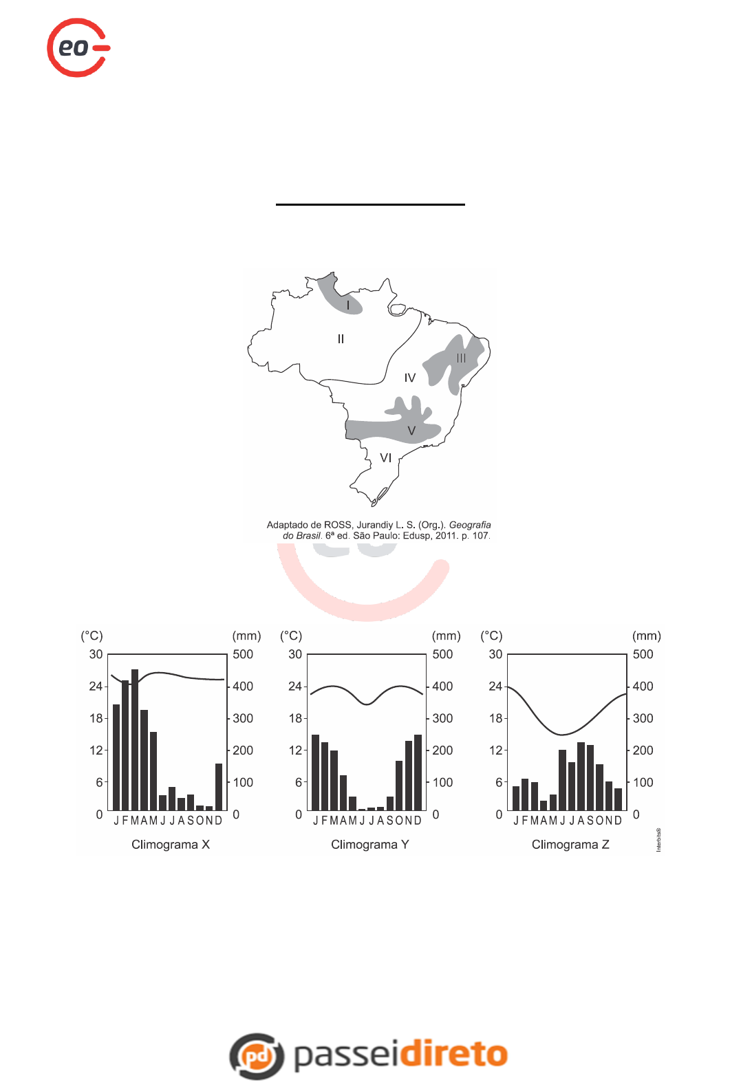LISTA DE EXERCÍCIOS GABARITAGEO – CUPOM: PASSEIDIRETO GABARITAGEO.COM.BR GEOGRAFIA – CLIMA 1. A figura abaixo é uma representação dos principais climas que atuam no Brasil. Considere os seguintes climogramas. Eles representam as médias anuais de temperatura e pluviosidade de três cidades brasileiras entre os anos de 1961-1990. Considerando as características climáticas brasileiras, pode-se afirmar que: a) O climograma X é representativo do clima I (Tropical de Altitude) e pode representar a cidade de Boa Vista. b) O climograma Y é representativo do clima III (Semiárido) e pode representar a cidade de Petrolina. c) O climograma Z é representativo do clima VI (Subtropical) e pode representar a cidade de Porto Alegre. d) O climograma X é representativo do clima IV (Tropical ) e pode representar a cidade de Goiânia. e) O climograma Y é representativo do clima II (Equatorial Úmido) e pode representar a cidade de Manaus. LISTA DE EXERCÍCIOS GABARITAGEO – CUPOM: PASSEIDIRETO GABARITAGEO.COM.BR 2. Leia os trechos a seguir: “17/07/2017- Canela, Gramado e Caxias do Sul, [...] registraram o fenômeno. Frio chegou com intensidade ao estado e temperatura deve cair ainda mais ao longo do dia.“ (https://g1.globo.com) “31/03/2016- Com chances de neve já no outono, o frio em Gramado promete chegar com tudo [...]” (https://www.dicasdegramado.com.br) Nos últimos anos, temos observado na mídia uma série de notícias evidenciando o rigor do inverno na região acima referida. Esta região tem atraído inúmeros turistas que gostam de contemplar o frio, as comidas típicas locais e têm o anseio de conhecer, ao vivo, a neve e o congelamento das águas em pleno Brasil. A associação de dois importantes fatores climáticos justifica a ocorrência de tais fenômenos meteorológicos nesta região. São eles: a) latitude e altitude. b) maritimidade e latitude. c) continentalidade e maritimidade. d) altitude e longitude. e) correntes marítimas e massas de ar. 3. Na Serra do Mar, na região Sudeste do Brasil, durante o verão, ocorrem deslizamentos de terra, causando prejuízos e perdas humanas. Esses deslizamentos, em grande medida, são desencadeados por intensas chuvas __________, que decorrem do movimento ascensional forçado da umidade oceânica, oriunda da massa de ar __________, pelas escarpas litorâneas. Ao atingir elevadas altitudes, essa massa de ar perde temperatura, provocando condensação do vapor e consequente precipitação. Assinale a alternativa cujos termos completam correta e respectivamente as lacunas acima: a) orográficas - Tropical atlântica b) frontais - Polar atlântica c) convectivas - Equatorial atlântica d) orográficas - Polar atlântica e) frontais - Tropical atlântica LISTA DE EXERCÍCIOS GABARITAGEO – CUPOM: PASSEIDIRETO GABARITAGEO.COM.BR 4. Considere as seguintes afirmativas sobre impactos ambientais em três grandes domínios morfoclimáticos brasileiros: I. Possui uma formação vegetal muito densa, com grande biodiversidade. Possui o maior número de espécies ameaçadas do Brasil devido, dentre outros, à exploração madeireira, às monoculturas de exportação e à expansão urbana. Devido ao intenso desmatamento de suas encostas, são intensos os processos erosivos e frequentes os deslizamentos de terra nesse domínio morfoclimático. II. Nas bordas desse domínio, caracterizado pelo relevo de planícies, depressões e baixos planaltos, localiza-se a maior parte do chamado arco do desmatamento, uma área cujas atividades econômicas, ligadas à extração madeireira e à abertura de novas áreas para a agricultura e pecuária, vêm acarretando intenso processo de queimada, desflorestamento e intensificação dos processos erosivos. III. Esse domínio tem sofrido o maior dos impactos ambientais no contexto brasileiro com a expansão da monocultura canavieira e da soja. Embora tenha sido declarado como um dos principais hotspots brasileiros, 57% de sua área original já estão desmatados, e se o ritmo do desmatamento de sua vegetação não diminuir, até 2030 essa formação poderá ter desaparecido. As afirmativas acima referem-se, respectivamente, aos domínios morfoclimáticos; a) Amazônico – Cerrado – Pantanal. b) Mata Atlântica – Cerrado – Amazônico. c) Mares de Morro – Amazônico – Cerrado. d) Amazônico – Cerrado – Mata Atlântica. e) Araucária – Amazônico – Pantanal. 5. As chuvas torrenciais de verão, denominadas chuvas __________, são caracterizadas por serem precipitações breves, mas violentas, que ocorrem na maior parte do território brasileiro. Essas chuvas estão associadas ao deslocamento da Zona de Convergência Intertropical (ZCIT) para a porção central da América do Sul entre os meses de setembro e março, fazendo com que a massa __________ expanda-se para a Bolívia e Brasil central, chegando a atuar sobre São Paulo, provocando os chamados aguaceiros de verão. Assinale a alternativa que completa corretamente as lacunas acima. a) convectivas / Equatorial continental (mEc) b) orográficas / Tropical continental (mTc) c) convectivas / Equatorial atlântica (mEa) d) orográficas / Equatorial continental (mEc) e) frontais / Equatorial atlântica (mEa) LISTA DE EXERCÍCIOS GABARITAGEO – CUPOM: PASSEIDIRETO GABARITAGEO.COM.BR 6. Observe o climograma de uma cidade brasileira e considere as afirmativas relacionadas a este. I. O clima representado é denominado equatorial, em cuja área está presente uma vegetação do tipo hidrófila e latifoliada, característica da Floresta Equatorial. II. Refere-se a um clima sob forte influência da massa Polar atlântica (mPa) e que apresenta uma significativa amplitude térmica anual. III. Trata-se de um clima subtropical úmido, com precipitações ao longo de todo o ano, sem ocorrência de estação seca. IV. Nas áreas em que esse clima predomina, observam-se precipitações que ultrapassam os 2.200mm, o que, aliado às altas temperaturas, favor