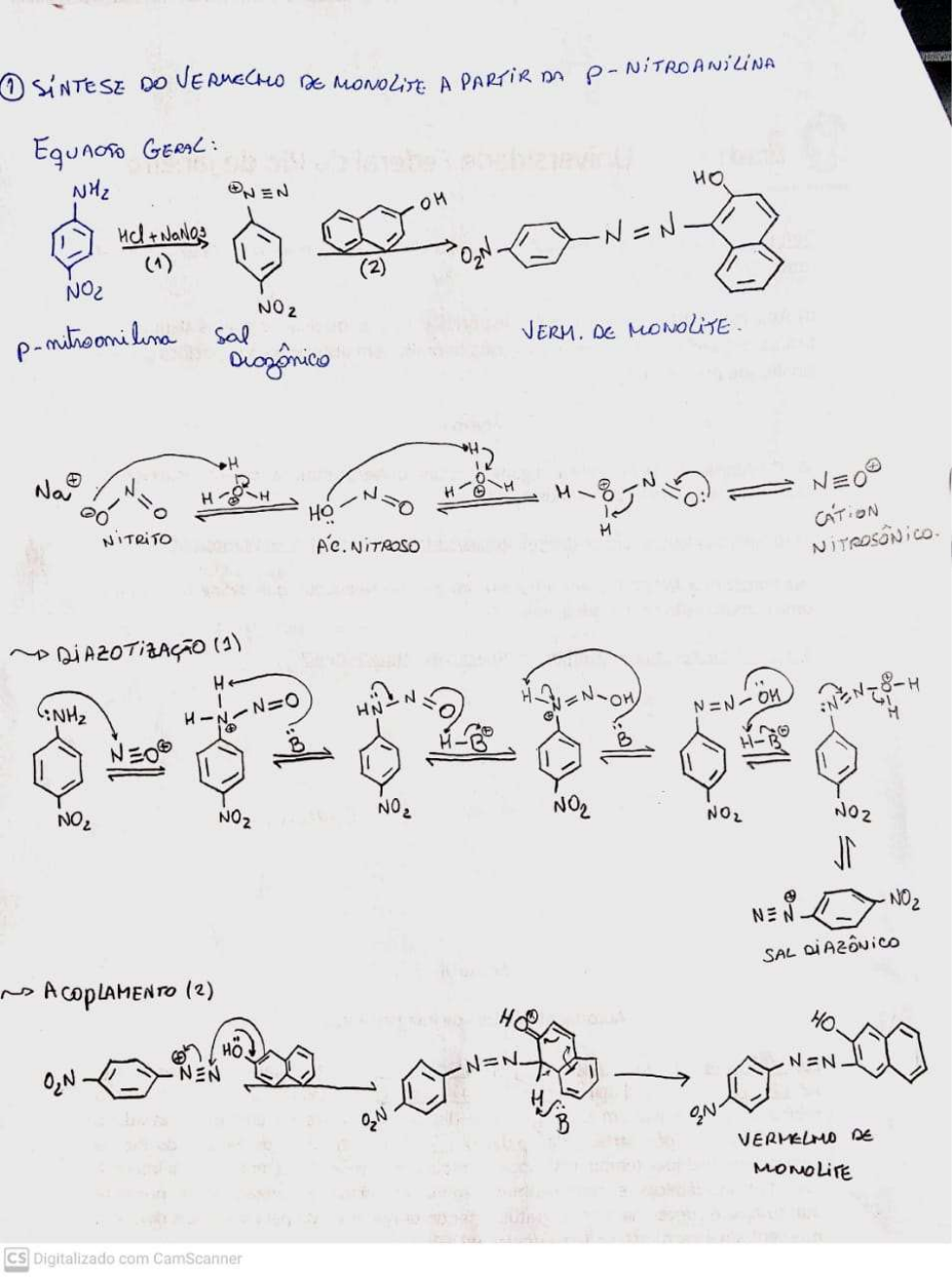 Experimento 3. Síntese do vermelho de monolite a partir da p-nitroanilina Aluna: Marianna Matos 1) Retirado de: SOLOMONS, G.; FRYHLE, C. Química Orgânica, vol. 2, 12ed. Rio de Janeiro: LTC, 2018. Aula síncrona – Professor: Nanci e Sebastian – Dada em: 15 de abril de 2021. 2) A anilina é um derivado orgânico do amoníaco, formada pela substituição de um hidrogênio por um radical fenila. O valor do pKb da anilina é devido ao efeito de ressonância, que ao ser desenvolvido, atribui carga positiva no nitrogênio diminuindo a sua densidade eletrônica e o seu caráter básico. Se for introduzido no anel da anilina (fenilamina), um substituinte ativador de anel (grupo metóxi – doador de elétrons), ocorre um aumento da força básica e o valor de pKb diminui. Com isso, nas estruturas acima, o p-metoxianilina apresenta maior força básica, por ser o grupo metóxi um ativante de anel mais forte que o grupo metila. A introdução de grupos desativadores de anel (grupo nitro – retirador de elétrons) na estrutura da anilina favorece uma diminuição da força básica, pois estes grupos, através do efeito de ressonância, “puxam” elétrons do anel aromático, diminuindo a densidade eletrônica do anel. Com isso, outro efeito que pode ser apresentado é o efeito de eletronegatividade do N e do O que faz com que eles sejam um grupo de retirada extremamente forte. O efeito indutivo do grupo nitro é forte quando localizado na posição para, por exemplo, isso faz com que a estrutura da p-nitroanilina apresente um valor maior de pKb quando comparada as outras duas estruturas. Com isso temos a ordem de reatividade: p-metoxianilina mais reativa, em seguida anilina e por ultimo a p- nitroanilina. Retirado de: S SOLOMONS, G.; FRYHLE, C. Química Orgânica, vol. 2, 12ed. Rio de Janeiro: LTC, 2018. 3) Os sais arenodiazônicos são instáveis em temperaturas acima de 5°C – 10°C, e muitos explodem quando secos. Além de serem instáveis, uma temperatura elevada pode ocasionar formação de produtos multi- nitrados e intermediários (cátion diazônio) e o seu controle também serve para que não haja a saturação, hidrólise do sal diazônico com a formação de fenol ou sobra de resíduos. A temperatura deve ser mantida baixa para evitar que o N2, que é um ótimo grupo de saída, se desprenda do cátion diazônio. À temperatura ambiente, o N2 seria perdido, e o cátion arila remanescente seria atacado pela água formando assim um fenol. Obs/curiosidade: Na maioria das reações de substituição de sais de diazônico não há a necessidade de isola- los. Basta simplesmente adicionar outro reagente (CuCl, CuBr, KI... etc) à mistura e aquecer suavemente a solução para que a substituição (acompanhada de liberação de nitrogenio) ocorra: Retirado de: SOLOMONS, G.; FRYHLE, C. Química Orgânica, vol. 2, 12ed. Rio de Janeiro: LTC, 2018. 4) 5) Com base no vídeo: Rendimentos 95% - p-nitroacetanilida – MM: 180,2 – 6,68g 83% - P-nitroanilina – MM: 138,1 – 2,7g 73% - Vermelho de monolite – MM: 293,3 – 2,4g Rendimento global da reação do vermelho de monolite = 58%. Para fazer o cálculo dos rendimentos, o processo do vermelho de monolite foi no rendimento global, foi necessário considerar os rendimentos dos compostos utilizados porque eles não estavam purificados e do produto final. No caso do rendimento da p-nitroanilina foi comparado a massa de acetanilida purificada utilizada com o que foi obtido de produto final. Referencias utilizadas no total: SOLOMONS, G.; FRYHLE, C. Química Orgânica, vol. 2, 12ed. Rio de Janeiro: LTC, 2018. BRUICE, P. Química Orgânica, vol.1, 4 ed. São Paulo, Pearson, 2006. Aula síncrona – Professor: Nanci e Sebastian – Dada em: 15 de abril de 2021 – anotações do caderno de Quimica orgânica experimental II.