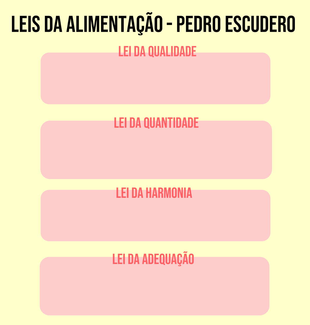 A dieta deve ser completa, devendo possuir todos os tipos de nutrientes necessários diariamente. Havendo uma alimentação variada A quantidade de nutrientes deve ser suficiente para suprir as exigências energéticas do organismo. Sendo considerado: idade, gênero, estado fisiológico, etc.... Deve haver um equilíbrio da ingestão de nutrientes, tendo uma relação de proporção entre eles. A alimentação deve ser apropriada de acordo com a faixa etária, estado geral/fisiológico, hábitos alimentares, condições socioeconômicas, etc....