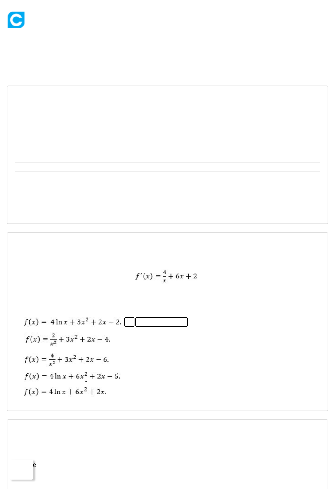Cálculo Diferencial e Integral II (/aluno/timeli… Av1 - Cálculo Diferencial e Integral II (/notific Informações Adicionais Período: 02/08/2021 00:00 à 30/08/2021 23:59 Situação: Confirmado Pontuação: 750 Protocolo: 640702519 A atividade está fora do período do cadastro Avaliar Material 1) a) b) c) d) e) 2) Texto base “Determinar as variáveis e as suas relações, talvez seja uma das maiores dificuldades que encontramos ao nos depararmos com problemas do cotidiano.” Qual é a função , cuja derivada é dada por e f(x) = 3? Alternativas: Alternativa assinalada Texto base “A técnica de datação por carbono -14 foi descoberta nos anos quarenta, por Willard Libby. Ele percebeu que a quantidade de carbono -14 dos tecidos orgânicos mortos diminuía a um ritmo constante com o passar do tempo. Assim, a medição dos valores de carbono -14 em um objeto antigo nos apresenta pistas muito exatas dos anos decorridos desde sua morte.” https://www.colaboraread.com.br/aluno/timeline/index/2245537506?ofertaDisciplinaId=1654871 https://www.colaboraread.com.br/notificacao/index javascript:void(0); a) b) c) d) e) 3) a) b) c) d) e) 4) a) b) c) d) e) Uma amostra de um certo objeto possui no início do processo de decaimento N(0) = 1x10 núcleos radioativos de carbono-14. Sabendo que a variação do decaimento de núcleos radioativos de carbono-14 com o tempo (em anos) é N(t) = -N(0)¿e , em que ¿ = 1,245x10 .A alternativa que corresponde ao número de núcleos radioativos após 3000 anos é: Alternativas: 4183. 4738. 5366. 6077. 6883. Alternativa assinalada Texto base “O cálculo de áreas ainda é tema fundamental nas engenharias, seja da área de contato entre vigas (suporte) ou da área de terrenos ou peças. ” A alternativa que corresponde à área entre as curvas y = 4 e y = x é: Alternativas: 6,35 u.a. 9,24 u.a. 10,67 u.a. Alternativa assinalada 11,83 u.a. 12,91 u.a. Texto base “Quando analisamos uma empresa para investir (comprar ações), devemos verificar o custo de produção, receita e lucro, entre outros fatores.” A receita marginal na venda de determinado produto é dada por reais por unidade. Sabendo que sem venda não há receita (R(0) = 0) determine a receita na venda de 100 produtos? Alternativas: R$ 350,50. R$ 440,43. R$ 567,32. R$ 654,65. Alternativa assinalada R$ 803,14. 4 -¿t -0 2 5) a) b) c) d) e) Texto base “Velocidade de internet é um tema bem atual, as operadoras de telefonia celular vivem anunciando sobre a velocidade de seus pacotes.” No instante em que um cidadão clicou para baixar uma música de 3,3 MB (megabyte), a velocidade do download foi de d'(t) = -0,02t + 0,4 MB/s. Quanto tempo demorou para baixar essa música? Alternativas: 8 segundos. 9 segundos. 12 segundos. Alternativa assinalada 15 segundos. 17 segundos.
