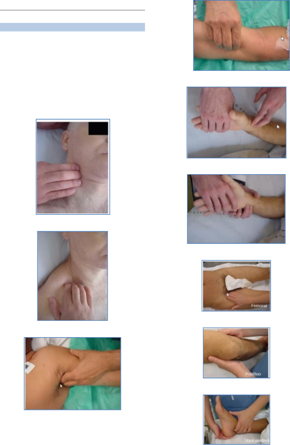 Pulso e circulação colateral Eduardo Ferreira Pulsos Noções gerais – Palpação e inspeção Amplitude Frequência Ritmo (uniforme do intervalo de tempo entre um pulso e outro) Regularidade (estabilidade) Pulsos mais comuns de serem avaliados Carotídeo Subclávio Axilar Braquial Radial Ulnar Femoral Poplíteo Tibial posterior Tibial anterior Artéria dorsal do pé (pedioso) Pulso radial Estado da parede arterial o Manobra de Osler e pseudo- hipertensão arterial Frequência o Normal 60-100 btm o Exemplo de taquisfigmia (>100) exercício, febre, hipertireoidismo o Exemplo de bradisfigmia (<60): bloqueio AV, bradicardia sinusal o Déficit de pulso: FC < pulsações por minuto na radial Contração ventricular não impulsiona sangue para porta. Extras-sístoles ventriculares, fibrilação atrial. Ritmo (regular ou irregular) o Irregularidade = arritmias Amplitude ou magnitude – grau de enchimento da artéria durante a sístole e seu esvaziamento durante a diástole. o Amplo (insuficiência aórtica) o Mediano o Pequeno ou fino (estenose aórtica) Tensão e ou dureza o Mole – Quando a pressão para interromper as pulsações é mediana o Duro – quando a pressão necessária para interromper as pulsações é forte o Pulso de tensão mediana Tipos de onda o Ondas de pulso normal o Pulso célere ou em martelo d’água – some rapidamente, curto. Insuficiência aórtica, nas FAB, anemias graves e hipertireoidismo. o Pulso pequeno ou parvus – tensão diminuída, fraco e pequeno. Estenose aórtica grave, na ICC e na hipovolemia. o Filiforme – pequena amplitude e mole – desidratação. o Alternante – onda ampla seguida de onda fraca o Paradoxal – Acentuada redução da amplitude do pulso, secundário à diminuição do retorno venoso e do débito cardíaco durante a inspiração (pericardite constrictiva, tamponamento cardíaco). Comparação com o lado homólogo MANOBRAS ESPECIAIS Palpar os pulsos em repouso primeiro. Allen – revela o enchimento, comparar a amplitude do pulso e a dominância ou oclusão das artérias radial ou ulnar. Avaliar fístula arteriovenosa (FAV) 1. Paciente abra e fecha a mão rapidamente 2. Comprimir as artérias com a mão fechada e observar palidez 3. Soltar uma artéria e ver o enchimento Adson – avaliar a compressão da artéria subclávia e do plexo braquial pelo músculo escaleno anterior, pela costela cervical ou pelas fibras fibróticas. 1. Hiperextensão do braço e hiperextender o pescoço e girar para o lado examinado. Palpando a artéria radial. Inspirar profundamente e ver mudança na amplitude. Costoclavicular/Eden Detectar compressão da artéria subclávia em nível de passagem pelo espaço costoclavicular. 1. Hiperextender o braço e comprimir o ombro. Palpando a radial 2. Pulso diminuir ou desaparecer Hiperabdução ou Wright Se existe compressão pelo músculo peitoral menor. Vai haver a diminuição ou ausência. 2 tempos. Em todas estas manobras, espera-se que o pulso não se altere – normalidade. Neurológica – dormir com o braço por baixo da cabeça dormência Pulso periférico Síndrome isquêmica aguda dos MM Ausência de pulso Palidez Cianose móvel Cianose fixa Colapso das veias superficiais Síndrome isquêmica crônica dos MM Ausência/diminuição do pulso Dor/claudicação Coloração avermelhado-cianótica Áreas necróticas Impotência sexual Circulação colateral Pulso venoso Avaliar o estado de turgência da veia jugular externa Presença de frêmitos ou sopros nos vasos do pescoço Turgência jugular a 45°, pois sentado colaba e deitado tem maior enchimento venoso (falso positivo) hipertensão venosa no sistema cava superior. Pulso venoso – a veia passa mais lateral observado na base do pescoço dependentes da modificação de volume que ocorrem nas veias jugulares internas. o Reflete a dinâmica do coração direito Pulso capilar Visualização de pulsação em certos locais (ex: leito ungueal) devido à transmissão do pulso arterial nos pequenos vasos capilares. 1. Situações que levam à dilatação dos capilares: calor ambiental, banhos quentes, febre, anemia, gestação, hipertireoidismo. 2. Situações que aumentam a pressão de pulso (diferença entre a pressão arterial sistólica e a diastólica): o exemplo clássico é a insuficiência aórtica mas também pode ocorrer na hipertensão sistólica isolada, por exemplo. Técnica – colocar uma luz abaixo da falange distal e aumentar a pressão da região comprimindo a região distal da unha. Sinal de Quincke: Pulsação dos capilares observada no leito ungueal. Sístole fica vermelho e na diástole fica branco. Na insuficiência aórtica grave o sinal desaparece. Circulação colateral Circuito venoso anormal visível ao exame da pele, secundário à dificuldade ou impedimento do fluxo venoso através dos troncos venosos principais. Características: Visível, topografia anormal, assimétrica e intensa. Localização Tórax Abdome MMSS Cefálico Direção do fluxo Braquiocefálica – obstrução da subclávia proximal ou tronco braquiencefálico. Fluxo do tórax cabeça. De fora para dentro, em direção às veias mamárias e ázigos e semi- ázigos. Cava superior – deveria pegar as jugulares subclávia – tronco venoso braquiocifélico direito e esquerdo circulação colateral dos dois lados. Fluxo do tórax abdome (ilíacas – ázigos e hemiázigos – cava inferior e átrio direito). Fluxo tóraco-abdominal Porta - obstáculo ou nas veias supra-hepáticas (síndrome de Budd-Chiari), no fígado (cirrose hepática) ou na veia porta (pileflebite). o Face anterior do tronco, mais na região Peri-umbilical, epigástrica e face anterior do tórax. o A veia umbilical abre e forma a circulação colateral o Direção do fluxo se dá de baixo para cima. Abdome tórax. Na obstrução da veia porta pode ir para várias direções cabeça de medusa. fluxo abdome tórax // Cabeça de medusa Peri- umbilical Cava inferior – Circulação colate