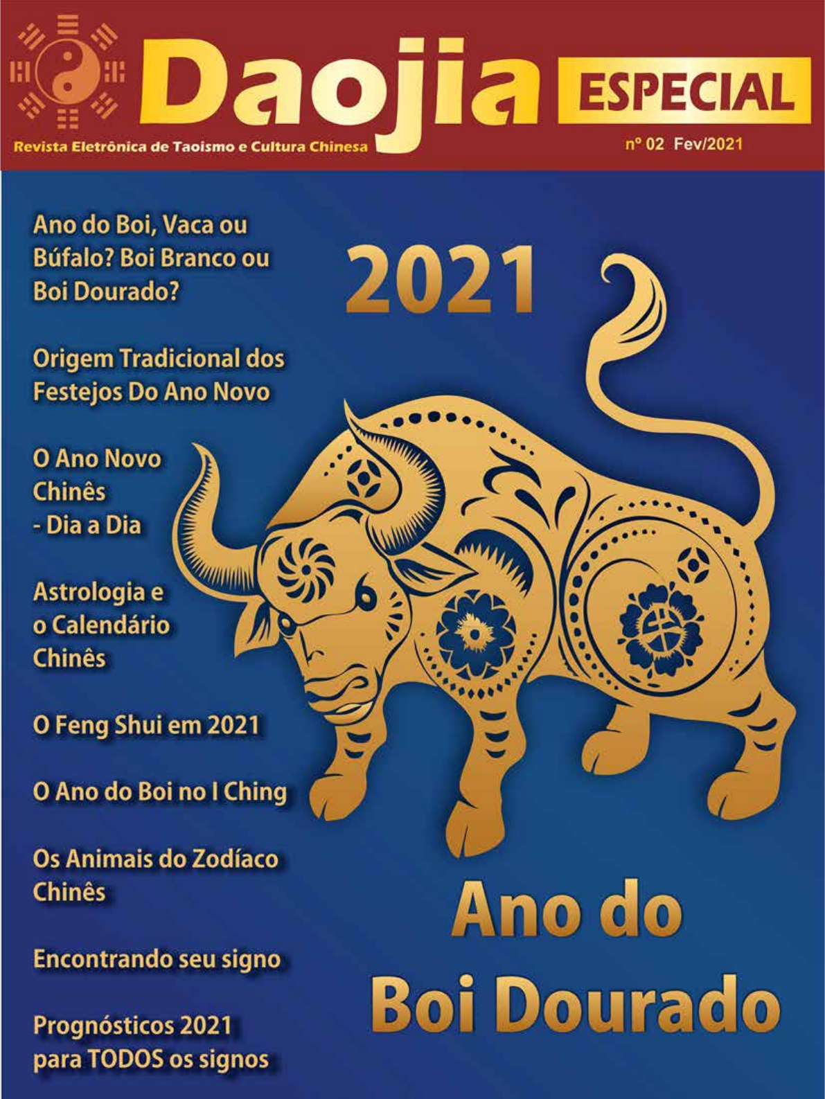 Daojia ESPECIAL nº 02 Fev 2021 1 2021 O Ano do Boi Dourado A Sabedoria do Taoismo em suas mãos Conheça alguns livros publicados pelo Prof. Gilberto António Silva Os Caminhos do Taoismo Uma obra fundamental para se compreender o Taoismo de modo completo. O mais abrangen- te panorama da cultura taoista publicado no Brasil. Conheça a história, conceitos principais, Mestres do Tao, livros importantes, técnicas taoistas como Medicina Chinesa e Feng Shui, o lado religioso, o taoismo popular e muito mais. I Ching - Manual do Usuário O I Ching, O Livro das Mutações da velha China, é uma das obras mais antigas da Humanidade, com 3.000 anos. Esta obra visa a transmitir desde os conceitos mais funda- mentais do I Ching até dicas de utilização para estudantes experientes. Todas as pessoas terão muito o que aprender deste livro, do básico ao avançado. Por ser um “Manual do Usuário”, esta obra não traz o texto do I Ching, propria- mente dito, mas um conjunto de ferramentas para utilizá-lo com mais eficiência, desvendando pequenos e obscuros segredos. “... desejo a todos que leiam esse livro maravilhoso e importante, “Os Caminhos do Taoismo”. Isso é muito importante. Até agora eu vi muitos livros, mas esse livro realmente é muito bom, dá para ajudar muito as pessoas a terem o conhecimento para introdução ao Tao. Eu recomendo, é muito bom”. Mestre Liu Chih Ming (entrevista - Daojia#4) SUCESSO ABSOLUTO MAIS DE 86.000 DOWNLOADS EFETUADOS! 141 páginas176 páginas 268 páginas 329 páginas 292 páginas Dominando o Feng Shui Como aprender o Feng Shui Tradicional Chinês em casa, de modo fácil e agradável. Diferente de outras obras, Do- minando o Feng Shui é um curso completo em 24 aulas demonstradas de modo prático e em linguagem simples, re- cheado de exemplos e fartamente ilustrado com desenhos, plantas e esquemas. Toda a técnica é transmitida de modo gradual segundo um esquema didático planejado e capacita o leitor a dominar esta técnica e a aplicar imediatamente tudo o que aprendeu. O curso abrange toda a parte histó- rica e filosófica, os fundamentos, duas escolas tradicionais (“8 Residências” e “Escola da Forma”), técnicas avançadas e técnicas complementares China e sua Identidade Este livro em formato de bolso traz um ensaio conciso e objetivo sobre a formação e desenvolvimento da identidade nacional chinesa desde seus primórdios e os obstáculos que enfrentou no século XX. Conheça o processo de formação da China como nação e quando seus habitantes passaram a se denominar “chineses”. A unificação do império, a expan- são pela Ásia, a Rota da Seda, os contatos com o Ocidente, as tentativas de colonização por parte dos europeus, a queda do Império e o advento da República, a guerra civil e a con- solidação do Comunismo, a tragédia da Revolução Cultural, a China atual. 88 páginas Reflexões Taoistas Reflexões Taoistas trata do olhar taoista sobre a vida cotidiana, explicando conceitos dessa milenar filosofia ao mesmo tempo em que se aplicam esses conheci- mentos ao mundo ao nosso redor. Uma obra simples e desapegada que exemplifica a aplicação da filosofia taoista em nosso dia a dia e ilustra vários de seus fun- damentos. Guia de Autodefesa para Mulheres Um livro simples e objetivo, que possibilita às mulheres de qualquer idade uma autodefesa eficiente. Diferente de outros métodos, aqui proporcionamos conhecimentos de autocontrole emocional, estratégia, postura, legislação, psicologia do agressor, armas, situações de risco, níveis de aplicação, onde buscar auxílio em caso de violência e várias técnicas marciais simples e eficientes, fáceis de serem treinadas em casa e empregadas em momentos de perigo. Feito com o apoio da Delegacia da Mulher, é o único que conta com conteúdo aprovado por essa instituição. Segredos da Comunicação Profissional Depois de trabalhar em várias grandes clínicas de terapias holísticas e Medicina Chinesa em S. Paulo e presenciar mui- tos barbarismos, o autor se propôs a escrever um livro para ajudar os profissionais a se comunicar melhor. Comunica- ção é um processo. Este livro vai lhe mostrar como isto fun- ciona e suas várias etapas, de modo simples e direto. Esta é a obra certa para alavancar seu negócio. Conheça a comuni- cação interna, externa, propaganda, comunicação digital na internet, vídeos e audiovisual, o que fazer, dicas e exemplos práticos. No campo profissional e empresarial, comunicar- se de forma correta equivale simplesmente a sobreviver- sem comunicação adequada a empresa não funciona. 95 páginas Compre já: https://amzn.to/3fJuDG1 Compre já: https://clubedeautores.com.br/livro/reflexoes-taoistas Compre já: https://amzn.to/35THmS7 Compre já: https://amzn.to/2T200SF Compre já: https://amzn.to/3cGum4Z Compre já: https://amzn.to/2WWS31Y Compre já sua edição impressa: https://amzn.to/2T32fF1 http://taoismo.org/index.php/ebooks/ LANÇAMENTO! Agora os livros do Prof. Gilberto estão disponíveis em formato digital! ü Menor valor üSem correios üRecebimento imediato por email Visite nossa loja: EDITORIAL Editor Esta segunda edição especial é novamente dedicada ao Ano Novo Chinês. Fizemos uma completa revisão e atualização no material de modo que você possa ter informações interessantes e relevantes sobre essa que é a maior comemoração da China. Vivemos em uma época conturbada pela pandemia virótica que assolou o planeta e ameaça vidas de muitas maneiras - doença, economia, isolamento, transtornos psicológicos. Nenhum desses fatores é menor ou menos importante que outro. Em meio a isso notamos um fator cíclico que faz parte da filosofia chinesa e que é expresso de modo mais contundente justamente pelo calendário tradicional chinês. O Ano do Rato é o primeiro de um ciclo de 12 anos e que tradicionalmente é encarado pelos chineses como uma época de grande possibilidade de pestilências. Basta lembrar