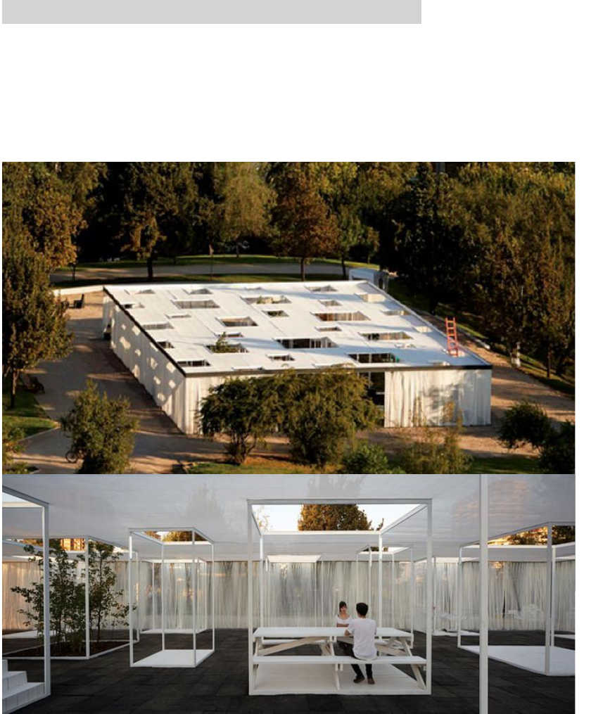 O pavilhão tem como funcionalidade: Entretenimento e realizações culturais, como eventos literários, shows, palestras, dentre outros. Com formas retas, utilizando o aço, vidro, madeira e placas de cimento queimado, o pavilhão será dividido em espaços interligados pela transparência do vidro, com um maior espaço atribuído a área central, destinado a realizações onde a demanda da capacidade de ocupação é maior (pequenos shows, palestras, etc). O diferencial do pavilhão é sua interação com o terreno, onde as árvores naturais estarão integradas ao interior, com a copa fugindo por aberturas na cobertura do pavilhão. Exemplos de pavilhões com a mesma função: Ambient 30 60 - Projetado por Umwelt. É um pavilhão retangular, feito de estruturas de aço, piso de madeira e tecido para fechamento nas laterais. Tem muita interação com o parque ao seu redor e há árvores que parecem surgir dentro do pavilhão, por entre os espaços vazios. O pavilhão é um local de descanso, leitura, e exposição de objetos. Pavilhão Temporário em Picnic «Afisha» É um espaço comum de comunicação e atividade, a parte interna deste foi dividida em vários compartimentos e cada um deles tem uma estrutura separada e individual, que determinam juntos uma precisa forma retangular preenchida com um grid irregular de estrutura metálica branca e tubos de plástico. Organização dos espaços: Materialidade: Estrutura metálica- Aço e vidro. Esse sistema construtivo é industrializado, as peças são produzidas em fábrica e chegam no canteiro de obra prontas para montagem, acelerando a execução do projeto.