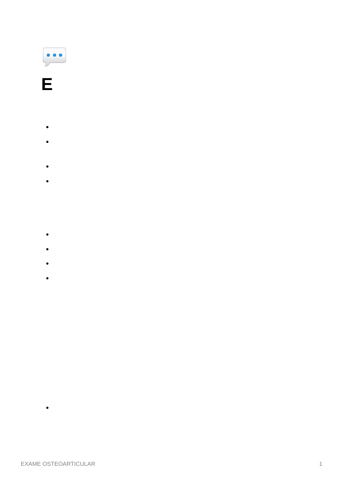 EXAME OSTEOARTICULAR 1 💬 EXAME OSTEOARTICULAR Algumas alterações com a idade: Perda de altura (parece que os membros são mais longos) Cifose (pescoço pra frente) →deixa parecer que tem a caixa torácica com o diâmetro ântero-posterior aumentado Diminuição do volume e da força muscular Perda de amplitude dos movimentos. Relação coma a idade, lembrando as faixas etárias que ocorrem com mais frequência os vários tipos de doença reumática: Febre reumática→ 5 a 15 anos Doença reumatoide → 20 a 40 anos Lúpus erimatoso sistêmico → 20 e 40 anos Gota → + de 50 anos →Não se deve esquecer, contudo, que algumas doenças reumáticas não apresentam preferência quanto ao sexo, como é o caso da moléstia reumática, das artroses em geral e da lombociatalgia. → HDA: atenção paara o modo de ínicio, a presença de sinais e sintomas inflamatórios, nos processos reumáticos em atividade, crepitação ou estalidos nos processos degenerativos. ↳Explorar mais minuciosamente o sintoma dor, que pode ser aguda (gota, bursite), surda (artrose), localizada (doença reumatoide) e com irradiação para o trajeto do nervo comprometido (cervicobraquialgia ou lombociatalgia). E perguntar pela presença ou não de rigidez pós repouso. A ocorrência de manifestações sistêmicas (febre, anorexia, perda de peso, fraqueza) também precisa ser esclarecida ao se obter a história do paciente, bem como os tratamentos realizados, a evolução, o comprometimento extra- articular, os antecedentes pessoais e EXAME OSTEOARTICULAR 2 familiares, dos quais são obtidas informações de grande utilidade na elaboração do diagnóstico. Anamnese: Dor nas costas: Essa dor é na linha média? (localização) Essa dor irradia? (se tiver procurar sintomas neurológicos) Dor articular É uma dor localizada ou disseminada? Qual o padrão dessa dor? (simétrica ou migratória?) Tem sinais flogísticos? (edema, rubor, calor) Aguda ou crônica? Atividades da vida diária Dor ao caminhar? Tem alguma limitação no seu trabalho? Consegue subir escadas? Consegue carregar peso? Exame físico: Inspeção, palpação e movimentação. Em alguns casos a ausculta. Atenção→ verificar se a estrutura e função estão preservadas, se tem simetria, palpar marcos anatômicos (tem crepitações?), verificar amplitude de movimento, força muscular, se tem uma dor secundária a um traumatismo. Inspeção: Além de se posicionar o paciente de modo confortável, é indispensável boa iluminação. O examinador sempre deve comparar articulações homólogas. Isso lhe permite reconhecer aumento de volume, rubor, atrofia, desalinhamento articular, deformidades, fístulas, tumores, mesmo quando de pequena monta. EXAME OSTEOARTICULAR 3 Análise postural e de marcha. Palpação: Palpação, pode -se verificar a causa do aumento do volume articular, a presença de pontos dolorosos no nível da interlinha articular e, em outras áreas, nódulos, calcificações, derrame intra -articular, aumento da temperatura cutânea local (para isso, utiliza- se o dorso da mão, iniciando o exame de uma região próxima à articulação). A presença de calor é seguro sinal de inflamação. Ainda pela palpação é possível caracterizar crepitações (finas ou grossas) que denotam comprometimento das superfícies articulares (cartilagem articular). ↳Nesses dois exames em conjunto são analisados: pele e anexos, tecido celular subcutâneo, musculatura, rede vascular, sistema nervoso, estruturas osteoarticulares, forma e tamanho dos segmentos e pontos de dor. OSSOS: Presença de crepitação pode sugerir fratura ou osteoartrose; Presença de sinais inflamatórios corresponde a osteomielite. Fístula indica um processo infeccioso crônico. COLUNA VERTEBRAL: Com o paciente ereto você vai observar o perfil da coluna vertebral, pedir ao paciente para se flexionar para frente com os joelhos estendidos. Completando com movimentos de flexão, extensão, rotação e lateralidade. Palpação: nas apófises espinhosas (observar dor), observar o alinhamento, e ver a musculatura paravertebral. ARTICULAÇÕES: EXAME OSTEOARTICULAR 4 Ombro →inspeção, palpação (no local da dor), amplitude dos movimentos (todos os movimentos, consegue vencer a resistência?). Movimentos: circundação, abdução e adução, rotação interna e externa. Cotovelo → inspeção, palpação e amplitude dos movimentos (flexão, extensão, supinação e pronação). Mãos e punhos → fazer a extensão, rotação, palpar as áreas interfalangianas. Teste de tínel: percutir e ver se em alguma região da choque, ou dormência (parestesias). Teste de Phalen: mãos comprimidas (1minuto). QUADRIL: EXAME OSTEOARTICULAR 5 Joelho e pernas: Na inspeção (marcha e edema), palpação (hipersensibilidade e crepitação). Manobras para observar a amplitude de movimentos (naturais e ligamentos) Tornozelo e pé: Inspeção, palpação ( articulações, tendão de Aquiles e calcanhar) EXAME OSTEOARTICULAR 6