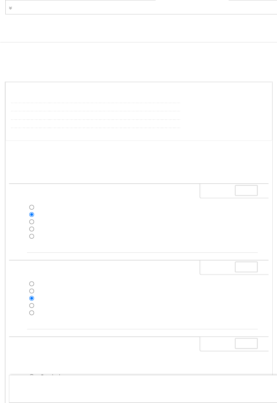 Fazer teste: QUESTIONÁRIO UNIDADE III TREINAMENTO E DESENVOLVIMENTO 3050-60_57008_R_E1_20212 CONTEÚDO Informações do teste Descrição Instruções Várias tentativas Este teste permite 3 tentativas. Esta é a tentativa número 1. Término e envio Este teste pode ser salvo e retomado posteriormente. Suas respostas foram salvas automaticamente. a. b. c. d. e. PERGUNTA 1 A atitude consiste em: O que as pessoas precisam saber. Capacidade de fazer acontecer. O que as pessoas precisam saber fazer. Quanto essa pessoa pode se desenvolver. Todas as alternativas anteriores estão corretas. 0,25 pontos Salva a. b. c. d. e. PERGUNTA 2 A habilidade consiste em: O que as pessoas precisam saber. Capacidade de fazer acontecer. O que as pessoas precisam saber fazer. Quanto essa pessoa pode se desenvolver. Todas as alternativas anteriores estão corretas. 0,25 pontos Salva a. b. c. d. PERGUNTA 3 Ao mantermos audiência em uma posição de conforto e tranquilidade, pois não serão confrontadas e nem terão de se expor por meio de manifestações e debates a respeito dos assuntos discutidos, estamos diante do método/técnica de treinamento: Estudo de caso. Seminário. Aula expositiva. Simulação. 0,25 pontos Salva ? Estado de Conclusão da Pergunta: CONTEÚDOS ACADÊMICOS BIBLIOTECAS MURAL DO ALUNO TUTORIAIS Clique em Salvar e Enviar para salvar e enviar. Clique em Salvar todas as respostas para salvar todas as respostas. UNIP EAD http://company.blackboard.com/ https://ava.ead.unip.br/webapps/blackboard/execute/courseMain?course_id=_166760_1 https://ava.ead.unip.br/webapps/blackboard/content/listContent.jsp?course_id=_166760_1&content_id=_2116854_1&mode=reset https://ava.ead.unip.br/webapps/portal/execute/tabs/tabAction?tab_tab_group_id=_25_1 https://ava.ead.unip.br/webapps/portal/execute/tabs/tabAction?tab_tab_group_id=_27_1 https://ava.ead.unip.br/webapps/portal/execute/tabs/tabAction?tab_tab_group_id=_47_1 https://ava.ead.unip.br/webapps/portal/execute/tabs/tabAction?tab_tab_group_id=_29_1 https://ava.ead.unip.br/webapps/portal/execute/tabs/tabAction?tab_tab_group_id=_10_1 https://ava.ead.unip.br/webapps/login/?action=logout e. Todas as alternativas anteriores estão corretas. a. b. c. d. e. PERGUNTA 4 As habilidades que devem ser desenvolvidas pelos ocupantes de cada cargo da organização são distribuídas em três importantes categorias, entre elas encontram-se: Para obtenção de resultados. Para interação pessoal. Para o processo de qualidade. A alternativa “b” é a única incorreta. As alternativas “a”, “b” e “c” estão corretas. 0,25 pontos Salva a. b. c. d. e. PERGUNTA 5 O conhecimento consiste em: O que as pessoas precisam saber. Capacidade de fazer acontecer. O que as pessoas precisam saber fazer. Quanto essa pessoa pode se desenvolver. Todas as alternativas anteriores estão corretas. 0,25 pontos Salva a. b. c. d. e. PERGUNTA 6 O talento consiste em: O que as pessoas precisam saber. Capacidade de fazer acontecer. O que as pessoas precisam saber fazer. O quanto a pessoa pode se desenvolver. Todas as alternativas anteriores estão corretas. 0,25 pontos Salva a. b. c. d. e. PERGUNTA 7 Os principais resultados de um programa de treinamento é a mudança de atitude, conhecimento e habilidade do treinando. Tudo isso será observado através da mudança do seu comportamento. Por comportamento entende-se: O que as pessoas precisam saber. Capacidade de fazer acontecer. O que as pessoas precisam saber fazer. A maneira de se portar da pessoa. Todas as alternativas anteriores estão corretas. 0,25 pontos Salva a. b PERGUNTA 8 Quando se exige dos participantes uma atuação, em grupo ou individual, de forma envolvente, lúdica e de espectro superior, comparados a outros métodos de ensino, estamos diante do método/técnica de treinamento: Estudo de caso. 0,25 pontos Salva Estado de Conclusão da Pergunta: Clique em Salvar e Enviar para salvar e enviar. Clique em Salvar todas as respostas para salvar todas as respostas. b. c. d. e. Seminário. Aula expositiva. Simulação. Todas as alternativas anteriores estão corretas. a. b. c. d. e. PERGUNTA 9 Quando se pretende estudar acontecimentos e contextos muito complexos, para tentar extrair a compreensão, exploração de conhecimentos diversos ou especí�cos dessas situações, adota-se como método/técnica de treinamento: Estudo de caso. Seminário. Aula expositiva. Simulação. Todas as alternativas anteriores estão corretas. 0,25 pontos Salva a. b. c. d. e. PERGUNTA 10 Técnicas de treinamento mistas transmitem informação e procuram mudar atitudes e comportamentos. São utilizadas não só para transmitir conhecimentos ou conteúdo, mas para alcançar objetivos estabelecidos para as técnicas orientadas para o processo. Entre os métodos de treinamento estudados, encontram-se: Seminários, simulações e jogos. Pesquisa, ensino e aprendizagem. Treinamento, educação e instrução. Exposição, re�exão e indução. Todas as alternativas anteriores estão corretas. 0,25 pontos Salva Estado de Conclusão da Pergunta: Clique em Salvar e Enviar para salvar e enviar. Clique em Salvar todas as respostas para salvar todas as respostas.