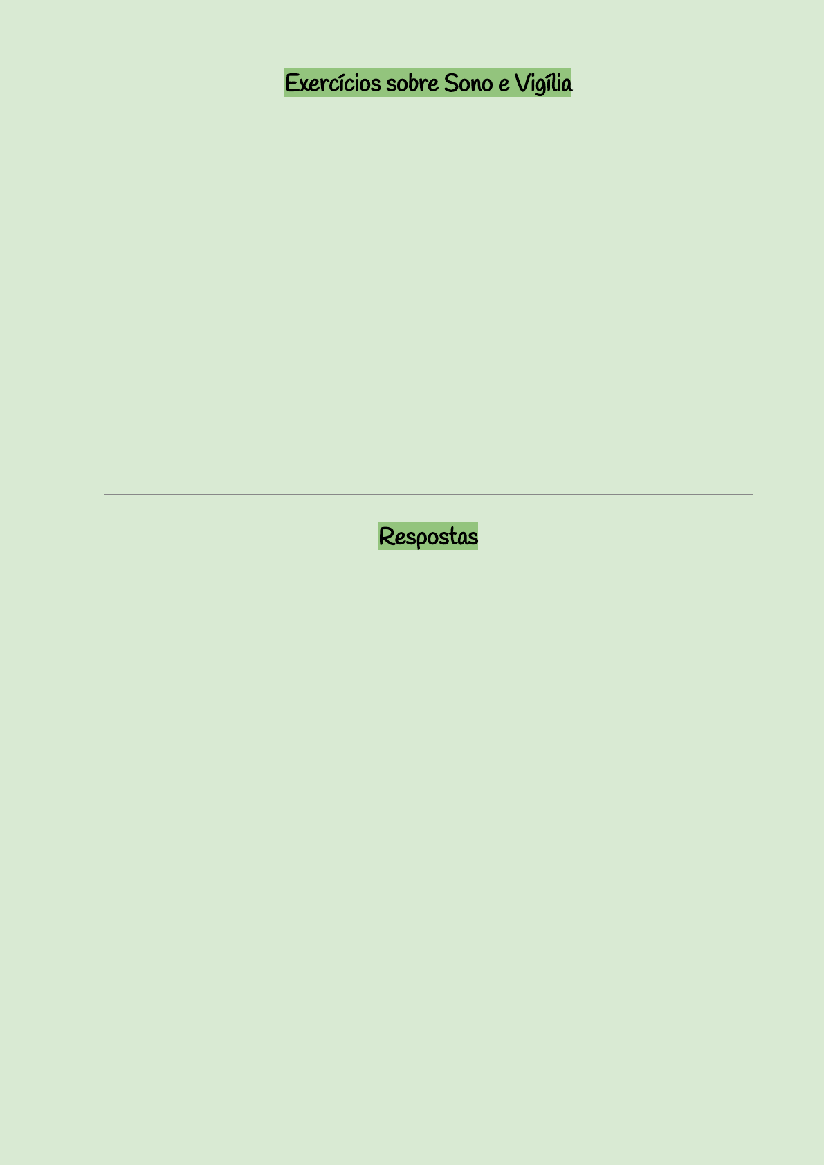 Exercícios sobre Sono e Vigília (respostas no final) 1. Defina o que é o sono. 2. Quais são as duas fases do sono? 3. Quais são as características do sono não-REM? 4. Quais são as características do sono REM? 5. Explique a frase que caracteriza o sono REM como “um encéfalo ativo e alucinado em um corpo paralisado”. 6. Explique de forma simples o ciclo do sono. Respostas 1. R= O sono é um estado de reduzida responsividade do corpo e baixa interação com o ambiente, facilmente reversível. 2. R= As fases do sono são o Sono Não-REM e o Sono REM. 3. R= O sono não-REM parece ter uma função de repouso, a tensão muscular é reduzida e os movimentos tornam-se mínimos, assim como a temperatura e metabolismo do corpo são reduzidos. Há um aumento na atividade parassimpática (diminuição da frequência cardíaca, da respiração e funções renais; aumento da atividade digestiva). Raramente se sonha ou o sonho é vago. 4. R= É o sono dos sonhos; tem alto consumo de oxigênio e alto gasto energético; perda quase total do tônus muscular esquelético (atonia); a maior parte do corpo não se move, exceto os olhos, a respiração e o coração. REM é caracterizado pelo Movimento Rápido dos Olhos (sigla em inglês). 5. R= O corpo fica imóvel ou com pouquíssimos movimentos, “paralisado” e em contraste a atividade cerebral é intensa, “alucinada”. 6. R= Durante uma noite de sono normal passamos pelos 4 estágios do sono não-REM e depois pelo REM, voltando em seguida pelos estágios não-REM,. No primeiro estágio do sono é um sono transicional: os olhos fazem movimentos de rotação lentos, dura poucos minutos e é leve. No segundo, o sono é levemente mais profundo, dura de 5 a 15 min, o movimento dos olhos quase cessam; em seguida, a terceira fase, o movimento dos olhos e do corpo já são praticamente ausentes; no estágio quatro, o sono é profundo. 1. Interim entre consciência e sono → (após 5 ou 15 min a próxima etapa) 2. batimento cardíaco diminui, cérebro executa atividades menos complicadas → (após 15 min passa para o sono não REM) 3. restauro do corpo 4. temperatura e pressão sanguínea diminuem → (após 90 min passa para o sono REM) 5. movimento dos olhos, batimentos cardíacos, respiração, pressão sanguínea e temperatura aumentam. por Maria Teresa S. C. Cornélio graduanda em Psicologia setembro de 2021
