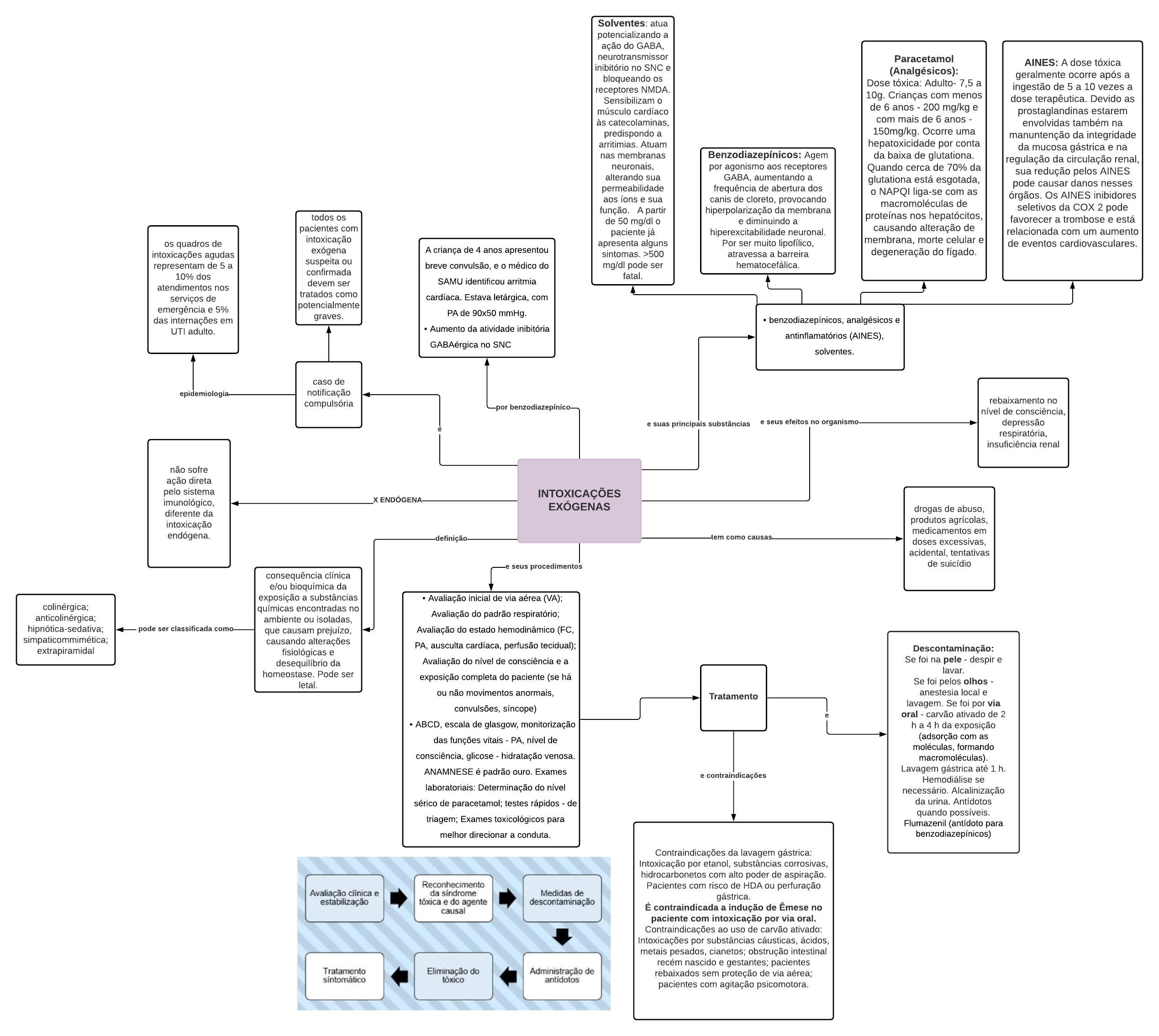 INTOXICAÇÕES EXÓGENAS X ENDÓGENA não sofre ação direta pelo sistema imunológico, diferente da intoxicação endógena. por benzodiazepínico A criança de 4 anos apresentou breve convulsão, e o médico do SAMU identificou arritmia cardíaca. Estava letárgica, com PA de 90x50 mmHg. - Aumento da atividade inibitória GABAérgica no SNC e seus procedimentos - Avaliação inicial de via aérea (VA); Avaliação do padrão respiratório; Avaliação do estado hemodinâmico (FC, PA, ausculta cardíaca, perfusão tecidual); Avaliação do nível de consciência e a exposição completa do paciente (se há ou não movimentos anormais, convulsões, síncope) - ABCD, escala de glasgow, monitorização das funções vitais - PA, nível de consciência, glicose - hidratação venosa. ANAMNESE é padrão ouro. Exames laboratoriais: Determinação do nível sérico de paracetamol; testes rápidos - de triagem; Exames toxicológicos para melhor direcionar a conduta. e suas principais substâncias - benzodiazepínicos, analgésicos e antinflamatórios (AINES), solventes. e seus efeitos no organismo rebaixamento no nível de consciência, depressão respiratória, insuficiência renal Tratamento é caso de notificação compulsória definição consequência clínica e/ou bioquímica da exposição a substâncias químicas encontradas no ambiente ou isoladas, que causam prejuízo, causando alterações fisiológicas e desequilíbrio da homeostase. Pode ser letal. epidemiologia os quadros de intoxicações agudas representam de 5 a 10% dos atendimentos nos serviços de emergência e 5% das internações em UTI adulto. pode ser classificada como colinérgica; anticolinérgica; hipnótica-sedativa; simpaticommimética; extrapiramidal todos os pacientes com intoxicação exógena suspeita ou confirmada devem ser tratados como potencialmente graves. tem como causas drogas de abuso, produtos agrícolas, medicamentos em doses excessivas, acidental, tentativas de suicídio Solventes: atua potencializando a ação do GABA, neurotransmissor inibitório no SNC e bloqueando os receptores NMDA. Sensibilizam o músculo cardíaco às catecolaminas, predispondo a arritimias. Atuam nas membranas neuronais, alterando sua permeabilidade aos íons e sua função. A partir de 50 mg/dl o paciente já apresenta alguns sintomas. >500 mg/dl pode ser fatal. Benzodiazepínicos: Agem por agonismo aos receptores GABA, aumentando a frequência de abertura dos canis de cloreto, provocando hiperpolarização da membrana e diminuindo a hiperexcitabilidade neuronal. Por ser muito lipofílico, atravessa a barreira hematocefálica. Paracetamol (Analgésicos): Dose tóxica: Adulto- 7,5 a 10g. Crianças com menos de 6 anos - 200 mg/kg e com mais de 6 anos - 150mg/kg. Ocorre uma hepatoxicidade por conta da baixa de glutationa. Quando cerca de 70% da glutationa está esgotada, o NAPQI liga-se com as macromoléculas de proteínas nos hepatócitos, causando alteração de membrana, morte celular e degeneração do fígado. AINES: A dose tóxica geralmente ocorre após a ingestão de 5 a 10 vezes a dose terapêutica. Devido as prostaglandinas estarem envolvidas também na manuntenção da integridade da mucosa gástrica e na regulação da circulação renal, sua redução pelos AINES pode causar danos nesses órgãos. Os AINES inibidores seletivos da COX 2 pode favorecer a trombose e está relacionada com um aumento de eventos cardiovasculares. Descontaminação: Se foi na pele - despir e lavar. Se foi pelos olhos - anestesia local e lavagem. Se foi por via oral - carvão ativado de 2 h a 4 h da exposição (adsorção com as moléculas, formando macromoléculas). Lavagem gástrica até 1 h. Hemodiálise se necessário. Alcalinização da urina. Antídotos quando possíveis. Flumazenil (antídoto para benzodiazepínicos) e e contraindicações Contraindicações da lavagem gástrica: Intoxicação por etanol, substâncias corrosivas, hidrocarbonetos com alto poder de aspiração. Pacientes com risco de HDA ou perfuração gástrica. É contraindicada a indução de Êmese no paciente com intoxicação por via oral. Contraindicações ao uso de carvão ativado: Intoxicações por substâncias cáusticas, ácidos, metais pesados, cianetos; obstrução intestinal recém nascido e gestantes; pacientes rebaixados sem proteção de via aérea; pacientes com agitação psicomotora. Intoxicações exógenas Página 1