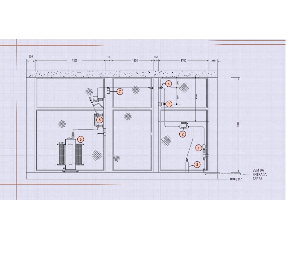 Para este Desafio, considere que seu superior lhe enviou o desenho da subestação consumidora que será construída na empresa. Ele solicitou que você criasse a lista dos materiais destacados no projeto. Observe, a seguir, o projeto enviado para análise. Você, de posse do desenho, deve identificar os equipamentos numerados e criar uma lista com os nomes para o setor de compras da empresa. Resposta: 1- Mufla unipolar interna: 15kv 2-Transformador de corrente:15/5 A 3-Transformador de potencial:70:1 4-Bucha de passagem,uso interno:15kv 5-Chave seccionadora de comando simultâneo:15kv-200A 6-Transformador trifásico óleo 225kva-13,8/0,22-0,127kv. 7-Isolador de pedestal:15kv,uso interno