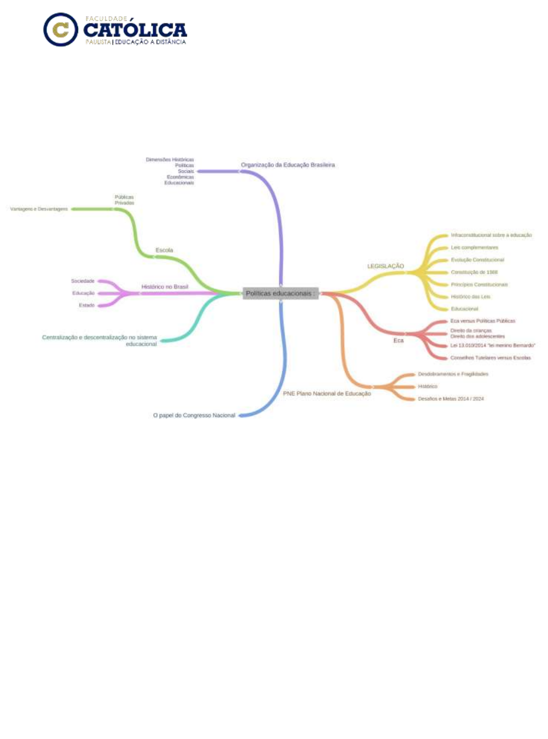 HISTÓRIA Formação: LICENCIATURA Políticas Educacionais/2021 Mapa Mental Comentado Comentário: A cerca do Histórico das políticas educacionais do Brasil, houve a compreensão de sua origem como processo de socialização, introduzida aos princípios de centralização e descentralização das mesmas. Em um segundo momento foram absorvidos os diplomas legais a que se referem a Educação Brasileira (Constituição Brasileira de 1988 mostrando o que está segurado e garantido por lei e Lei de Diretrizes e Bases da Educação – LDB o histórico e implantação da mesma). A origem, concepção e realidade na pratica e incorporação as 20 metas do Plano Nacional de Educação – PNE. Foram abordados o discorrer e fragilidade da PNE e o que poderá ser melhorado no decênio em que ela está implantada. Por fim desvendamos o estatuto da Criança e do Adolescente – ECA, alguma lei mais importante como a apelidada Menino Bernardo foi abordada e a relação entre as Escolas e Conselho tutelares. Adriana Maia do Nascimento. ID.2634 Período Letivo 202132