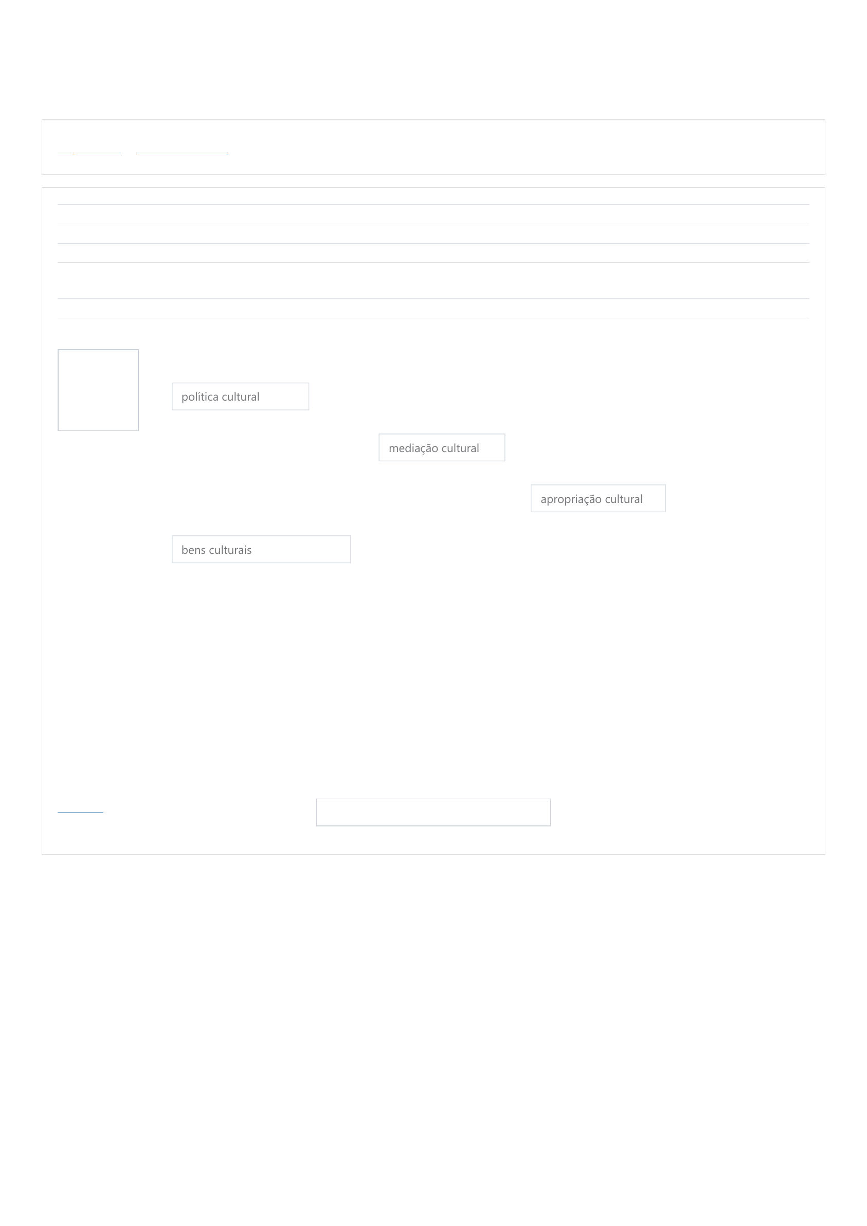 07/09/2021 20:48 Questão Discursiva https://ava.unisanta.br/mod/quiz/review.php?attempt=1512803&cmid=165301 1/2 Página inicial / Questão Discursiva Questão 1 Correto Atingiu 1,00 de 1,00 Iniciado em terça, 7 set 2021, 20:44 Estado Finalizada Concluída em terça, 7 set 2021, 20:47 Tempo empregado 3 minutos 22 segundos Notas 1,00/1,00 Avaliar 10,00 de um máximo de 10,00(100%) Os projetos sociais e educacionais que podem ser implementados em espaços de leitura, vinculam-se à vigente no país, sendo desenvolvidos por meio de financiamento público ou parcerias entre instituições privadas e públicas ou, ainda por meio de iniciativas de instituições privadas. Tais projetos se realizam através de uma ação educativa planejada e definida como que visa assegurar o acesso aos bens culturais à população, mas visa também promover, por meio dessas ações, a cidadania cultural, bem como a possibilidade de diferentes grupos e indivíduos da sociedade acessarem repertórios diferenciados via . Desse modo, diferentes propostas de mediações culturais são desenvolvidas em espaços de leitura, realizando o acesso aos para a população, muitas vezes, vulnerável de nossa sociedade. política cultural mediação cultural apropriação cultural bens culturais Sua resposta está correta. A resposta correta é: Os projetos sociais e educacionais que podem ser implementados em espaços de leitura, vinculam-se à [política cultural] vigente no país, sendo desenvolvidos por meio de financiamento público ou parcerias entre instituições privadas e públicas ou, ainda por meio de iniciativas de instituições privadas. Tais projetos se realizam através de uma ação educativa planejada e definida como [mediação cultural] que visa assegurar o acesso aos bens culturais à população, mas visa também promover, por meio dessas ações, a cidadania cultural, bem como a possibilidade de diferentes grupos e indivíduos da sociedade acessarem repertórios diferenciados via [apropriação cultural] . Desse modo, diferentes propostas de mediações culturais são desenvolvidas em espaços de leitura, realizando o acesso aos [bens culturais] para a população, muitas vezes, vulnerável de nossa sociedade. ◄ Teste 2 Seguir para... https://ava.unisanta.br/ https://ava.unisanta.br/mod/quiz/view.php?id=165301 https://ava.unisanta.br/mod/quiz/view.php?id=165238&forceview=1 07/09/2021 20:48 Questão Discursiva https://ava.unisanta.br/mod/quiz/review.php?attempt=1512803&cmid=165301 2/2