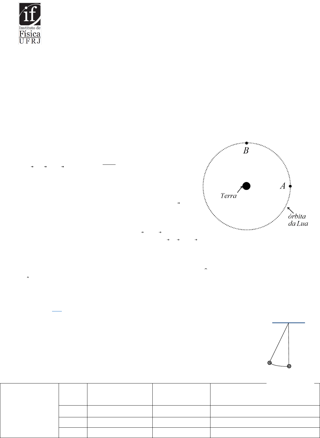 Universidade Federal do Rio de Janeiro | Instituto de Física Tópicos de Física Geral II e Apoio Pedagógico prof as Daniela e Marta 2021.1 Atividade 4 - Parte A – Leis de Newton (cont.) Esta atividade deve ser iniciada no momento síncrono da aula e discutida em grupo. Cada integrante do grupo deve entregar seu respectivo desenvolvimento ao monitor do seu grupo no dia combinado. Apenas a pergunta do relator deve ter uma única resposta para todo o grupo. Informe ao seu monitor quem será o relator do seu grupo nesta semana. Questão 1. (RELATOR) A figura a seguir representa o movimento de translação da Lua ao redor da Terra, do ponto de vista de um referencial fixo ao centro da Terra. A trajetória da Lua é, em boa aproximação, circular, e o módulo de sua velocidade é praticamente constante. Na figura, a Lua move-se em sentido anti-horário, e estão representadas duas posições da Lua com uma diferença de tempo de cerca de 7 dias (de A para B). a) Represente na figura os vetores velocidade (instantânea) da Lua em A, Av ! , e em B, Bv ! . b) Esboce qualitativamente o vetor variação de velocidade ∆𝑣 = 𝑣! − 𝑣! da Lua para este intervalo de tempo. De que forma esse vetor se relaciona com o vetor aceleração média da Lua neste período? Quais são suas características (direção e sentido)? c) Represente na figura um ponto C situado entre A e B. Represente também seu vetor velocidade instantânea 𝑣! . Imagine que o ponto C se aproxime do ponto A indefinidamente, até que se possa coloca-los tão próximos quanto se queira. No limite quando C se confundir com A, qual será o valor do ângulo limite entre ∆𝑣!" e 𝑣!? (Para ajudar a visualização, represente somente os vetores 𝑣!, 𝑣! e ∆𝑣!" deslocados paralelamente de forma tal que partam de um mesmo ponto comum.) d) Tendo em vista a discussão anterior, a que conclusão você chega acerca das características (direção e sentido) do vetor aceleração instantânea no ponto A? (Neste caso seria muito mais conveniente analisar os vetores em função de suas componentes tangencial (na direção do vetor unitário 𝜃) e radial (na direção do vetor unitário 𝑟), conhecidas como coordenadas polares.) Utilize a notação de coordenadas polares para facilitar a descrição. e) Finalmente, represente o vetor força resultante sobre a Lua no ponto A a partir da discussão anterior. Que interação essa força representa? Sobre que corpo atua a reação a esta força? f) Acesse o link e verifique suas respostas. Questão 2. Considere um objeto preso por um fio (ideal) a um teto, e dois pontos A e B do movimento deste objeto. a) Isole o objeto nas duas posições, e preencha o quadro abaixo para elaborar o diagrama de forças sobre o objeto no ponto A e no ponto B. No ponto A: figura (indicando as forças) Corpo Interação (tipo e par) Símbolo para a força usado no diagrama A reação a esta força: sobre qual objeto está aplicada, e qual o símbolo usado? A B No ponto B: figura (indicando as forças) Corpo Interação (tipo e par) Símbolo para a força usado no diagrama A reação a esta força: sobre qual objeto está aplicada, e qual o símbolo usado? b) Represente nos dois pontos os vetores velocidade e aceleração do objeto. Escreva tudo o que você sabe sobre esses vetores (em relação a seus módulos, direção e sentido). c) No ponto B, a tração tem módulo igual, maior ou menor do que o peso do objeto? Escreva a equação que expressa a tensão na corda em B em função da velocidade do corpo. Questão 3. Desenhe diagramas de corpo livre representando as forças que agem sobre o objeto, e, em cada situação apresentada, indique SEPARADAMENTE a resultante. Lembre que um corpo não está com aceleração nula quando descreve um movimento circular. Adote a seguinte nomenclatura para as forças: P = força peso; T = tensão no fio; 𝑁 = componente normal à superfície da força de contato; f!" = força de atrito (a componente paralela à superfície da força de contato). Questão 4. Considere o sistema representado na figura, conhecido como máquina de Atwood. É formada por duas massas iguais conectadas por uma corda que passa por uma polia. A corda e a polia são consideradas ideais (sem massa, e a corda é inextensível). O objeto B é inicialmente preso de forma que nenhum corpo pode se mover. a) O que acontecerá com as massas A e B assim que o sistema for solto a partir do repouso? Responda sem utilizar álgebra. b) Represente um diagrama de forças para cada bloco após serem soltos. c) Adote um sistema de coordenadas (indique-o na figura) e escreva as equações que expressam a segunda Lei de Newton para cada um dos corpos. Escreva-as tanto em sua forma vetorial quanto em função do vetor unitário de seu sistema coordenado. d) Utilizando o que você aprendeu sobre cordas ideais e as informações dadas no enunciado do problema, o que você conclui sobre o movimento dos blocos? O que você conclui sobre o módulo da força exercida pela corda sobre os blocos? Seus diagramas de corpo livre condizem com suas conclusões? Se não, ajuste-os.