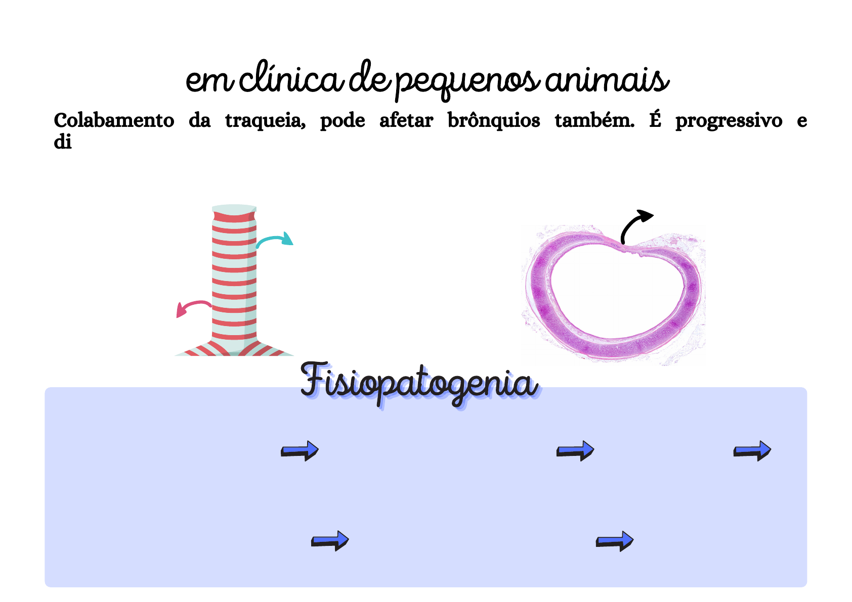 COLAPSO DE TRAQUEIAem clínica de pequenos animais FisiopatogeniaFisiopatogeniaFisiopatogenia Colabamento da traqueia, pode afetar brônquios também. É progressivo e dinâmico, ou seja, não acontece todo momento. Anel cartilaginoso (condroitina, ácido hialurônico, glicosaminoglicanos) Ligamento traqueal (cartilaginoso) Traqueia (representação) Corte transversal histológico (traqueia) Musculatura estriada esquelética dorsal Deficiência de glicosaminoglicanos e de condroitina Enfraquecimento dos aneis, ligamentos e musculatura Alta pressão durante a respiração Colabamento da traqueia ou brônquio Ativa receptores de tosse TOSSE Monyk Dias TraqueobroncomaláceaTraqueobroncomaláceaTraqueobroncomalácea Colabamento persistente NECROSE Diminuição da irrigação tecidual Monyk Dias Assinalamentos: Localização: Espécie: mais comum em cães Porte: pequeno porte Raças SPITZ ALEMÃO YORKSHIRE PUG BULLDOG Extratorácica: afeta porção cervical da traqueia, acontece na inspiração (aumento de pressão das vias superiores). Intratorácica: afeta porção torácica da traqueia e brônquios, acontece na expiração (aumento de pressão das vias inferiores) Colapso extratorácico Colapso intratorácico Inspiração Inspiração Expiração P P P P P P Fo to : L yn el le Jo hn so n Fo to : L yn el le Jo hn so n Fo to : L yn el le Jo hn so n Doenças diferencias ou concomitantes: Obesidade Hiperadrenocorticismo Aumento atrial esquerdo Infecção bacteriana Bronquite crônica Bronquite alérgica Intubação recente Prolongamento de palato mole Estenose de narina Paralisia de laringe CLASSIFICAÇÃO Mede o grau de acometimento a partir do diâmetro traqueal durante a broncoscopia. Quanto menor o diâmetro, maior o grau e mais grave o colapso. GRAU I GRAU III GRAU IV GRAU II 25% redução do lúmen 50% redução do lúmen 75% redução do lúmen 90 -100% redução do lúmen TRATAMENTO ANIMAL EM CRISE Redução do estresse: butorfanol (0,2 a 0,3 mg/kg/IM) ou acepram+morfina (utilizar com cautela: braquicefálicos são sensíveis) Oxigenioterapia Controle da temperatura ambiental MANEJO CLÍNICO Controle da temperatura ambiental Redução de peso: em pacientes obesos Trocar coleira: se o modelo utilizado tracionar o pescoço. SINTOMATOLOGIA OS SINTOMAS SÃO PROGRESSIVOS Estertores inspiratórios Dispneia inspiratória: Piora com exercícios físicos. Tosse: Sonora e seca, piora nos momentos de estresse e ansiedade. EXAME FÍSICO Traqueia sede a palpação Reflexo de tosse positivo OBESIDADE Animais obesos possuem exacerbação desses sinais, pois há acúmulo de gordura em tórax e pescoço que comprimem a traqueia e dificultam a respiração. DIAGNÓSTICO Histórico: animal pequeno, raças predispostas, tosses secas e sonoras (grasnar de ganso) que acontecem geralmente sob situações de estresse. Radiografia cervical simples: durante a inspiração ou com compressão (pode utilizar bolinha ou rolo de esparadrapo para comprimir levemente a traqueia durante o exame). Radiografia torácica simples: durante a expiração. Radiografia tangencial: possível medir diâmetro, atinge apenas região cervical. Broncoscopia: diagnóstico definitivo, utilizar apenas se não visualizou na radiografia e irá realizar cirurgia. As radiografias apresentam 20% de falso negativo, nesses casos, quando o tratamento ainda é clínico, faz-se o diagnóstico terapêutico. Monyk Dias Antitussígeno: apenas se o animal estiver em crise e infecções secundária estiverem descartadas Broncodilatador: utilizado apenas em colapsos intratorácicos, a fim de reduzir a pressão. Auxilia nas crises, enquanto o animal ainda está em protocolo de perda de peso, depois pode ser feita redução da dose ou espaçar seu uso. Enriquecimento ambiental Ansiolíticos: apenas se o enriquecimento não for suficiente, pode ser utilizado fluoxetina ou florais. Antibioticoterapia: se houver infecção secundária, pois esses pacientes estão predispostos. Em casos de crises recorrentes e tosse contínua. Glicocorticoide: se houver muita inflamação CODEÍNA 0,5mg/kg VO/TID/5 dias (possui leve efeito sedativo, reduz ansiedade) AMINOFILINA 10 mg/kg VO/TID/ 20 a 30 dias ou ANR DOXICICLINA 5-10 mg/kg VO/BID/7 dias CORTICOIDE 0,5 mg/kg VO/BID/3 dias Conscientizar que o manejo clínico não cura a doença, apenas reduz os sintomas de 80 a 90%, com o tempo o colapso irá progredir e será necessário cirurgia. MANEJO CIRÚRGICO Extended traqueal: realizado através de fluoroscopia, indicado em altos graus ou quando não há melhora com tratamento clínico. Necessita acompanhamento com radiolografia.