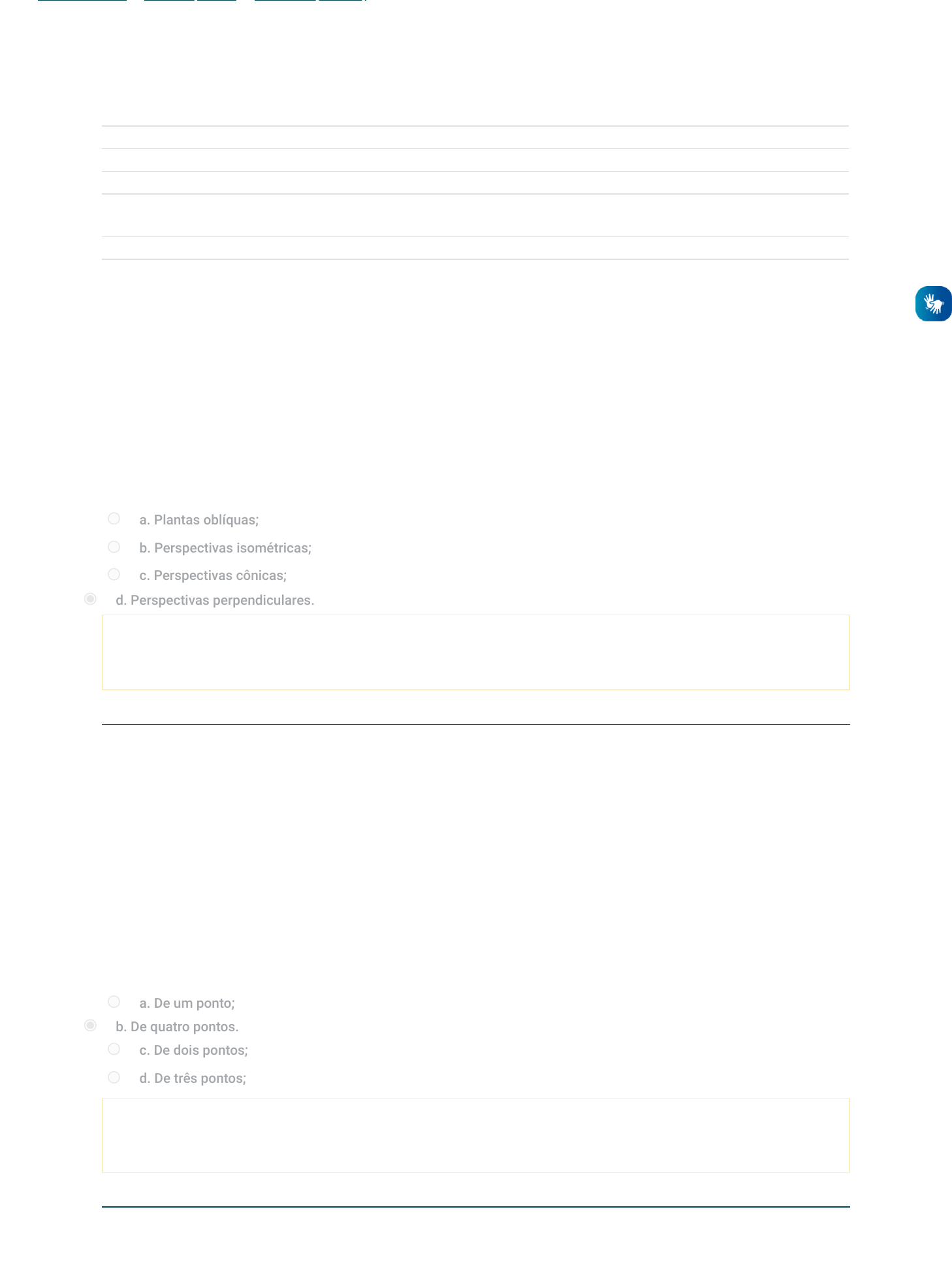 10720_E-TST04 ME / Atividades para NP1 / Questionário (unidade II) Iniciado em sábado, 31 jul 2021, 20:53 Estado Finalizada Concluída em sábado, 31 jul 2021, 21:11 Tempo empregado 18 minutos 21 segundos Avaliar 3,00 de um máximo de 3,00(100%) Comentários Excelente! Continue assim, com nota máxima! Questão 1 Correto Atingiu 0,50 de 0,50 Questão 2 Correto Atingiu 0,50 de 0,50 Os três principais tipos de perspectiva amplamente utilizados em apresentações de arquitetura são as, EXCETO: Escolha uma opção: a. Plantas oblíquas; b. Perspectivas isométricas; c. Perspectivas cônicas; d. Perspectivas perpendiculares. Sua resposta está correta. A resposta correta é: Perspectivas perpendiculares. A perspectiva mostra as coisas como nós vemos, com três dimensões, enquanto que a planta baixa e a fachada, que estudaremos a seguir, são desenhos com duas dimensões, que podem ser medidas quando conhecemos a escala do desenho. As Projeções planas podem ser divididas em cônicas e paralelas. Podemos chamar de subtipos de projeção cônicas, EXCETO: Escolha uma opção: a. De um ponto; b. De quatro pontos. c. De dois pontos; d. De três pontos; Sua resposta está correta. A resposta correta é: De quatro pontos. https://ead.uniateneu.edu.br/course/view.php?id=22693 https://ead.uniateneu.edu.br/course/view.php?id=22693#section-5 https://ead.uniateneu.edu.br/mod/quiz/view.php?id=610385 Questão 3 Correto Atingiu 0,50 de 0,50 Questão 4 Correto Atingiu 0,50 de 0,50 Questão 5 Correto Atingiu 0,50 de 0,50 A Axometria ortogonal: se dividem em três, EXCETO Escolha uma opção: a. Isométrica; b. Trimétrica. c. Dimétrica; d. Geral; Sua resposta está correta. A resposta correta é: Geral; A NBR 10126 da ABNT divide a cotagem em EXCETO: Escolha uma opção: a. Cotagem funcional. b. Cotagem de produto acabado; c. Cotagem linear; d. Cotagem auxiliar; Sua resposta está correta. A resposta correta é: Cotagem linear; O lugar onde você está é ______________ e corresponde ao olho do observador. Assinale a alternativa que assinale corretamente a lacuna: Escolha uma opção: a. Ponto de fuga; b. Esboço. c. Ponto de vista. d. Distorção; Sua resposta está correta. A resposta correta é: Ponto de vista. Questão 6 Correto Atingiu 0,50 de 0,50 A perspectiva mostra as coisas como nós vemos, com três dimensões, enquanto que a planta baixa e a fachada, que estudaremos a seguir, são desenhos com duas dimensões, que podem ser medidas quando conhecemos a escala do desenho. As Projeções planas podem ser divididas em cônicas e paralelas. Podemos chamar de subtipos de projeção paralelas obliquas, EXCETO: Escolha uma opção: a. Geral; b. Isométrica; c. Gabinete; d. Cavaleira. Sua resposta está correta. A resposta correta é: Isométrica; ◄ E-book da unidade Seguir para... Questionário (unidade III) ► Pesquisa de Trabalhabilidade https://ead.uniateneu.edu.br/mod/resource/view.php?id=610381&forceview=1 https://ead.uniateneu.edu.br/mod/quiz/view.php?id=610387&forceview=1 https://forms.office.com/Pages/ResponsePage.aspx?id=2WuNG0gKp0K-gpcYlGUAMIWDbi5nrJxPlFhwy63srf9URE5PMFI1M1ZCTk0wUFBWMU8xM0Q5VUg1VC4u