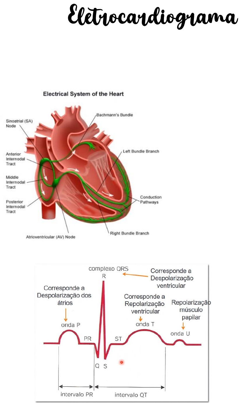 Cardiologia – FMBM Pamela Barbieri – T23 Profª Dra. Ana Paula Lebet 1 ELETROCARDIOGRAMA BÁSICO: Tópicos da aula: Atividade elétrica normal do coração, ondas do ECG normal, derivações do ECG, análise inicial do ECG: ritmo, FC, eixo cardíaco. Atividade elétrica normal do coração Nó sinusal: céls especializadas em desse despolarizar – determina o ritmo do coração. Caminha através do TERMINAR DE ESCREVER kkkk já me perdi ooo inferno REGISTRO DA ATIVIDADE ELÉTRICA: PR: pausa do nó atrioventricular. QRS: despolarização dos ventrículos Onda T: repolarização ventricular Onda U: repolarização do m. papilar pode encontrar em paciente bradicardico. Cardiologia – FMBM Pamela Barbieri – T23 Profª Dra. Ana Paula Lebet 2 PAPEL DE REGISTRO DO ECG: Se quiser registrar um número maior: pode fazer papel correr mais rápido ONDAS DO ECG NORMAL: Onda P: tem que ter no máximo 2,5mm de amplitude e durar no máximo 100milisegundos (0,1s, 2,5mm). Complexo QRS: amplitude pode variar, porque depende de cada derivação em que se observa. Mas, independentemente da variação, a duração não deve passar de 120milisegundos (3mm). Onda T: amplitude de no máximo 5mm nas derivações frontais e no máximo 10mm nas precordiais. Onda U: geralmente não se vê nos ECG normais. Despolarização do complexo QRS: representa o vetor de despolarização desse ventrículo Onda Q: despolarização septal basal do ventrículo esquerdo (do VE para o VD). Onda R: corresponde ao vetor principal de despolarização do ventrículo (de cima para baixo) Onda S: corresponde a despolarização basal lateral do ventrículo. Cardiologia – FMBM Pamela Barbieri – T23 Profª Dra. Ana Paula Lebet 3 →VARIANTES DO QRS: R’ bloqueio de ramo (2ª deflexão positiva). INTERVALOS E SEGMENTOS: Intervalo PR: início da P até o início do QRS – alterações nesse intervalo: patologias. Cardiologia – FMBM Pamela Barbieri – T23 Profª Dra. Ana Paula Lebet 4 Ponto J: ponto em que termina onda Q e começa ST. Segmento ST: tem que ser isoelétrico (mesma linha de base do PR). Intervalo QT: depende da FC (corrigido – pela fórmula). PLANOS DE ANÁLISE DO ECG: →Derivações bipolares: Planos frontais: 12 DERIVAÇÕES PRINCIPAIS (pode fazer ampliado para analisar outras derivações, se necessário). DI: avalia polo negativo do braço direito em direção ao polo positivo do braço esquerdo. DII: polo negativo do braço direito em direção ao ao polo positivo da perna esquerda. DIII: polo negativo do braço esquerdo em direção ao polo positivo da perna esquerda. →Derivações unipolares do plano frontal: Cardiologia – FMBM Pamela Barbieri – T23 Profª Dra. Ana Paula Lebet 5 Essas derivações consideram que o centro do corpo corresponde ao ‘terra’ – estímulo inicial nasce do centro do corpo e vai para onde as derivações ‘enxergam’. DERIVAÇÕES DO PLANO FRONTAL: DERIVAÇÕES PRECORDIAIS UNIPOLARES – AVALIAM O PLANO HORIZONTAL: Derivações basais precordiais do plano horizontal. Se necessário, pode traçar eletrodo amplificado – a partir de V7. Cardiologia – FMBM Pamela Barbieri – T23 Profª Dra. Ana Paula Lebet 6 V7 a V9 – avaliação da parte dorsal do coração – colocar eletrodos nas costas. V3R e VD4R – avaliação do VD. IMPORTANTE SABER ONDE COLOCAR O ELETRODO! Começando com V1 e V2: ‘olhando’ para o septo interventricular V3 e V4: parede anterior do coração. V5 e V6: parede lateral. V7 e V8: dorsal. V3R e V4R: ventrículo direito. EIXO ELÉTRICO – PLANO HORIZONTAL: Cardiologia – FMBM Pamela Barbieri – T23 Profª Dra. Ana Paula Lebet 7 ANÁLISE INCIAL DO ECG: Análise sequencial: 1) ritmo 2) FC 3) eixo cardíaco 4) onda P e intervalo PR 5) complexo QRS e intervalo QT 6) segmento ST Ritmo sinusal deve ter as 4 características: →FC deve estar entre 50bpm e 100bpm. →Onda deve P+ deve ser positiva em DI, DII e aVF: nó sinoatrial (localizado na porção anterior superior e lateral do AD) tem estímulo gerado segue para o nó atrioventricular - direção do vetor é direção do DII – positividade da onda P nessas derivações. aVF vai do centro do corpo para o pé esquerdo e esse estímulo elétrico que sai do nó sinoatrial desce estimulando o nó atrioventricular, sendo ventricular também. →Cada onda P tem que ser seguida de um QRS →Intervalo PR deve ser entre 120ms e 200ms →Frequência cardíaca: Entre 50bpm e 100bpm Velocidade de registro: 25mm/s – 1500mm em 1 min FC = 1500/RR Cardiologia – FMBM Pamela Barbieri – T23 Profª Dra. Ana Paula Lebet 8 ENTENDENDO O EIXO ELÉTRICO: VE é a câmara que tem maior massa, então ele que determina o eixo cardíaco. Cardiologia – FMBM Pamela Barbieri – T23 Profª Dra. Ana Paula Lebet 9 Eixo cardíaco: Normal: DI POSITIVO e aVF POSITIVO: Desviado a esquerda: DI POSITO e aVF negativo. Desviado a direita: DI negativo e aVF positivo. Vetor normal é de -30 a + 90. Desviado a esquerda: a partir de – 30 a -90° Desviado para a direita: aVF + e DI negativo de 190 a 90 Cardiologia – FMBM Pamela Barbieri – T23 Profª Dra. Ana Paula Lebet 10 De forma simplificada: analisar aVF e DI – para avaliar desvio de eixo. aVF e DI positivos: normal. DI ‘menos positivo’ do que aVF – infere que na rosa dos ventos o eixo está em 60°. DI negativo e aVF postivio: somatória dos vetores: cai em desvio para a direita. Cardiologia – FMBM Pamela Barbieri – T23 Profª Dra. Ana Paula Lebet 11 Onda P - despolarização dos átrios: Como o nó sinusal localiza-se na região lateral superior do átrio direito, o estímulo elétrico inicia-se no átrio direito, e logo em seguida para o átrio esquerdo. A onda P resulta da soma das forças elétricas dos dois átrios, sendo sua porção inicial correspondente ao AD e porção final ao AE. Onda P total: inicio – despolarização do AD; segunda porção – despolarização do átrio esquerdo. Duração total da onda P – no máximo 100 milisegundos