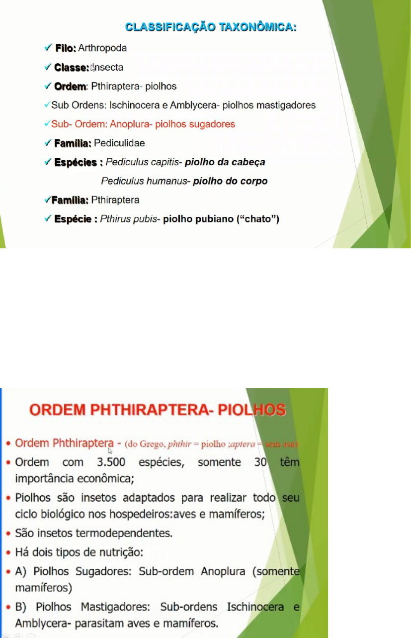 Piolhos – 08.06.21 Pediculose – doença produzida pela presença dos piolhos. A pediculose é tipicamente pruriginosa e, ao coçar, o indivíduo produz injúrias na pele que podem derivar para infecções secundárias. A presença de quantidade excessiva de piolhos pode gerar processos anêmicos, sobretudo em crianças, já que os piolhos humanos são exclusivamente hematófagos em todas as fases da vida. São insetos pequenos – variando entre 2 e 3,5 mm de comprimento. Os piolhos mastigadores podem infestar o organismo humano apenas acidentalmente – típicos de aves e mamíferos que não o ser humano. São incapazes de se desenvolver ou permanecer muito tempo no organismo humano por não estarem adaptados. Dentro os piolhos sugadores existem duas famílias: a Pediculidae e a Pthiraptera. Na família Pediculidae existem duas espécies de piolhos que são parasitos exclusivamente humanos: P. capitis (piolho da cabeça) e P. humanus (piolho do corpo também chamado muquirana). Na família Pthiraptera tem o piolho P. púbis que é um piolho de pelos pubianos, conhecido como chato. Importância econômica por acometerem também animais de produção. Piolhos são termodependentes, ou seja, só são capazes de sobreviver na faixa de temperatura dos seus hospedeiros especificamente. Não sobrevivem muito tempo ao deixar o corpo do hospedeiro, seja por não conseguirem se alimentar ou pela alteração da temperatura. Piolhos sugadores – se alimentam exclusivamente de sangue. Piolhos mastigadores – se alimentam de pele, penas e pelos e também podem se alimentar de sangue coagulado das escoriações produzidas na pele dos hospedeiros – não se instalam permanentemente e não se desenvolvem no organismo humano. Os adultos e dos jovens (ninfas) piolhos de P. humanus estão associados às vestimentas humanas. Então, um bom controle e manejo das vestimentas acaba por reduzir a população desses piolhos no organismo dos indivíduos por ele parasitados. O P. púbis é transmitido principalmente através de relações sexuais. O P. capitis encontra-se associado ao couro cabeludo e aos cabelos. Quando a cabeça do piolho é mais larga que o tórax (onde estão inseridas as pernas), ele é um piolho mastigador – Ischinocera e Amblycera. O Ischinocera (antena aparente) é chamado assim porque as antenas dele são visíveis. No Amblycera não é possível perceber a presença das antenas (ambly = escondido; cerus = antena). O Anoplura tem a cabeça mais estreita que o tórax – piolho sugador. Os piolhos tem um ciclo biológico que dura entre 3 e 4 semanas. Machos e fêmeas maduros copulam e a fêmea faz a postura de ovos nos pelos, cabelos ou vestimentas, dependendo da espécie do piolho. Os ovos dos piolhos são chamados lêndeas, que ficam aderidos às fibras das roupas, aos pelos ou aos cabelos. Desse ovo eclode a ninfa, que é um piolhinho miniatura destituído de cerdas com o corpo delicado e esbranquiçado. A ninfa se alimenta de sangue, cresce e passa por um processo de muda/ecdise (troca de exoesqueleto) e, assim, evoluindo para uma segunda ninfa. Essa segunda ninfa continua praticando hematofagia, cresce e sofre nova muda, evoluindo para ninfa 3. A ninfa 3 se alimenta, cresce e sofre a última metamorfose, dando origem ao adulto macho ou fêmea, de acordo com o sexo pré-estabelecido na lêndea. Os adultos vivem em torno de 20 a 40 dias. Ovo (lêndea) > ninfa 1 > ninfa 2 > ninfa 3 > adulto. O ciclo biológico é o mesmo para as três espécies de piolhos. Os piolhos possuem garras dotadas de duas unhas, que se prendem ao organismo ou às vestimentas do hospedeiro firmemente. Os piolhos têm o corpo achatado dorso-ventralmente, apresentam três pares de pernas com garras em cada uma das pernas. Os olhos são funcionais, mas utilizam principalmente como guia para seus hospedeiros a temperatura corporal e o CO2 exalado por eles. O aparelho bucal fica embutido na cabeça e o expõe toda vez que vai se alimentar. O ovo (lêndea) é dotado de um opérculo por onde a ninfa eclode cerca de 8 dias depois que o ovo foi posto. Ovo em desenvolvimento à esquerda e ovo com a ninfa pronta à direita. A fêmea pode ser reconhecida pelo tamanho e porque na região posterior do abdômen a última parte do corpo é bifurcada. Os machos têm a região posterior do corpo arredondada e apresentam órgão copulatório masculino. Piolhos não saltam, eles se deslocam facilmente por correntes de ar por serem leves, mas são bem adaptados para se fixarem ao organismo dos seus hospedeiros. Os piolhos não se distanciam muito do couro cabeludo porque precisam da temperatura corporal do hospedeiro para se manterem fisiologicamente funcionais e para se alimentarem de sangue. Os ovos são colocados cerca de 8mm do couro cabeludo do indivíduo para que as ninfas eclodam. Então, uma estratégia para controlar os piolhos de cabeça é cortar os cabelos com tamanho menor do que 8 mm ou raspar a cabeça. O P. humanus está associado às vestimentas e vão à pele do hospedeiro para se alimentarem de sangue. São um pouco maiores do que os piolhos de cabeça – cerca de 3,5 mm. Os insetos adultos vivem em torno de 60 dias. Os adultos do P. capitis vivem até 40 dias. Basicamente a distinção entre o P.humanus e o P. capitis é o tamanho. Fêmea portando duas lêndeas. Essas fêmeas podem colocar até 300 ovos durante a vida e faz uma postura média de 2 a 10 ovos por dia. No caso do P. capitis, a fêmea pode colocar de 100 a 200 ovos durante a vida e pode colocar de 1 a 10 ovos diariamente. Desses ovos irão eclodir as ninfas, que irão conviver com os adultos que deram origem a elas, levando a um aumento violento da infestação no organismo do hospedeiro. Meia repleta de lêndeas e adultos. As lesões produzidas pelo prurido provocado pela picada dos piolhos são estriadas e ressecadas. Esse processo pruriginoso pode abrir portas de entrada para infecções bacterianas secundárias, agravando os quadros de p