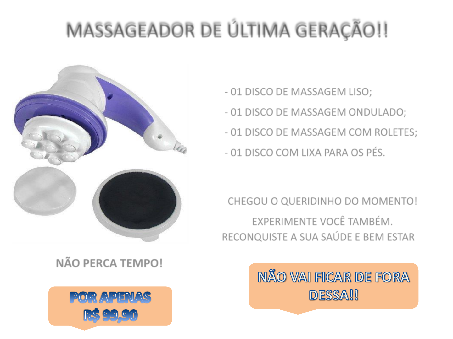 MASSAGEADOR DE ÚLTIMA GERAÇÃO!! NÃO PERCA TEMPO! - 01 DISCO DE MASSAGEM LISO; - 01 DISCO DE MASSAGEM ONDULADO; - 01 DISCO DE MASSAGEM COM ROLETES; - 01 DISCO COM LIXA PARA OS PÉS. CHEGOU O QUERIDINHO DO MOMENTO! EXPERIMENTE VOCÊ TAMBÉM. RECONQUISTE A SUA SAÚDE E BEM ESTAR!