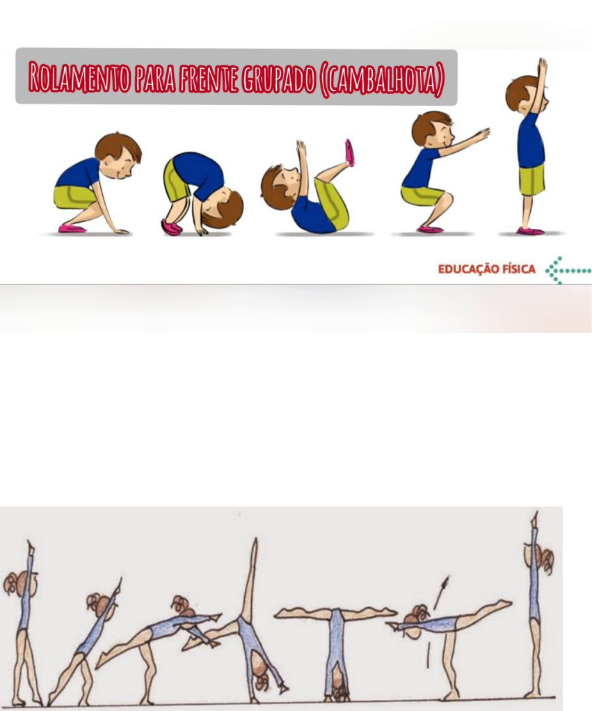 Fale seu nome e RA. Os dois movimentos que serão feitos são o rolamento pra frente grupado e a roda. Vamos começar o rolamento para frente grupado em pé. Em seguida vamos agachar com as duas pernas unidas, apoiando as mãos no chão à frente do corpo. Vamos impulsionar as pernas para rolar jogando o peso do corpo sobre as mãos. A cabeça deve ficar encolhida, possibilitando que o próximo apoio seja dos ombros e não da cabeça, que não vai encostar no chão. Após retirar o apoio das pernas do solo, vamos encolher de forma que os joelhos fiquem próximos ao peito na posição grupada. Em seguida vamos sentar e impulsionar as pernas para ficar de pé novamente. Vamos ter cuidado para deixar as mãos sempre viradas para a frente, ter forte impulsão das pernas e manter o corpo bem fechado. Agora vamos fazer a roda ou estrela. A posição inicial é em pé, em seguida damos um passo para frente e se flexiona o tronco em direção ao chão, apoiando as mãos no chão à frente do pé. Desta posição, a perna que deu o passo deve dar um impulso para cima, de forma que o quadril e as pernas serão jogados pra cima, passando pelo apoio apenas nos braços. As pernas, então, deverão retomar o apoio no chão, um pé de cada vez. Após apoiar o primeiro pé, os braços se elevam, permitindo que o corpo volte a ficar em pé. O movimento deve ser fluente, sem paradas. Pra facilitar para os alunos, podemos desenhar uma linha no chão para dar referência de espaço, que deve ser realizado com todos os apoios alinhados e seguindo para a mesma direção. Devemos ficar atentar para jogar as pernas pra cima com cuidado, apoiar as mãos no solo na mesma linha em que o movimento acontece, passar o corpo estendido durante a parada de mãos e buscar não parar durante os movimentos, fazendo de maneira fluida. A ajuda manual será baseada nos desenhos apresentados, onde o professor mostra como cada posição deve ser realizada.