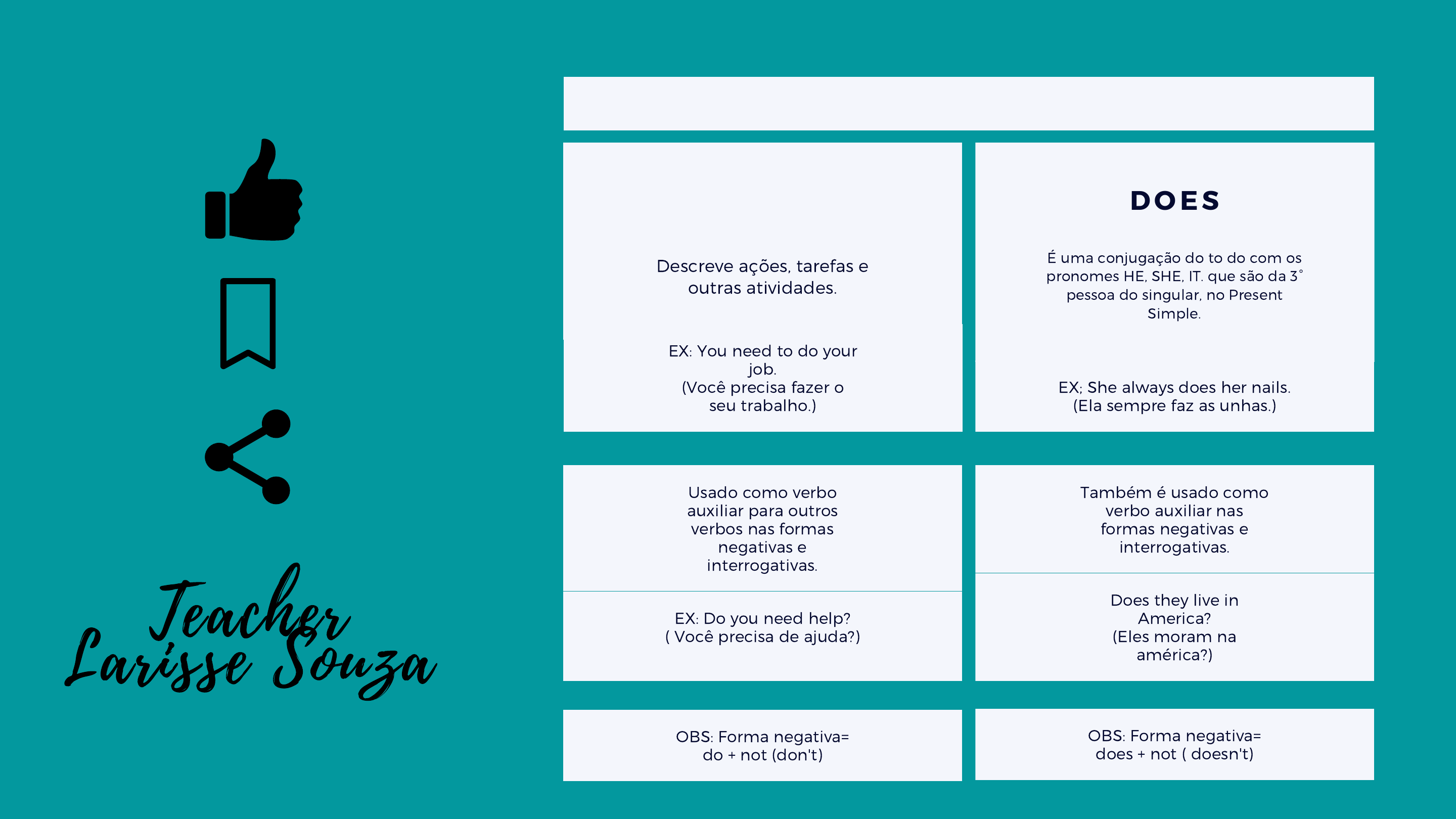 D O E D O E S D O Descreve ações, tarefas e outras atividades. Usado como verbo auxiliar para outros verbos nas formas negativas e interrogativas. EX: You need to do your job. (Você precisa fazer o seu trabalho.) OBS: Forma negativa= do + not (don't) EX: Do you need help? ( Você precisa de ajuda?) Também é usado como verbo auxiliar nas formas negativas e interrogativas. EX; She always does her nails. (Ela sempre faz as unhas.) OBS: Forma negativa= does + not ( doesn't) Does they live in America? (Eles moram na américa?) D O E S É uma conjugação do to do com os pronomes HE, SHE, IT. que são da 3° pessoa do singular, no Present Simple. Teacher Larisse Souza