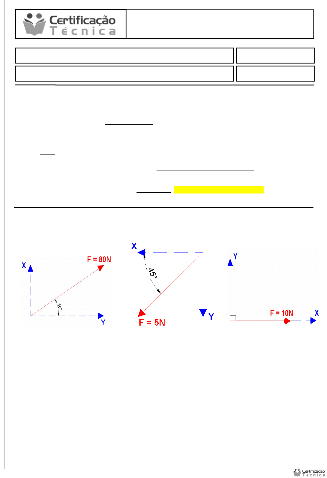 Prática em Mecânica Técnica Data: . Aluno (a): Avaliação Pratica LEIA AS INSTRUÇÕES: · Preencha os dados no Cabeçalho para sua identificação; · Esta Avaliação contém 03 (três) questões, totalizando 10 (dez) pontos; · Leia com atenção os enunciados e faça o que se pede; · As respostas podem ser feitas em uma folha à parte, em seguida inseridas neste arquivo, de forma que estejam organizadas e legíveis; · NÃO serão aceitas respostas e textos retirados da Internet, assim como imagens (desde que seja pedida). A interpretação e execução fazem parte do processo. · Ao terminar grave o arquivo com o nome A.P. Disciplina – Nome do Aluno; · Só serão aceitas as extensões .docx (M.S. Word) ou .PDF; · Envie o arquivo pelo sistema no local indicado; · Atividades enviadas “em branco”, sem cálculos, plagiadas ou repetidas de outros, terão notas ZERO. · Em caso de dúvidas consulte o seu Tutor. 1) Calcule os valores das projeções dos vetores F nos eixos X e Y, utilizando as funções seno e cosseno. A) B) C) 2) Calcule o Momento no ponto A. 3) Calcule o valor do Momento (em N.m) para as Forças em cada situação: a) No ponto A b) Valor do binário/momento no centro (A) das barras 4) Determine o momento no ponto A da viga engastada. Prática em Mecânica Técnica Prática em Mecânica Técnica