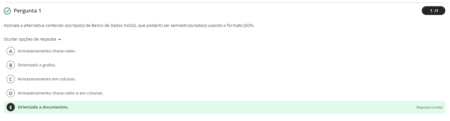 Assinale a alternativa contendo o(s) tipo(s) de Banco de Dados NoSQL que pode(m) ser semiestruturado(s) usando o formato JSON. A Armazenamento chave-valor. B Orientado a grafos. C Armazenamento em colunas. D Armazenamento chave-valor e em colunas. E Orientado a documentos.
