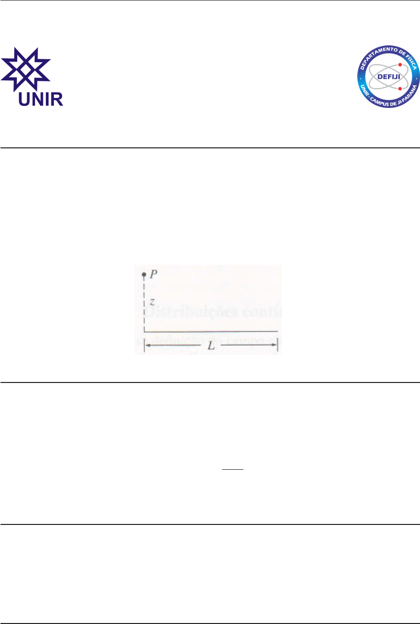 Eletromagnetismo I - 2017.2 - Lista de Problemas 1.1 1 Eletromagnetismo I Lista de Problemas 1.1 Departamento de F́ısica de Ji-Paraná Universidade Federal de Rondônia Prof. Marco Polo Questão 01 Encontre o campo elétrico a uma distância z acima de uma das extremidades de um segmento de reta L (ver figura abaixo) e que tem uma distribuição de carga uniforme, de densidade λ. Verifique se a sua fórmula é coerente com o que seria de se esperar para o caso z ≫ L. Questão 02 O potencial elétrico de uma determinada configuração é dado pela expressão V (r) = A e−λr r , onde A e λ são constantes. Encontre o campo elétrico E(r), a densidade de carga ρ(r) e a carga total Q. Questão 03 Uma esfera de raio R tem uma densidade de carga ρ(r) = kr (onde k é uma cons- tante). Encontre a energia da configuração. Verifique sua resposta calculando por duas formas diferentes. Departamento de F́ısica – UNIR Campus Ji-Paraná Eletromagnetismo I - 2017.2 - Lista de Problemas 1.1 2 Questão 04 Se o campo elétrico em uma região é dado (em coordenadas esféricas) pela expressão E(r) = Ar̂ +B sin θ cosφφ̂ r , onde A e B são constantes, qual é a densidade de carga? Questão 05 (a) Encontre o campo elétrico a uma distância z acima do ponto central entre duas cargas iguais, q, que estão separadas por uma distância d (ver figura abaixo). Veri- fique se o resultado é coerente com o que se espera quando z ≫ d. (b) Repita a parte (a), só que desta vez faça a carga do lado direito igual a −q em vez de +q. Questão 06 Encontre o campo elétrico a uma distância z acima do centro de um disco circular plano de raio R (ver figura abaixo), que tem uma densidade superficial de carga uniforme σ. O que a sua fórmula revela no limite R → ∞? Verifique também o caso z ≫ R. Departamento de F́ısica – UNIR Campus Ji-Paraná Eletromagnetismo I - 2017.2 - Lista de Problemas 1.1 3 Questão 07 Uma casca esférica oca possui densidade de carga dada por ρ = k r2 (a ≤ r ≤ b) (ver figura abaixo). Encontre o campo elétrico nas três regiões: (i) (r < a), (ii) (a < r < b), (iii) (r > b). Plote |E| em função de r para o caso b = 2a. Questão 08 Uma destas expressões é um campo eletrostático imposśıvel. Qual delas? (a) E = k [xy x̂+ 2yz ŷ + 3xz ẑ] (b) E = k [y2 x̂+ (2xy + z2) ŷ + 2yz ẑ]. Aqui, k é uma constante com as unidades adequadas. Para o campo posśıvel, en- contre o potencial usando a origem como seu ponto de referência. Verifique suas respostas calculando ∇V . Dica: você deve escolher um caminho espećıfico para a integração. Não importa qual é esse caminho, já que a resposta é independente do caminho escolhido, mas simplesmente não se pode integrar sem ter um caminho particular em mente. Questão 09 Encontre o potencial a uma distância s de um fio reto infinitamente longo que possui uma densidade linear de carga uniforme λ. Calcule o gradiente do potencial e verifique se ele fornece o campo correto. Questão 10 Uma superf́ıcie cônica (um cone de sorvete vazio) tem uma densidade de carga uniforme σ. A altura do cone é h, assim como o raio do topo. Encontre a diferença de potencial entre os pontos a (o vértice) e b (o centro do topo). Departamento de F́ısica – UNIR Campus Ji-Paraná Eletromagnetismo I - 2017.2 - Lista de Problemas 1.1 4 Respostas Questão 1 E = 1 4πǫ0 λ z [( −1 + z√ z2 + L2 ) x̂+ ( L√ z2 + L2 ) ŷ ] Questão 2 E = Ae−λr ( λ r + 1 r2 ) r̂, ρ = ǫ0A ( 4πδ3(r)− λ2e−λr/r ) , Q = 0. Questão 3 πk2R7/7ǫ0 Questão 4 ǫ0(A−B sinφ)/r2 Questão 5 (b) E = 1 4πǫ0 qd (z2 + d2/4)3/2 x̂ Questão 6 E = σ 2ǫ0 [ 1− z√ z2 +R2 ] ẑ, E = σR2 4ǫ0z2 ẑ (z ≫ R), E = σ 2ǫ0 ẑ (R → ∞). Questão 7 E = 0 (r < a) E = k(r − a) r2ǫ0 r̂ (a ≤ r ≤ b) E = k(b− a) r2ǫ0 r̂ (r > b) Questão 8 (a), V = −k(xy2 + yz2) Questão 9 V = λ 4πǫ0 lim x→∞ ln ( x+ √ x2 + s2 −x+ √ x2 + s2 ) E = −∇V = λ 2πǫ0s ŝ Questão 10 σh 2ǫ0 [ 1− ln( √ 2 + 1) ] Departamento de F́ısica – UNIR Campus Ji-Paraná