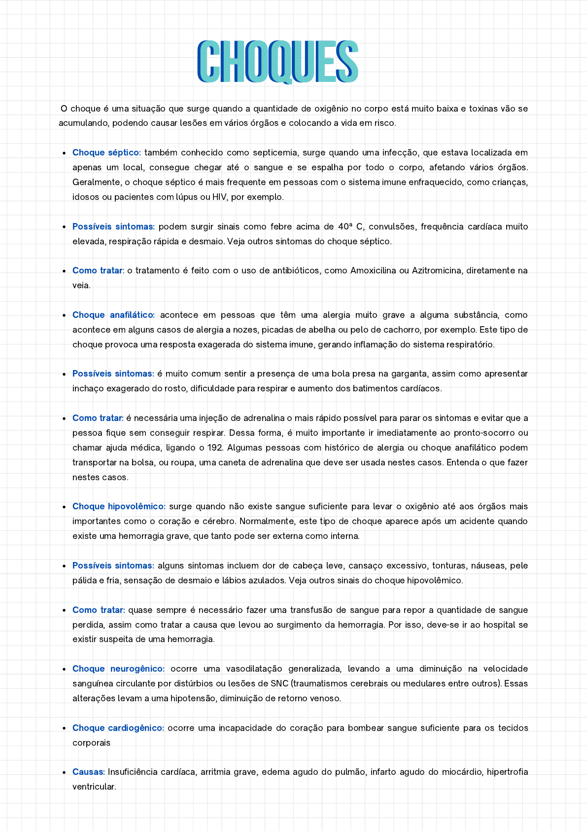 Choque séptico: também conhecido como septicemia, surge quando uma infecção, que estava localizada em apenas um local, consegue chegar até o sangue e se espalha por todo o corpo, afetando vários órgãos. Geralmente, o choque séptico é mais frequente em pessoas com o sistema imune enfraquecido, como crianças, idosos ou pacientes com lúpus ou HIV, por exemplo. Possíveis sintomas: podem surgir sinais como febre acima de 40ª C, convulsões, frequência cardíaca muito elevada, respiração rápida e desmaio. Veja outros sintomas do choque séptico. Como tratar: o tratamento é feito com o uso de antibióticos, como Amoxicilina ou Azitromicina, diretamente na veia. Choque anafilático: acontece em pessoas que têm uma alergia muito grave a alguma substância, como acontece em alguns casos de alergia a nozes, picadas de abelha ou pelo de cachorro, por exemplo. Este tipo de choque provoca uma resposta exagerada do sistema imune, gerando inflamação do sistema respiratório. Possíveis sintomas: é muito comum sentir a presença de uma bola presa na garganta, assim como apresentar inchaço exagerado do rosto, dificuldade para respirar e aumento dos batimentos cardíacos. Como tratar: é necessária uma injeção de adrenalina o mais rápido possível para parar os sintomas e evitar que a pessoa fique sem conseguir respirar. Dessa forma, é muito importante ir imediatamente ao pronto-socorro ou chamar ajuda médica, ligando o 192. Algumas pessoas com histórico de alergia ou choque anafilático podem transportar na bolsa, ou roupa, uma caneta de adrenalina que deve ser usada nestes casos. Entenda o que fazer nestes casos. Choque hipovolêmico: surge quando não existe sangue suficiente para levar o oxigênio até aos órgãos mais importantes como o coração e cérebro. Normalmente, este tipo de choque aparece após um acidente quando existe uma hemorragia grave, que tanto pode ser externa como interna. Possíveis sintomas: alguns sintomas incluem dor de cabeça leve, cansaço excessivo, tonturas, náuseas, pele pálida e fria, sensação de desmaio e lábios azulados. Veja outros sinais do choque hipovolêmico. Como tratar: quase sempre é necessário fazer uma transfusão de sangue para repor a quantidade de sangue perdida, assim como tratar a causa que levou ao surgimento da hemorragia. Por isso, deve-se ir ao hospital se existir suspeita de uma hemorragia. Choque neurogênico: ocorre uma vasodilatação generalizada, levando a uma diminuição na velocidade sanguínea circulante por distúrbios ou lesões de SNC (traumatismos cerebrais ou medulares entre outros). Essas alterações levam a uma hipotensão, diminuição de retorno venoso. Choque cardiogênico: ocorre uma incapacidade do coração para bombear sangue suficiente para os tecidos corporais Causas: Insuficiência cardíaca, arritmia grave, edema agudo do pulmão, infarto agudo do miocárdio, hipertrofia ventricular. O choque é uma situação que surge quando a quantidade de oxigênio no corpo está muito baixa e toxinas vão se acumulando, podendo causar lesões em vários órgãos e colocando a vida em risco. CHOQUESCHOQUES https://www.tuasaude.com/septicemia/ https://www.tuasaude.com/primeiros-socorros-para-choque-anafilatico/ https://www.tuasaude.com/choque-hipovolemico/