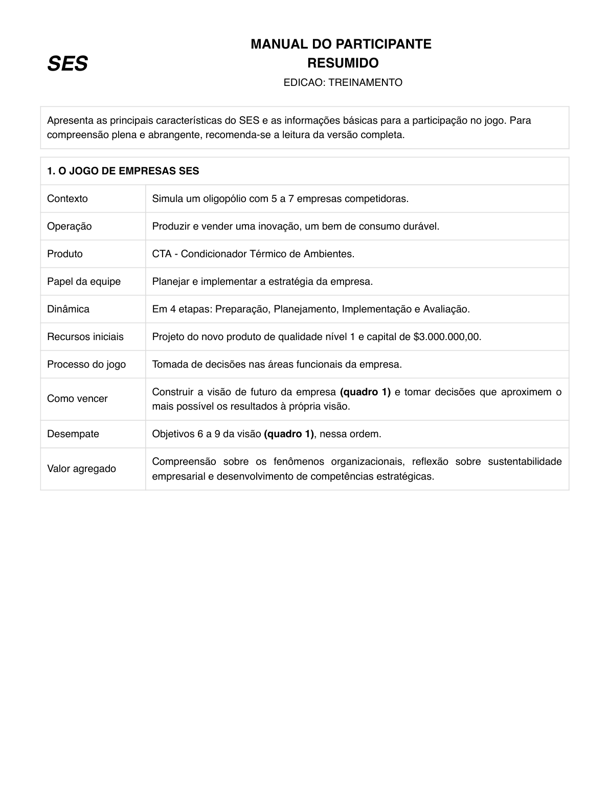 8/2/2021 SES_LDP - Manual https://ses.ldp.com.br/manual/resumido 1/6 SES MANUAL DO PARTICIPANTE RESUMIDO EDICAO: TREINAMENTO Apresenta as principais características do SES e as informações básicas para a participação no jogo. Para compreensão plena e abrangente, recomenda-se a leitura da versão completa. 1. O JOGO DE EMPRESAS SES Contexto Simula um oligopólio com 5 a 7 empresas competidoras. Operação Produzir e vender uma inovação, um bem de consumo durável. Produto CTA - Condicionador Térmico de Ambientes. Papel da equipe Planejar e implementar a estratégia da empresa. Dinâmica Em 4 etapas: Preparação, Planejamento, Implementação e Avaliação. Recursos iniciais Projeto do novo produto de qualidade nível 1 e capital de $3.000.000,00. Processo do jogo Tomada de decisões nas áreas funcionais da empresa. Como vencer Construir a visão de futuro da empresa (quadro 1) e tomar decisões que aproximem o mais possível os resultados à própria visão. Desempate Objetivos 6 a 9 da visão (quadro 1), nessa ordem. Valor agregado Compreensão sobre os fenômenos organizacionais, reflexão sobre sustentabilidade empresarial e desenvolvimento de competências estratégicas. 8/2/2021 SES_LDP - Manual https://ses.ldp.com.br/manual/resumido 2/6 2. MERCADO Global 3 grandes regiões diferentes entre si. Região 1 Menor população, maior renda per capita e 243 varejistas, com demanda média de 800 unidades por empresa e por período. Alto nível cultural e uso de tecnologia relativamente intenso. Região 2 População e renda médias, 488 varejistas e demanda média de 1.801 unidades por empresa e por período. Região 3 Maior população, menor renda e uso de tecnologia bastante incipiente. Com 625 varejistas, possui maior volume de demanda, com média de 2.064 unidades por empresa ao período. Demanda global Média de 4.665 unidades por empresa ao período. Mix de marketing Preço, propaganda, qualidade e vendedores determinam a atração da demanda. Preço A empresa quem decide, mas o valor percebido pelo mercado é de $440,00. Propaganda Investimento decidido pela empresa. Orçamento máximo por região, por período e por tipo de mídia é de 1% do faturamento potencial médio das empresas da indústria. Efeito da propaganda Efeito a médio prazo (25%, 50% e 100% para T, T+1 e T+2, respectivamente). Qualidade Inicia com nível 1. Investimentos e P&D podem resultar em avanços, chegando ao nível 6 de qualidade. Vendedores Próprios que visitam os varejistas nas regiões. Logística Custo de transporte unitário do produto varia conforme o trecho: entre R1 e R2 $20,00, entre R1 e R3 $52,00 e entre R2 e R3 $44,00. Distribuição Se houver falta, os produtos poderão ser entregues proporcionalmente aos pedidos atraídos ou segundo uma ordem de prioridade. 8/2/2021 SES_LDP - Manual https://ses.ldp.com.br/manual/resumido 3/6 3. PRODUÇÃO Fábrica Única fábrica, construída em módulos capazes de produzir 100 unidades de produtos, em uma das regiões do mercado. Capacidade Mínima de 500 unidades e máxima a critério da empresa. Quando construir As decisões sobre a localização e capacidade inicial são obrigatórias no período 1 do jogo, quando a fábrica é construída. Investimento Cada módulo de fábrica para 100 unidades custa $21.000,00. Pagamento Parcelas de 50% / 25% / 25% do investimento total em T, T+1 e T+2, respectivamente. Expansão A qualquer tempo, em módulos de 100 unidades. Lead time Programação em T / Produção em T+1 / Venda em T+2. Programação É obrigatória no período anterior à produção. Matéria prima Matéria prima básica custa $40,00 entregue em qualquer região. Consumo de MP Para 1 unidade de produto utiliza-se 3 unidades de matéria prima. Pedido de compra Pede em um período e recebe no seguinte. Fornecedor é monopólio. Pagamento Parcelas de 20% / 40% / 40% do total da compra em T, T+1 e T+2, respectivamente. Oferta normal Abundante, com maior parte oriunda do exterior. Estoques Matéria prima e produto acabado controlados pelo custo médio. Armazenagem Matéria Prima $3,00/unidade e Produto Acabado $4,85/unidade. Custo produção Custeio variável: 3 unidades de MP + 2,4 horas de MOD de operários. Custos fixos De $150.000,00 a $275.000,00 conforme a capacidade de produção. 8/2/2021 SES_LDP - Manual https://ses.ldp.com.br/manual/resumido 4/6 4. PESSOAS Pessoas Área responsável por contratação, treinamento e demissão de pessoal de produção e vendas. Contratação Todas as categorias são contratadas e treinadas em um período e trabalham no seguinte. Operários Trabalham 480h por período e, com produtividade de 100%, produzem 1 produto a cada 2,4h. Supervisores Gerenciam equipes de até 12 operários. A insuficiência de supervisores reduz a produtividade do operário em até 20%. Gastos operários Contratação $3.000,00; treinamento $700,00; demissão $5.300,00; salário $11,00/hora (horas produtivas vão p/ custo do produto, horas ociosas p/ perdas). Gastos supervisores de produção Contratação $4.700,00; treinamento $900,00; demissão $8.500,00; salário $6.500,00 ao período (tratados como outros custos fixos de produção). Demissões Por decisão da empresa ou a pedido há aviso prévio de 1 período. Pagamentos Para ambos, os gastos em um período são pagos no seguinte. Vendedores Visitam os varejistas para obter pedidos e são dimensionados pela abordagem da carga de trabalho. Visitas Estratégia mais conservadora de vendas exigem o mínimo de 2 visitas por varejista, uma mais agressiva até 6 visitas. Média de visitas Um vendedor padrão, em média, é capaz de fazer 95 visitas na região 1, 87 na região 2 e 83 na região 3. Supervisores Gerenciam até 8 vendedores a partir da sede da empresa. A insuficiência de supervisores reduz a produtividade do vendedor em até 30%. Gastos vendedor Contratação $3.500,00; treinamento $1.000,00; demissão $5.900,00; salário $4.600,00 ao período. Gastos supervisores