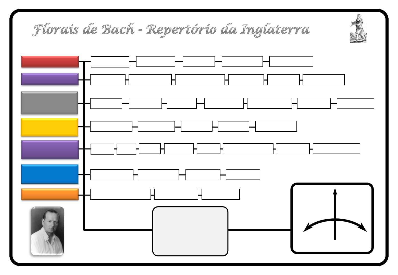 NÃO SIM + - EQUILÍBRIO Medo Aspen Cherry Plum Mimulus Indecisão Gentian Scleranthus Cerato Falta de Interesse no Presente Honeysuckle Wild Rose Olive White Chestnut Chestnut Bud Mustard Sensível as Opiniões Alheias Walnut Centaury Agrimony Preocupado com os outros Vine Vervain Chicory Red Chestnut Rock Rose Hornbean Gorse Wild Oat Clematis Holly Rock Water Beech Solidão Heather Impatiens Water Violet Desalento e Desespero Sweet Chestnut Elm Oak Willow Star of Bethlehem Pine Larch Crab Apple I T R G Práticas Naturais Testemunho I T R G Práticas Naturais Testemunho 0 1 2 3 4 5 6 7 8 9 10 + Dias e Semanas Gotas e Frequência Valorização de Testemunho