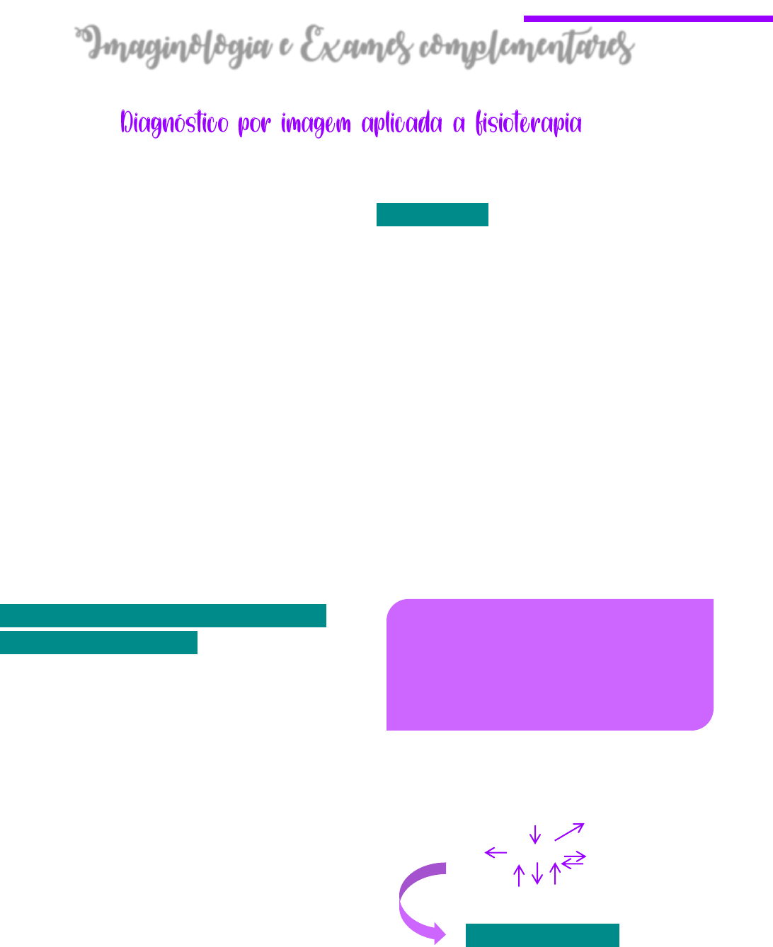 Isabella Kelly Divino @a.estudantedefisio Imaginologia e Exames complementares - Qual a importância de exames por imagem para fisioterapeutas? O nível de importância dependerá do problema/situação. Os exames servem para confirmar o diagnostico ajudar nas decisões cínicas e para observar a extensão do problema. - Tratamos as doenças encontradas? Não tratamos diagnostico médico, tratamos diagnostico cinesiofuncional (a consequência, o movimento). - Nós prescrevemos? Sim - O que é mais importante nossa avaliação ou os exames de imagem? Nossa avaliação, depois se necessário analisar os exames. Nem sempre as alterações por imagem trazem dor para o paciente Anamnese Exames físicos = + importantes Exames de imagem = complementares Custo e beneficio - Exposição à radiação - Custo dos exames - Falta de contato clínico * Efeito Nocebo: achados não compatíveis (irreais) com os sinais e sintomas (qualquer coisa está errada). - Expectativas negativas sobre a doença (efeito Nocebo). - às vezes não descobre a fonte da dor no raio-x. Modelo biomédico = nem sempre alterações nos exames significam dor - Qual o momento para solicitá-lo? - Déficits neurológicos importantes - Paciente que não respostem bem ao tratamento conservador - Febre e outros sintomas não musculoesqueléticos - Traumas Ciclo de atendimento Usuário Médico Raio-x Fisioterapia Paciente gasta muito Não há necessidade de fazer exames por imagem para dor lombar. Cerca de 2 a 3% do total de casos da dor lombar há necessidade de exames RNM Novos exames Isabella Kelly Divino @a.estudantedefisio Usuário Fisioterapia Quando o fisioterapeuta é o 1º contato, há menos gastos para o paciente e mais resultados. - Dor na lombar: (diminuição com o tempo): Depois de 2 a 3 meses solicitar exames por imagem; - Dor nas costas: por si só não é nada (se aumentar com o tempo = pode ser grave): - Dor nas pernas + dor nas costas é mais grave Analise radiográfica aplicada à fisioterapia Tipos de exames: - Por radiação (ionizante): - Radiografias - Tomografias - Densitometria (densidade óssea); - Por eletromagnetismo: - Ressonância nuclear magnética - Por ondas sonoras: -Ultrassom; Radiografia Eminencia de radiação ionizantes (partículas alfa, beta, fótons gama) no qual elas apresentam mais absorção. Radiografia = “sombras” (reflexos das imagens), ossos e articulações. *Ligamentos, cápsula articular e tecidos moles = pouca absorção da radiação = mais difícil de ver. Densidade: Absorve muita energia = absorve muita radiação; - Quanto maior a densidade = maior a opacidade = mais claro a imagem Metais pesados Contraste Osso Água Gordura Ar - Osso cortical (contorno do osso) absorve mais que osso trabeculado. - Imagens sobrepostas = mais claro Interpretação: - Imagens radiotransparentes (escuras); - Imagens radiopaca (claras) Ou - Imagens hipertransparentes (escuras) - Imagens hipotrasnparente (claras); Isabella Kelly Divino @a.estudantedefisio Por onde começar a análise: 1. Conhecimento anatômico/densidade radiográfica (quando absorve mais); 2. Incidência radiográfica (ântero- posterior (AP), póstero-anterior (PA) Incidência é o termo de posicionamento que descreve a direção ou trajetória do raio da fonte de raios-x quando atravessam o paciente, projetando uma imagem no filme. - Posições oblíquas anteriores/posteriores direita e esquerda: referem-se aquelas posições em que o aspecto posterior/anterior direito ou esquerdo é restrito ao filme e pode ser na posição ereta ou nas posições gerais de decúbito. - Incidência em AP obliqua – rotação medial - Incidência em PA obliqua – rotação lateral - Posição lateral (tórax, coluna, cotovelo): refere-se ao lado ou a vista lateral específica como a parte restrita ao filme, ou a parte do corpo onde o RC incide. - Incidência médio-lateral - Incidência látero-medial 3. Sistema ABCS O processo de análise de uma radiografia obedece ao sistema ABCS: A. Alinhamento (curvaturas fisiológicas, contorno ósseo) B. Dimensão e densidade do osso (Bone) (fratura) C. Cartilagem (espaço articulares = onde estiver vazio) S. Tecidos moles (Soft tissue): alterações do tecido mole. *Sinal do sol poente: no ombro, se não tiver luxação ou sub-luxação. Mãos e pés