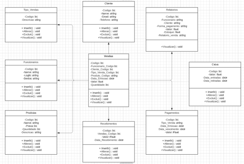 Diagrama de classe para PDV (Ponto de venda) com emissão de relatórios.