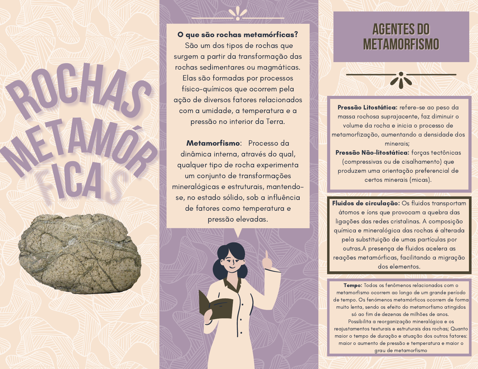 ficas Pressão Litostática: refere-se ao peso da massa rochosa suprajacente, faz diminuir o volume da rocha e inicia o processo de metamorfização, aumentando a densidade dos minerais; Pressão Não-litostática: forças tectônicas (compressivas ou de cisalhamento) que produzem uma orientação preferencial de certos minerais (micas). Fluidos de circulação: Os fluidos transportam átomos e íons que provocam a quebra das ligações das redes cristalinas. A composição química e mineralógica das rochas é alterada pela substituição de umas partículas por outras.A presença de fluidos acelera as reações metamórficas, facilitando a migração dos elementos. Rochas meta mór O que são rochas metamórficas? São um dos tipos de rochas que surgem a partir da transformação das rochas sedimentares ou magmáticas. Elas são formadas por processos físico-químicos que ocorrem pela ação de diversos fatores relacionados com a umidade, a temperatura e a pressão no interior da Terra. Metamorfismo: Processo da dinâmica interna, através do qual, qualquer tipo de rocha experimenta um conjunto de transformações mineralógicas e estruturais, mantendo- se, no estado sólido, sob a influência de fatores como temperatura e pressão elevadas. Agentes doAgentes do metamorfismometamorfismo Tempo: Todos os fenômenos relacionados com o metamorfismo ocorrem ao longo de um grande período de tempo. Os fenómenos metamórficos ocorrem de forma muito lenta, sendo os efeito do metamorfismo atingidos só ao fim de dezenas de milhões de anos. Possibilita a reorganização mineralógica e os reajustamentos texturais e estruturais das rochas; Quanto maior o tempo de duração e atuação dos outros fatores: maior o aumento de pressão e temperatura e maior o grau de metamorfismo Classificação É caracterizado pelo predomínio do agente de metamorfismo temperatura, causado pela colocação de um corpo magmático em ambientes relativamente rasos com temperaturas bem mais baixas que as do corpo magmático, resultando no aquecimento zonal ao redor da intrusão. tipos detipos de metamorfismometamorfismo Contato1 Regional2 3 3 Muito Fraturada As rochas metamórficas são classificadas de acordo com critérios texturais e mineralógicos. Podem dividir-se em rochas foliadas (como o xisto e o gnaisse) e não foliadas (como o mármore). As rochas foliadas podem ser classificadas de acordo com três tipos de textura, correspondentes a diferentes graus de metamorfismo. Rochas com clivagem ardosífera; rochas que apresentam xistosidade e rochas com bandado gnáissico. Estas rochas formam-se, de uma forma geral, a partir de rochas constituídas por vários minerais e que foram submetidas a condições de tensão dirigida e a temperaturas crescentes As rochas não foliadas, à excepção das corneanas (originadas em contexto de metamorfismo de contacto), formam-se, em geral, a partir de rochas constituídas por um só mineral. As rochas não foliadas não apresentam padrões planares ou deformações visíveis, podendo ter um aspeto cristalino, como acontece com os quartzitos e os mármores. Entre as rochas metamórficas foliadas podemos ainda referir rochas de baixo grau de metamorfismo, como os xistos argilosos, de grau médio de metamorfismo, como os micaxistos e de grau elevado de metamorfismo, como acontece com o gneisse. É caracterizado pela atuação equilibrada da temperatura, pressão litostática, pressão dirigida e tempo, daí a razão do termo dinamotermal. Pelo fato de atingir grandes áreas recebe a denominação de regional, e pelo fato de estar ligado a colisões de placas e formação de cadeias de montanha, também é chamado orogenético. Este tipo de metamorfismo é usualmente de ocorrência mais local que o metamorfismo de contato, e ocorre ao longo de planos de falhas ou zonas de cisalhamento, como resultado da intensa deformação das rochas dispostas na zona de movimento. https://pt.wikipedia.org/wiki/Textura https://pt.wikipedia.org/wiki/Xisto https://pt.wikipedia.org/wiki/Gnaisse https://pt.wikipedia.org/wiki/M%C3%A1rmore https://pt.wikipedia.org/wiki/Clivagem_(mineralogia) https://pt.wikipedia.org/wiki/Cristal https://pt.wikipedia.org/wiki/Quartzito https://pt.wikipedia.org/wiki/M%C3%A1rmore https://pt.wikipedia.org/wiki/Xisto_argiloso https://pt.wikipedia.org/wiki/Micaxisto https://pt.wikipedia.org/wiki/Gneisse