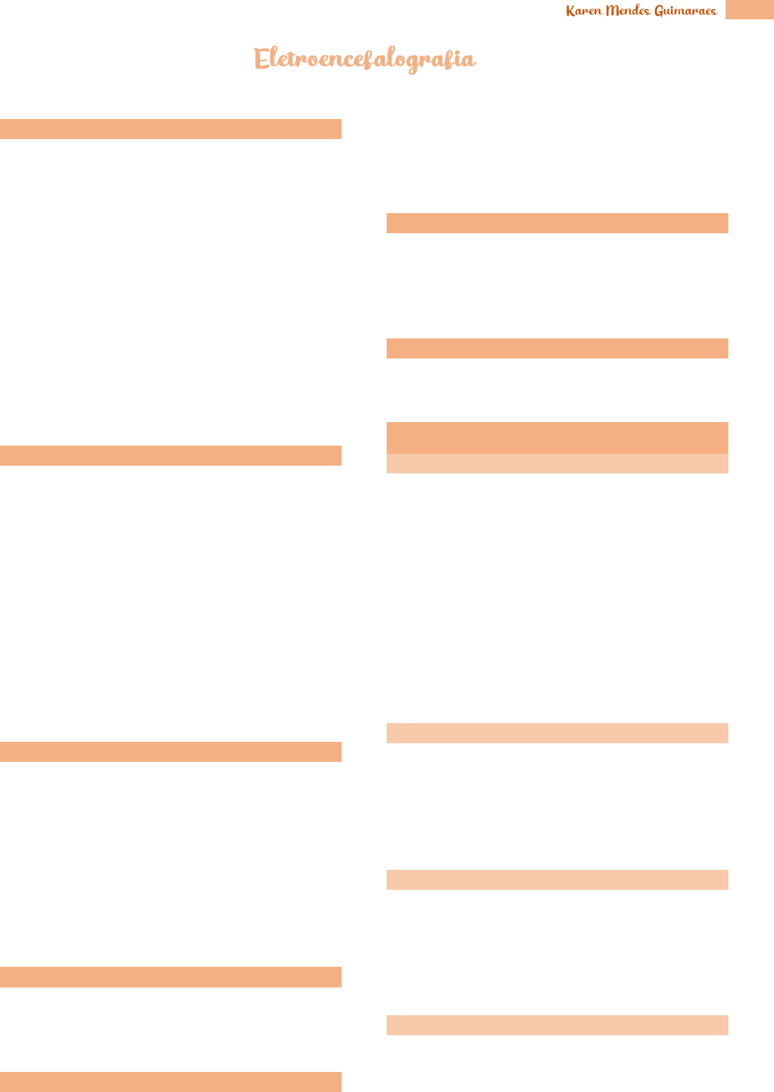 1 Conceito: • Exame que analisa a atividade elétrica cerebral espontânea, captada através da utilização de eletrodos colocados sobre o couro cabeludo; • Como a atividade elétrica espontânea está presente desde o nascimento, o EEG pode ser útil em todas as idades, desde os recém-nascidos até pacientes idosos. • Morte cerebral/encefálica: ausência de atividade elétrica no EEG / ausência da captação de sinais elétricos. • Atividade cerebral elétrica: Somatório do fluxo de corrente elétrica extracelular somado aos potenciais excitatórios e inibitórios pós-sinápticos (PEPS e PIPS). Características da onda: • Amplitude da onda – altura – o que se dá no plano vertical; • Frequência (HZ): ▪ Frequência traçada na região anterior é diferente da traçada na região posterior; ▪ A frequência é diferente quando estamos acordados e dormindo (fases do sono); • Como olhar frequência: cada quadrinho é 1seg, conta quantas ondas tem dentro do quadrinho. Ex: 6 ondas em 1seg = 6HZ; OBS: Paciente com intoxicação com benzodiazepínicos – alteração na frequência das ondas. Traçado: • Paciente com morte encefálica – não tem atividade elétrica – não tem amplitude, traçado reto; • Paciente com quadro demencial grave – atrofia cortical difusa – amplitude baixinha, traçado de baixa amplitude; • Paciente com tumor cerebral, causando epilepsia – pode ter vários padrões de traçado, mas pode ocorrer uma lentificação do traçado – lentificação patológica; Padrão de colocar eletrodos no crânio: • Sistema internacional 10-20; • Mede o crânio desde o násion até o inion – sagital; • Pré-auricular até pré-auricular – coronal ou frontal. Classificação das crises: • Focal: localizada em apenas uma região; • Generalizada: ocorre ao mesmo tempo em todas as regiões; • Crise focal com generalização secundária. Recomendações de EEG: • Paciente demencial; • Crise epiléptica; • Paciente em coma; • Paciente com perda consciência. Montagens: • Dupla banana; • Canais análogos tem que ter simetria; Ritmos cerebrais: Alfa • Ritmo de base; • Frequência: 8 – 13 HZ; • Amplitude: 5 a 100 microV (<50microV); • Regular, simétrico, sincrônico; • Típico da vigília; • Mais predominante nas regiões posteriores - occipital; • Acentuada com o fechamento ocular, relaxamento físico e inatividade mental relativa. • Frequência muito lenta na região posterior, ex 2Hz, é patológico – foco epiléptico, tumor; Beta • Frequência: 14 a 30 Hz (média 35Hz); • Amplitude: variável, mas acima de 30microV; • Mais proeminente nas regiões anteriores; • Generalizada e em excesso com BZ; • Região frontal com lentificação de 4 Hz – patológico. Teta • Frequência: 4 a 8Hz; • Amplitude: variável; • Ritmo presente na sonolência e fases mais superficiais do sono – Ritmo do sono; • Distúrbios da atividade de base; Delta • Frequência < 4Hz; • Amplitude geralmente mais alta; 2 • Sono mais profundo; • Distúrbios da atividade de base. • *normalmente patológicos. OBS: Região anterior tem uma frequência mais rapidinhas, maior ou igual a 13 Hz. OBS: Regiões medianas: pode ter um misto de tudo. Provas de ativação: Hiperventilação: • Respiração profunda e regular frequência de 20/min por um período de 2 a 4 min; • Aumento flutuante da atividade lenta síncrona bilateral e alentamento dos ritmos alfa e beta, intermitente ou contínua; • Pode evidenciar melhor uma crise de ausência; • Sua ausência também é normal. • Contraindicação: ▪ Avc agudo; ▪ Hemorragia intracraniana recente; ▪ Estenose significativa dos grandes vasos; ▪ Doença cardiopulmonar; ▪ Anemia falciforme ou traço; ▪ Inabilidade do paciente em cooperar. Foto estimulação intermitente: • Luzes disparando em flashes com 3, 6, 9, 12, 15, 18 e 21 Hz; • Respostas possíveis: ▪ Arrastamento fótico; ▪ Fotomioclônica ou fotomiogênica; ▪ Fotoparoxística ou fotoconvulsiva • Arrastamento fótico: ▪ Atividade rítmica nas regiões posteriores por FEI nas frequências de 5 a 30Hz, harmônicas e idênticas ao estímulo, considerada uma resposta fisiológica; amplitude aumenta com a idade; ▪ Respostas exacerbadas a baixas frequências (o,5 a 3Hz) estão relacionadas a disfunção cerebral aguda ou subaguda. • Fotomioclônica: ▪ Breves contrações musculares repetitivas nas regiões frontais; ▪ Aumentam a amplitude conforme aumentam os flashes; ▪ É abruptamente interrompida quando cessam; ▪ Mais evidente as frequências de 12 a 18 Hz; ▪ Mais comum em adultos; ▪ Principalmente nos canais anteriores. • Fotoparoxística (não é fisiológico): ▪ Presença de espículas e ondas ou complexos de espículas ondas bilaterais e síncronas, simétricas e generalizadas que persistem após o estímulo; ▪ Pode se associar a alterações de consciência e espasmos musculares de todo o corpo, MMSS e cabeça; ▪ As frequências que mais estimulam são 15 a 18 Hz – 15 com olhos fechados – 20 com olhos abertos; ▪ Mais comum em crianças e adolescentes, sexo feminino; ▪ Mais relacionadas com epilepsia generalizada primária (EMJ); ▪ Estudos sugerem uma predisposição genética; ▪ Interromper o exame se generalizada; ▪ Anormalidade epileptiformes espontâneas presentes em 65% dos pacientes com resposta fotoparoxística; ▪ Epilepsia fotossensível. • Abertura e fechamento ocular: 3 ▪ Piscamento pode induzir a descarga epileptiformes; ▪ Tanto fechamento quanto abertura; ▪ Fotossensibilidade; ▪ Relacionado a áreas frontais. Anormalidades Atividade de base: • Padrões de sono anormais; • Atividade lenta focal ou generalizada; • Atividade epileptiforme paroxística; • Padrões paroxísticos periódicos anormais. Descargas epileptiformes: • Biomarcadores de epilepsia; • Mas nem todos pacientes com epilepsia tem descarga, nem