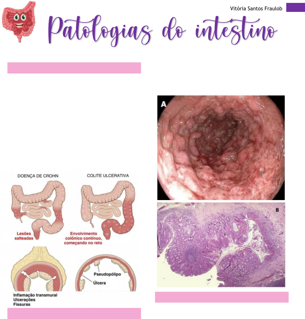 1 Vitória Santos Fraulob DOENÇA INFLAMATÓRIA INTESTINAL (DII) - Processo inflamatório crônico em que a mucosa intestinal sofre sensibilização por componentes bacterianos constitutivos da microflora intestinal. - É uma combinação entre disfunção epitelial + resposta imunológica exacerbada + alterações na composição da microflora bacteriana. - A doença inflamatória intestinal pode ser retocolite ulcerativa ou doença de Crohn – diferenciada em 2 entidades patológicas de acordo com a localização das lesões no TGI e expressão morfológica. CASO CLÍNICO 1 Mulher de 32 anos apresenta-se no ambulatório de clinica medica queixando-se de distensão abdominal. Relata ter apresentado diarreia mucosa e sanguinolenta por 5 dias, há aproximadamente 8 semanas com melhora espontânea. Na ultima semana apresentou novos episódios diarreicos de aspecto mucoso. Queixa- se também de abdome distendido. A radiografia simples de abdome e a tomografia computadorizada (TC) mostram dilatação acentuada do lado direito do cólon. Uma colonoscopia revelou mucosa edemaciada, ulcerada e com a presença de pseudopólipos em extensão de reto e cólon (figura A). Uma biópsia revelou ulcera superficial e inflamatório linfocítico e presença de PMN em glândula mucosa (figura B) RETOCOLITE ULCERATIVA (RCU) MANIFESTAÇÕES EXTRAINTESTINAIS: - Colangite esclerosante - Eritema nodoso - Espondilite ancilosante - Uveíte - Uretrite - Poliartrite migratória ALTERAÇÕES MORFOLÓGICAS: - Pseudopólipos - Ulceras superficiais e com base larga - Abcessos de cripta - Perda de células caliciformes - Atrofia da mucosa COMPLICAÇÕES: 2 Vitória Santos Fraulob - Megacólon tóxico - Risco aumentado de adenocarcinoma CASO CLÍNICO 2 Menino de 10 anos, foi admitido no departamento de pediatria por perda de peso, dores em abdome superior, vômitos e diarreia durante 4 meses. O menino apresentava fístula perianal sangrante. Havia uma história familiar de doenças imunomediadas: o pai do paciente tinha sido diagnosticado com sarcoidose e o irmão do pai tinha DC. Uma colonoscopia mostrou mucosa intestinal avermelhada dispersa com pequenas ulceras aftóides no ceco e no cólon ascendente e transverso. A biópsia revelou as imagens a seguir. DOENÇA DE CROHN MANIFESTAÇÕES EXTRAINTESTINAIS: - Colangite esclerosante - Colelitíase - Artrite - Eritema nodoso - Espondilite anquilosante - Nefrolitíase MORFOLOGIA: - Lesões em pedra de calçamento - Ulceras alongadas, profundas e estreitas - Inflamação transmural - Granulomas COMPLICAÇÕES: - Fístulas - Estenosa - Ileocecal - Perfurações - Peritonite 3 Vitória Santos Fraulob - A DC apresenta as lesões salteadas e pode acometer todo o TGI, da boca ao ânus.