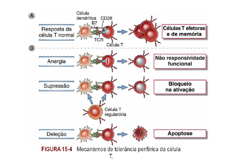 Transcrição Imunologia Tolerância Imunológica e Doenças Autoimunes Quando o antígeno é reconhecido por nosso organismo teremos uma resposta imunológica. Contudo, podemos ter também, a chamada resposta de tolerância imunológica. Então, posso ter um contato com o agente, irá ocorrer uma resposta imunológica para eu desenvolver a tolerância a resposta imunológica. A Tolerância Imunológica se desenvolve quando temos contato com o agente estranho, mas ele não ativará nenhuma resposta imune que já vimos até hoje. Ou seja, não haverá uma responsividade imunológica. Assim ele será chamado de TOLEROGENO. Pessoas normais, tolerantes a alguma coisa, geralmente elas toleram aquilo que é do próprio organismo. Caso isso não ocorra, ocorrerá o desenvolvimento de uma doença. Podemos ter tolerância a antígeno próprio, como no caso da apresentação do linfócito T, no Timo e na medula, quando os linfócitos estão sendo formados. Esse tipo de tolerância é chamado de TOLERÂNCIA CENTRAL. Nesse tipo de tolerância, falaremos sobre três mecanismos muito importantes: Apoptose, Edição de Receptor de Célula B (linfócito B) e processo de formação de Célula Regulatória TReg, que atuará na periferia, suprimindo a ação de células auto reativas. Tolerância de Células T Vamos falar primeiramente de Tolerância de Linfócito T. Eles são formados no Timo, obtendo suas características funcionais. É no timo que também se forma as características de Tolerância Central. Nesse sentido, temos que lembrar que o linfócito T tem como função reconhecer os antígenos trazidos pelos Linfócitos B. A Célula T Reguladora não é capaz de reconhecer o antígeno sem a ação do Linfócito T. Normalmente a celula T, quando reconhece um antígeno e possui uma alta afinidade por este, ela morre. Como já estudado. Entretanto, se ela reconhecer e não morrer, ela é chamada de Célula T Regulatória. Esta por sua vez, irá suprimir a ação de outras células linfocitárias nos órgãos linfoides secundários. Basicamente as Células TReg são linfócitos TCD4. Linfócitos TCD8 raramente se transforma em células T regulatórias. Podemos dizer que cerca de 90% de nossas células T regulatórias são TCD4, e estes expressão mecanismos importantíssimos nos órgãos linfoides secundários para a ação regulatória. Nos órgãos linfoides secundários, casos o antígeno próprio não tenha passado pelo Timo, a célula T pode vir a responder ao antígeno próprio trazidos pelas células apresentadoras lá no vaso, onde eles estão presentes. Caso ocorra muito reconhecimento, temos três mecanismos de ação. O primeiro é ANERGIA que é quando uma célula apresentadora de antígeno apresenta o antígeno para o linfócito T e ele o reconhece fortemente, mas não responde por falta de energia. Isso, causado pela falta de cooestimuladores, os PAMPs e DAMPs, pela falta de imunidade inata. A SUPRESSÃO ou ação das Células T Regulatórias, que ficam em circulação após serem formadas nos órgãos linfoides primários. Em circulação, toda vez que ocorre reconhecimento de um antígeno próprio ou não próprio, a Célula T Regulatória manda sinais para células que seriam ativadas, inibindo a ação dessa, tornando-a com característica anérgica. Este evento é chamado de supressão de célula T. As células Treg, são linfócitos TCD4 com função de suprimir resposta imunológica. Isso é muito importante quando pensamos no processo de resposta imunológica que vimos, aquela curva padrão. Toda vez que tenho contato com antígeno, ocorre expansão celular, depois formação células efetoras e por último, o processo de contração. O processo de contração é importante, pois eu já matei o antígeno. Mas, seu eu começar a ter muito agente estranho e causar muitos danos aos tecidos, por um processo de feedback negativo, as células T regulatória podem atuar, suprimindo a resposta imunológicas, evitando danos aos tecidos e mantendo a homeostase do organismo. Para manter a tolerância, essas células T produzem diversos fatores. Por exemplo, elas produzem IL-10, que atuam como anti-inflamatório. O TGF- beta, outro fator produzido, tem um papel anti resposta inflamatória. Muito comum nos processos de desenvolvimento de câncer. Além disso, elas induzem a expressão da proteína CTLA-4, com a função de competir com o coestimulador presente na célula apresentadora de antígeno. Assim, toda vez que ocorre muito apresentação a agentes estranhos, ocorre apresentação destes coestimuladores para evitar maiores danos. A deleção ocorre pela ausência do coestimulador. Toda vez que tenho a entrada de um agente, de vida curta, no organismo ocorrerá uma resposta imunológica contra ela. Contudo, se ela permanecer no organismo, se multiplicando, pode gerar uma tolerância imunológica. Assim, a tolerância só e gerada quando ocorre um contato. A porta de entrada do agente é outra coisa importante, se é subcutânea, via intravenosa, via mucosa, pode facilitar criar à tolerância, pois em algumas vias, devido a vascularização, o contato pode ser mais rápido do que em outras vias. Se a APC possui altos níveis de coestimuladores ela induzirá a reposta imunológica. Caso ela tenha baixos níveis, ocorrerá uma tolerância. Tolerância de Células B A grande diferença para células T é a edição do receptor. Pois, se temos o reconhecimento de antígeno próprio e ele é reconhecido fortemente pelo BCR, ele irá morrer. Agora, se ocorre ligação de reconhecimento e não ocorre uma ligação forte, mas suficiente para gerar reposta, principalmente no OLP, ela pode se tornar anérgica. A grande diferença é que se ocorre essa diferenciação nos OLP, ocorre a reativação da RAG, ocorrendo uma recombinação VDJ. Quando há quebra de tolerância, em qualquer um dos níveis, surgem as doenças autoimunes. Estas, ocorrem quando os mecanismos falham no processo de formaç