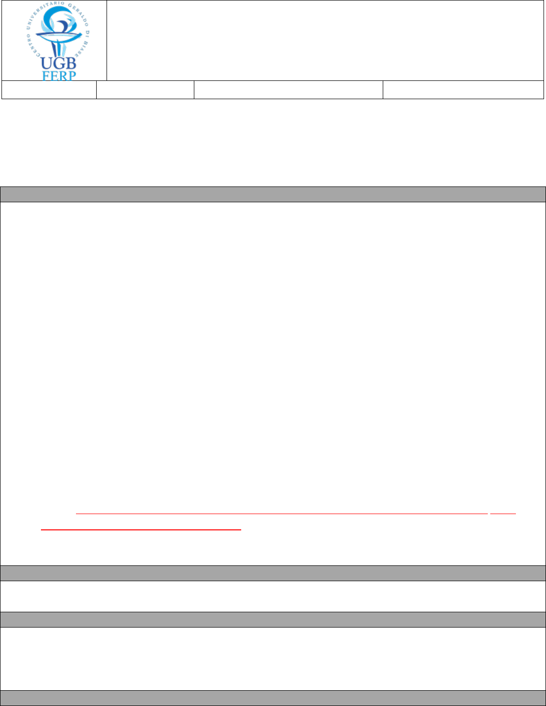 CENTRO UNIVERSITÁRIO GERALDO DI BIASE FUNDAÇÃO EDUCACIONAL ROSEMAR PIMENTEL CURSO: Engenharia Civil DISCIPLINA: Instalações Elétricas e Prediais PROFESSOR: Lauro L. W. Peixoto ALUNO(A): _______________________________________ 7° PERÍODO 1° BIMESTRE INSTRUMENTO: TRABALHO INDIVIDUAL VALOR: FORMULÁRIO PARA ENVIO DE TRABALHO DE DISCIPLINA REGULAR TAREFA 01: Trabalho de Avaliação para o 1º Bimestre de 2021-02 Prezado aluno (a) esta Tarefa deve ser efetuada conforme os itens orientativos a seguir: 1 – Planta: Disponibilizar a planta baixa de arquitetura da unidade residencial que será utilizada para o desenvolvimento do Projeto de Instalações Elétricas na disciplina. 2 – Formato: A planta disponibilizada deverá conter as cotas dos ambientes, de tal forma que permitam calcular as áreas e os perímetros de cada ambiente da planta. Obs.: A Planta deverá ser postada nesta sala disciplinar, em pdf, até as 23:59 h do próximo dia 11 de agosto de 2021. ORIENTAÇÕES: Conforme descrição feita acima. DATA DE ENTREGA: O trabalho deve ser postado na Plataforma NEAD, na sala da disciplina, como tarefa, dentro do prazo limite estabelecido acima e na sala da disciplina. Obs.: Terminado esse período, o item é automaticamente encerrado pelo sistema. DÚVIDAS: Em caso de dúvidas entre em contato com o NEAD pelo e-mail: nead@ugb.edu.br | WhatsApp: (24) 99924-9160 ou com o Grupo de Apoio Pedagógico-GAP pelo e-mail: gap@ugb.edu.br | WhatsApp (24) 98839-8760.