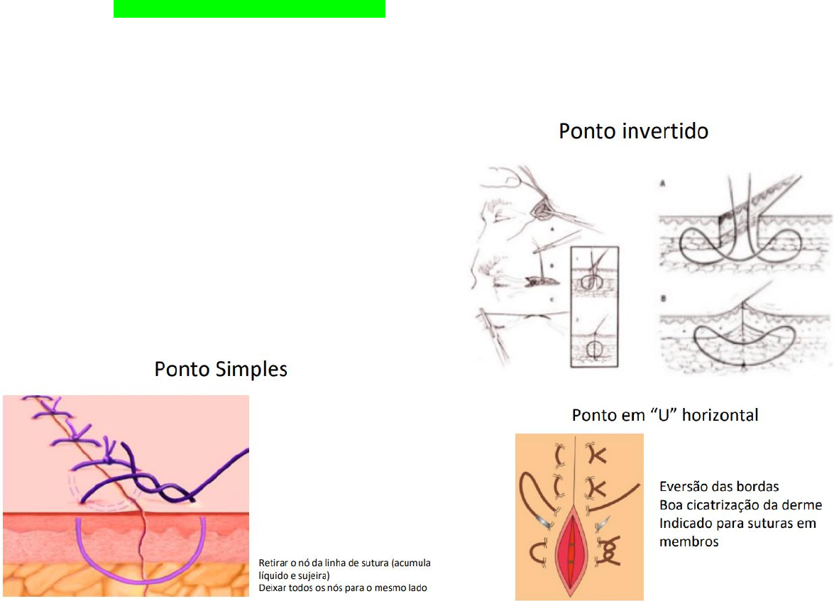SUTURAS DEFINIÇÃO: Ponto ou conjunto de pontos aplicados nos tecidos com o objetivo de união, fixação e sustentação até a cicatrização. NÓ ➔ 1° laçada – Aperta ➔ 2° laçada – Fixa ➔ 3° nó – maior segurança Cada laçada no sentido oposto da anterior, senão afrouxa (Número de nós a serem dados: 1 n° a mais do n° do fio usado) TIPOS DE SUTURA: - Sutura em pontos separados - Sutura contínua SUTURA EM PONTOS SEPARADOS: Vantagem: Afrouxamento de 1 nó não interfere no restante da sutura; Menor quantidade de corpo estranho no interior da ferida; Pontos são menos isquemiantes Desvantagem: Mais trabalhosas; Mais demoradas ➔ Ponto simples ➔ Ponto simples invertido ➔ Ponto em “U” horizontal ➔ Ponto em “U” vertical (Donatti) ➔ Ponto em “X” horizontal ➔ Ponto em “X” invertido ➔ Ponto Allgöwer (Donatti semi enterrado) ➔ Ponto Smead Jones SUTURA CONTÍNUA Nó inicial – Sutura – Nó terminal Vantagem: Fácil realização; Rápida realização Desvantagem: Afrouxamento do nó interfere compromete toda a sutura; Grande quantidade de corpo estranho no interior da ferida; Pontos são isquemiantes ➔ Sutura contínua simples (Chuleio simples) ➔ Sutura contínua ancorada (Chuleio ancorado) ➔ Sutura em barra grega ➔ Sutura intra tecidual em barra grega (Sutura intradérmica contínua) RETIRADA DOS FIOS DE SUTURA SUBCUTÂNEA: - O mais breve possível - Logo que a cicatriz adquira resistência - Considerar o tipo de tecido e sua capacidade de adquirir resistência