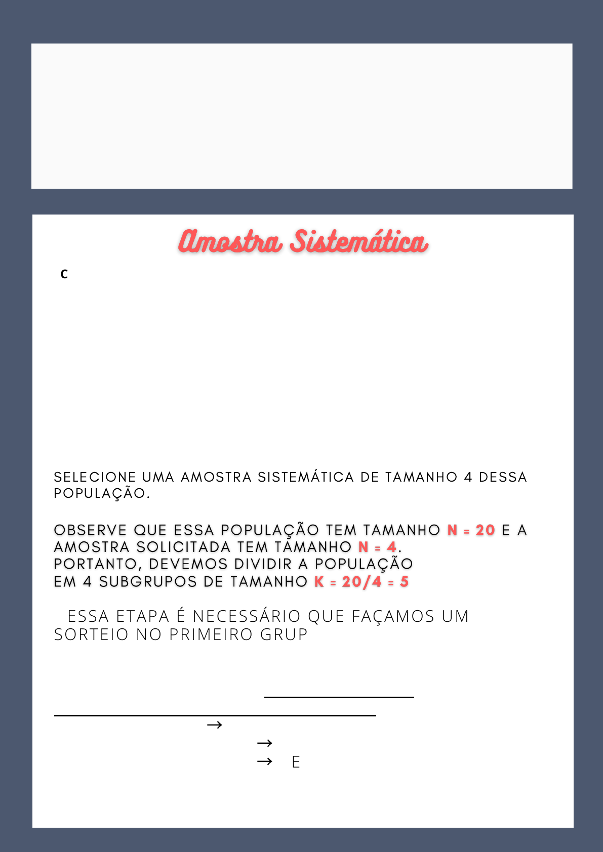 AMOSTRAGEM CONSIDERE UMA POPULAÇÃO DE 20 ALUNOS DA DISCIPLINA DE MÉTODOS QUANTITATIVOS, OS QUAIS ESTÃO LISTADOS A SEGUIR EM ORDEM ALFABÉTICA. 1 ALICE 8 ISABELLA 15 MATHEUS 2 ARTHUR 9 JÚLIA 16 MIGUEL 3 BERNARDO 10 LAURA 17 PEDRO 4 DAVI N 11 LUCAS 18 RAFAEL 5 GABRIEL 12 LUÍZA 19 SOPHIA 6 GIOVANNA 13 MANUELA 20 VALENTINA 7 HEITOR 14 MARIA SELECIONE UMA AMOSTRA SISTEMÁTICA DE TAMANHO 4 DESSA POPULAÇÃO. NESSA ETAPA É NECESSÁRIO QUE FAÇAMOS UM SORTEIO NO PRIMEIRO GRUPO PARA DETERMINAR O PRIMEIRO A PERTENCER À AMOSTRA. SUPONHA QUE O SORTEADO TENHA SIDO O NÚMERO P = 2 , OU SEJA, ARTHUR. DESSE MODO, OS PRÓXIMOS A PERTENCEREM À AMOSTRA SERÃO: P + K = 2 + 5 = 7 → HEITOR P + 2K = 2 + 2 · 5 = 12 → LUÍZA P + 3K = 2 + 3 · 5 = 17 → PEDRO AMOSTRAGEM 2. No pr imeiro subgrupo real izamos um sorteio (amostragem aleatór ia s imples) para determinar o pr imeiro elemento pertencente à amostra. Suponha que ele esteja na posição p ≤ k ; 3. A PARTIR DO SORTEIO DO PASSO ANTERIOR, OS DEMAIS N – 1 ELEMENTOS PERTENCENTES À AMOSTRA FICAM DETERMINADOS. SERÃO AQUELES QUE ESTIVEREM NAS POSIÇÕES: P + K, P + 2K, P + 3K, . . . , P +(N – 1 )K.