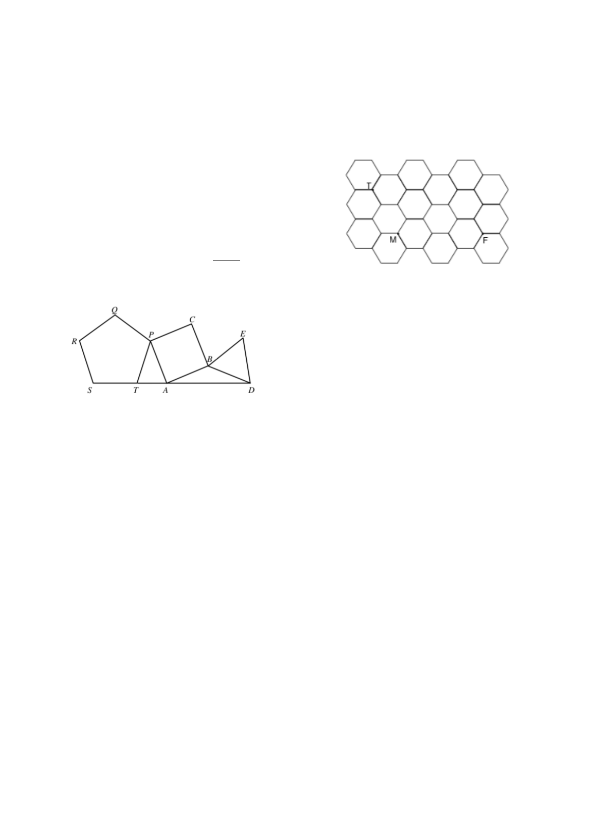 Polígonos 1 - Na figura abaixo temos um pentágono regular, um quadrado e um triângulo equilátero, todos com a mesma medida de lado. Sabe-se que a medida do ângulo externo de um polígono regular de n lados é igual a , então podemos afirmar que a medida do ângulo obtuso QCE é igual a: a) 177º b) 174º c) 171º d) 167º 2 - Do vértice A de um polígono partem 9 diagonais. Sabendo disso podemos afirmar que a soma dos ângulos internos e o número de diagonais desse polígono são, respectivamente, iguais a: a) 1260º e 27 b) 720º e 27 c) 1800º e 54 d) 2160º e 54 3 - Um piso plano é revestido de hexágonos regulares congruentes cujo lado mede 10 cm. Na ilustração de parte desse piso, T, M e F são vértices comuns a três hexágonos e representam o s p o n t o s n o s q u a i s s e e n c o n t r a m , respectivamente, um torrão de açúcar, uma mosca e uma formiga. Ao perceber o açúcar, os dois insetos partem no mesmo instante, com velocidades constantes, para alcançá-lo. Admita que a mosca leve 10 segundos para atingir o ponto T. Despreze o espaçamento entre os hexágonos e as dimensões dos animais. A medida do ângulo TMF é igual a a) 90º b) 100º c) 110º d) 120º 4 - Determinar a soma das medidas dos ângulos internos de um polígono convexo que tem 65 diagonais. 360o n Prof. Paulo Régis 5 - Determinar o número de diagonais de um polígono regular cuja medida de cada ângulo externo é 30º. 6 - Determinar o número de diagonais de um polígono regular sabendo-se que a medida de um ângulo interno excede a medida do ângulo externo em 132º. 7 - Dados dois polígonos convexos, A e B, sabe-se que B tem 4 lados e 30 diagonais a mais do que A. Determine quais são os polígonos A e B. 8 - Dados dois polígonos regulares, A e B, sabe- se que B tem 6 lados a mais do que A e a diferença das medidas de seus ângulos externos é 16º. Determine quais são esses polígonos. 9 - (UNIFESP-SP) Pentágonos regulares congruentes podem ser conectados, lado a lado, formando uma estrela de cinco pontas, conforme destacado na f igura. Nestas condições, o ângulo q mede: a) 108º b) 72º c) 54º d) 36º e) 18º 10 - (FUVEST-SP) Dois ângulos internos de um polígono convexo medem 130º cada um e os demais ângulos internos medem 128º cada um. O número de lados desse polígono é: a) 6 b) 7 c) 13 d) 16 e) 17 11 - No pentágono ao lado, AB // DE. Determinar a soma das medidas dos ângulos internos assinalados. a) 180º b) 210º c) 270º d) 360º e) 540º 12 - Dado um dodecágono regular ABCDE ... , sendo O o centro do dodecágono, determinar a medida do ângulo AOE. 13 - Na figura ao lado, ABC é um triângulo equilátero e DEFGH é um pentágono regular. Sabendo-se que D pertence ao lado AC, F pertence ao lado AB, G e H pertencem ao lado BC, determinar as medidas dos ângulos ADE e CDH. 14 - (MACK-SP) Num quadrilátero convexo, a soma de dois ângulos internos consecutivos mede 190º. O maior ângulo formado pelas bissetrizes internas dos dois outros ângulos mede: a) 105º b) 100º c) 90º d) 95º e) 85º 15 - Dado o eneágono regular ao lado, determinar a medida do ângulo formado pelos prolongamentos dos lados AB e DE. 16 - Na figura ao lado, determinar o valor de . 17 - Na figura adiante, ABCDE é um pentágono regular. A medida, em graus, do ângulo é: a) 32° b) 34° c) 36° d) 38° e) 40° 18 - (ENEM - 2016) Um gesseiro que trabalhava na reforma de uma casa lidava com placas de gesso com formato de pentágono regular quando percebeu que uma peça estava quebrada, faltando uma parte triangular, conforme mostra a figura. Para recompor a peça, ele precisou refazer a parte triangular que faltava e, para isso, anotou as medidas dos ângulos , e do triângulo ADE. As medidas x, y e z, em graus, desses ângulos são, respectivamente, a) 18,18 e 108. b) 24, 48 e 108. c) 36, 36 e 108. d) 54, 54 e 72. e) 60, 60 e 60. x + y α x = E ̂AD y = ED̂A z = A ̂ED 19 - (ENEM - 2011) O polígono que dá forma a essa calçada é invariante por rotações, em torno de seu centro, de a) 45°. b) 60°. c) 90°. d) 120°. e) 180°. 20 - (ENEM - 2016) Um artista utilizou uma caixa cúbica transparente para a confecção de sua obra, que consistiu em construir um polígono IMNKPQ, no formato de um hexágono regular, disposto no interior da caixa. Os vértices desse polígono estão situados em pontos médios de arestas da caixa. Um esboço da sua obra pode ser visto na figura. Considerando as diagonais do hexágono, distintas de IK, quantas têm o mesmo comprimento de IK? a) 1 b) 2 c) 4 d) 8 e) 9 21 - (ENEM - 2015) Para uma alimentação saudável, recomenda-se ingerir, em relação ao total de calorias diárias, 60% de carboidratos, 10% de proteínas e 30% de gorduras. Uma nutricionista, para melhorar a visualização dessas porcentagens, quer dispor esses dados em um polígono. Ela pode fazer isso em um triângulo equilátero, um losango, um pentágono regular, um hexágono regular ou um octógono regular, desde que o polígono seja dividido em regiões cujas áreas sejam proporcionais às porcentagens mencionadas. Ela desenhou as seguintes figuras: Entre esses polígonos, o único que satisfaz as condições necessárias para representar a ingestão correta de diferentes tipos de alimentos é o a) triângulo. b) losango. c) pentágono. d) hexágono. e) octógono. GABARITO 1 - b 2 - c 3 - d 4 - 1980º 5 - 54 6 - 90 7 - heptágono e undecágono 8 - eneágono e pentadecágono 9 - d 10 - b 11 - d 12- 120º 13- 24º e 48º 14 - d 15 - 60º 16 - 74º 17 - c 18 - c 19 - d 20 - b 21 - c