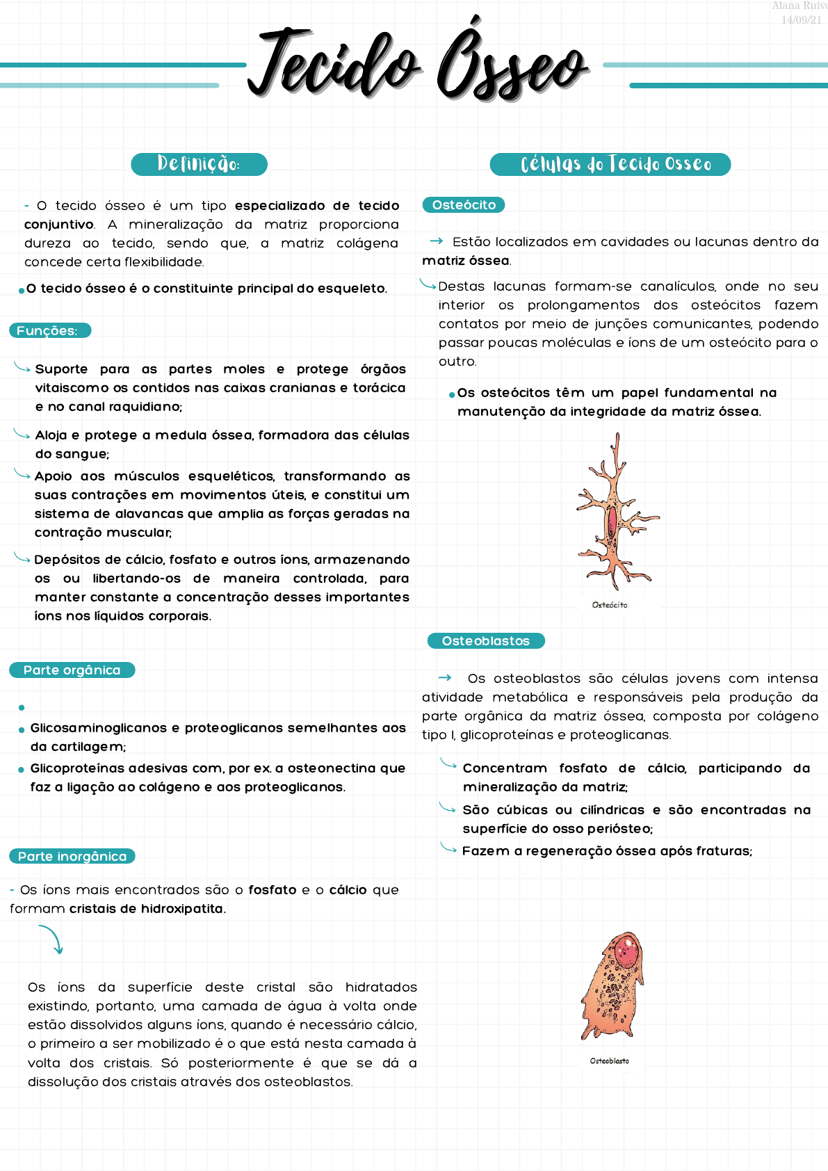 Tecido ÓsseoTecido ÓsseoTecido Ósseo Destas lacunas formam-se canalículos, onde no seu interior os prolongamentos dos osteócitos fazem contatos por meio de junções comunicantes, podendo passar poucas moléculas e íons de um osteócito para o outro. Funções: Osteócito Osteoblastos Definição:Definição: Células do Tecido ÓsseoCélulas do Tecido Ósseo - O tecido ósseo é um tipo especializado de tecido conjuntivo. A mineralização da matriz proporciona dureza ao tecido, sendo que, a matriz colágena concede certa flexibilidade. Suporte para as partes moles e protege órgãos vitaiscomo os contidos nas caixas cranianas e torácica e no canal raquidiano; O tecido ósseo é o constituinte principal do esqueleto. Os osteócitos têm um papel fundamental na manutenção da integridade da matriz óssea. - Os íons mais encontrados são o fosfato e o cálcio que formam cristais de hidroxipatita. Os íons da superfície deste cristal são hidratados existindo, portanto, uma camada de água à volta onde estão dissolvidos alguns íons, quando é necessário cálcio, o primeiro a ser mobilizado é o que está nesta camada à volta dos cristais. Só posteriormente é que se dá a dissolução dos cristais através dos osteoblastos. Aloja e protege a medula óssea, formadora das células do sangue; Depósitos de cálcio, fosfato e outros íons, armazenando os ou libertando-os de maneira controlada, para manter constante a concentração desses importantes íons nos líquidos corporais. Apoio aos músculos esqueléticos, transformando as suas contrações em movimentos úteis, e constitui um sistema de alavancas que amplia as forças geradas na contração muscular; → Estão localizados em cavidades ou lacunas dentro da matriz óssea. → Os osteoblastos são células jovens com intensa atividade metabólica e responsáveis pela produção da parte orgânica da matriz óssea, composta por colágeno tipo I, glicoproteínas e proteoglicanas. Alana Ruivo 14/09/21 Concentram fosfato de cálcio, participando da mineralização da matriz; São cúbicas ou cilíndricas e são encontradas na superfície do osso periósteo; Fazem a regeneração óssea após fraturas; Glicoproteínas adesivas com, por ex. a osteonectina que faz a ligação ao colágeno e aos proteoglicanos. Glicosaminoglicanos e proteoglicanos semelhantes aos da cartilagem; Parte orgânica Parte inorgânica Periósteo e EndósteoPeriósteo e Endósteo Classificação histológica:Classificação histológica: Tipos de tecido ósseo:Tipos de tecido ósseo: Funções: Osteoprogênitoras Tecido ósseo primário: Osteoclastos → São células mesenquimatosas (origem mesenquimal) com poder de diferenciar se e proliferar-se em células formadoras de tecido ósseo, os osteoblastos. → Os osteoclastos são células muito grandes que resultam da fusão de várias células do sistema fagocitário mononuclear, têm origem em células que se originam na medula óssea, e estas por sua vez originam os monócitos e os macrófagos (varias células fundem-se e dão origem aos osteoclastos) Alana Ruivo 14/09/21 Durante a fase de crescimento dos ossos e reparações de lesões ósseas, as células osteoprogenitoras são mais ativas e também aumentam a sua atividade originado novos osteoblastos para o tecido ósseo. As principais funções do endósteo e do periósteo são a nutrição do tecido ósseo e o fornecimento de novos osteoblastos, para o crescimento e a recuperação do osso. Osso compacto: constituído de partes sem cavidades; Osso esponjoso: constituídos por partes com muitas cavidades intercomunicastes. - A camada mais superficial do periósteo contém principalmente fibras colágenas e fibroblastos. As fibras de sharpey são feixes de fibras colágenas do periósteo que penetram no tecido ósseo e prendem firmemente o periósteo ao osso - O tecido primário é o que aparece primeiro, tanto no desenvolvimento embrionário como na reparação das fraturas, sendo temporário e substituído por tecido secundário. - O endósteo é geralmente constituído por uma camada de células osteogênicas achatadas revestindo as cavidades do osso esponjoso, o canal medular, os canais de Harvers e os de Volkamnn. Na sua porção profunda, o periósteo é mais celular e apresenta células osteoprogenitoras, morfologicamente parecidas com fibroblastos Osso primário ou imaturo; Osso secundário, maduro ou lamelar; Histogênese do Tecido ósseoHistogênese do Tecido ósseo Funções: → O osso forma-se a partir de dois tipos de ossificação: → Portanto o osso vai se formar a partir de 1 centro de ossificação primário e 1 colar periostal (na diáfise) e de 1 centro de ossificação secundário nas epífises e cresce a partir do disco epifisário. Esta vai originar trabéculas de osso com os osteócitos no seu interior e osteoblastos à periferia. Alana Ruivo 14/09/21 Possuí fibras colágenas dispostas em várias direções sem organização definida, tem menor quantidade de minerais e maior proporção de osteócitos do que o tecido ósseo secundário. Posteriormente, centro de ossificação secundários são formados nas epifises do osso, permitindo a substituição da cartilagem hialina por tecido ósseo. Toda a cartilagem hialina é substituída por tecido ósseo, exceto a superfície articular e a placa epifisária. Intramembranosa: surge nos osso chatos da cavidade craniana, a partir de células mesenquimatosas. Estas diferenciam-se em osteoblastos que vão começar a formar o centro de ossificação primário, isto é o blastema ósseo Conjuntos de células que retraem os prolongamentos, de modo a que fiquem mais curtos e que se vão dividindo para começarem a produzir matriz óssea. Esta vai originar trabéculas de osso com os osteócitos no seu interior e osteoblastos à periferia. Á medida que se forma a matriz óssea, que inicialmente é na diáfise do osso através do colar periostal e do centro de ossificação primário, 
