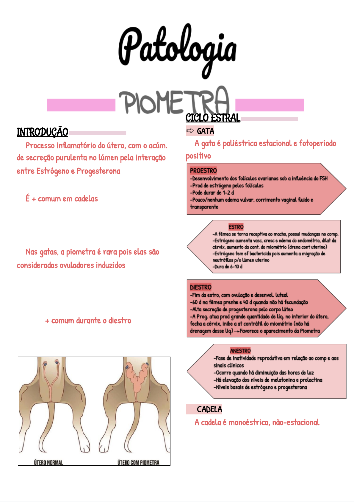 INTRODUÇÃO → Processo in�amatório do útero, com o acúm. de secreção purulenta no lúmen pela interação entre Estrógeno e Progesterona →Provém de uma Hiperplasia Endometrial Cística (HEC) → É + comum em cadelas → E. coli é o agente + isolado (Bactérias oportunistas: Staphylococcus aureus, Streptococcus spp., Pseudomonas spp. e Proteus spp .) → Nas gatas, a piometra é rara pois elas são consideradas ovuladores induzidos (precisam de estímulo vaginal p/que ocorra o desenv. do corpo lúteo e a secreção de Progesterona) → Pode ocorrer em qualquer fase do ciclo estral→ + comum durante o diestro → As fêmeas de ½ idade- idosas são + predispostas CICLO ESTRAL ➪ GATA → A gata é poliéstrica estacional e fotoperíodo positivo ➪ CADELA → A cadela é monoéstrica, não-estacional (o fotoperíodo não é importante nessa spp) FISIOPATOGENIA → O E strógeno abre a cérvix , possibilitando a entrada de microorg. da �ora vaginal p/a luz uterina→A lém de um estímulo ao ↑do nº de receptores de Progesterona no endométrio → Progesterona estimula a secreção das glands endometriais = HEC= Acúmulo de líq na luz uterina → A interação desses horm favorece a infecção bact. 2ª (via ascendente) → Esse liq acumulado possui nutrientes e pH favorável ao cresc bacteriano= Piometra SINAIS CLÍNICOS → Febre, vômitos, depressão, desidratação, anorexia, poliúria e polidipsia → ↑abdominal e muco amarelo/amarronzado ou avermelhado (sangue) → ↓ do ADH (leva ao quadro de poliúria/polidipsia)= Pode levar a IRA e outros problemas renais → Se houver desorientação, taquicardia, TPC ↑, pulso femoral fraco e hipotermia deve-se pensar em SEPSE DIAGNÓSTICO → Anamnese + S. clínicos + Ex de imagem + Ex laboratoriais ➪Ultrassonogra�a ➪Hemograma ➪Leucograma →É comum ver leucocitose por neutro�lia →No bioq, geralmente tem hiperglobulinemia e azotemia (Creat e uréia pode estar↑) TRATAMENTO ➪Clínico: Alizin →Usado para interrupção de gestação (até 45 d) e tratamento alternativo de piometra e metrite em cadelas ( não recomendado ) → É um bloqueador de Progesterona →Em gatas, funciona muito bem para a Hiperplasia Mamária → Cadela: 0,33 ml/kg/dia (10mg de aglepristone/kg/dia), SC, no lado interno do MP, a cada 24 horas, durante 2 dias → Gata: 0,50ml/kg/dia (15mg de aglepristone/kg/dia), SC, na reg da escápula, a cada 24 horas, durante 2 dias **2ª adm deve ser feito no membro oposto **Na piometra, aplicar nos dias 1, 2 , 8 e 15 após o início dos sintomas ➪Cirúrgico: →Deve ser feito a Ovariohisterectomia →Manusear o útero com cuidado (risco de romper!!!) →Se romper, lavar a cavidade abd com NaCl 0,9% (50mL/kg) previamente aquecida