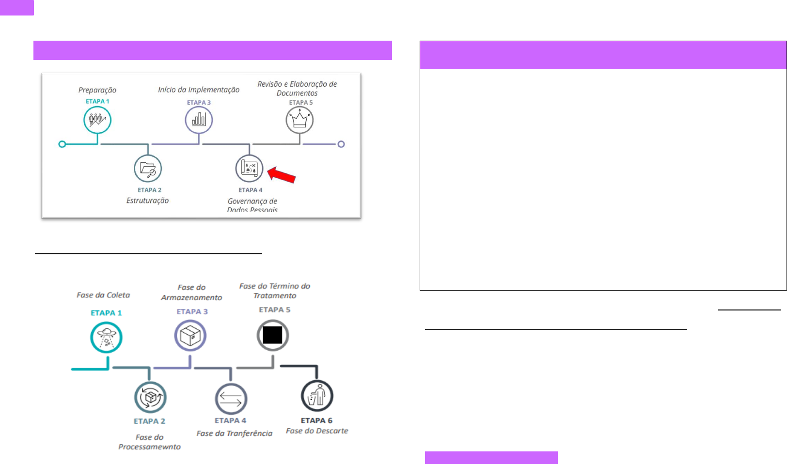 1 relatório de impacto a proteção dos dados pessoais FASE DE IMPLEMENTAÇÃO DA LEI GERAL DE PROTEÇÃO DE DADOS 4ª FASE: GOVERNANÇA DE DADOS PESSOAIS RELEMBRANDO: Art. 50. Os controladores e operadores, no âmbito de suas competências, pelo tratamento de dados pessoais, individualmente ou por meio de associações, poderão formular regras de boas práticas e de governança que estabeleçam as condições de organização, o regime de funcionamento, os procedimentos, incluindo reclamações e petições de titulares, as normas de segurança, os padrões técnicos, as obrigações específicas para os diversos envolvidos no tratamento, as ações educativas, os mecanismos internos de supervisão e de mitigação de riscos e outros aspectos relacionados ao tratamento de dados pessoais. (...) Art. 6º As atividades de tratamento de dados pessoais deverão observar a boa-fé e os seguintes princípios: VII - segurança: utilização de medidas técnicas e administrativas aptas a proteger os dados pessoais de acessos não autorizados e de situações acidentais ou ilícitas de destruição, perda, alteração, comunicação ou difusão; VIII - prevenção: adoção de medidas para prevenir a ocorrência de danos em virtude do tratamento de dados pessoais; A empresa deve mudar sua cultura; Ter como premissa: respeito aos direitos fundamentais da privacidade e intimidade; Enquanto o princípio da segurança determina a adoção de medidas técnicas e administrativas para proteger dados pessoais, o princípio da prevenção visa mitigar ou diminuir riscos de danos ao titular dos dados, se porventura houve falhas ou a segurança for violada. 4ª FASE - GOVERNANÇA: fiscalizar e aprimorar e se for necessário, corrigir. Fase de cuidado. 2 relatório de impacto a proteção dos dados pessoais • COLETA: base legal, transparência, finalidade (adequação), fontes e veracidade; • PROCESSAMENTO: encriptação, monitoramento através de sistema/softwares (monitorar o que o colaborador está fazendo com os dados pessoais); termo de confidencialidade no processamento dos dados; anonimização; Atenção! O colaborador deve ser avisado de que faz o monitoramento dos dados pessoais, a fim de evitar processos trabalhistas (invasão de privacidade). Atenção! O empregador também deve colocar termo de confidencialidade no contrato de trabalho. Atenção! Anonimização: