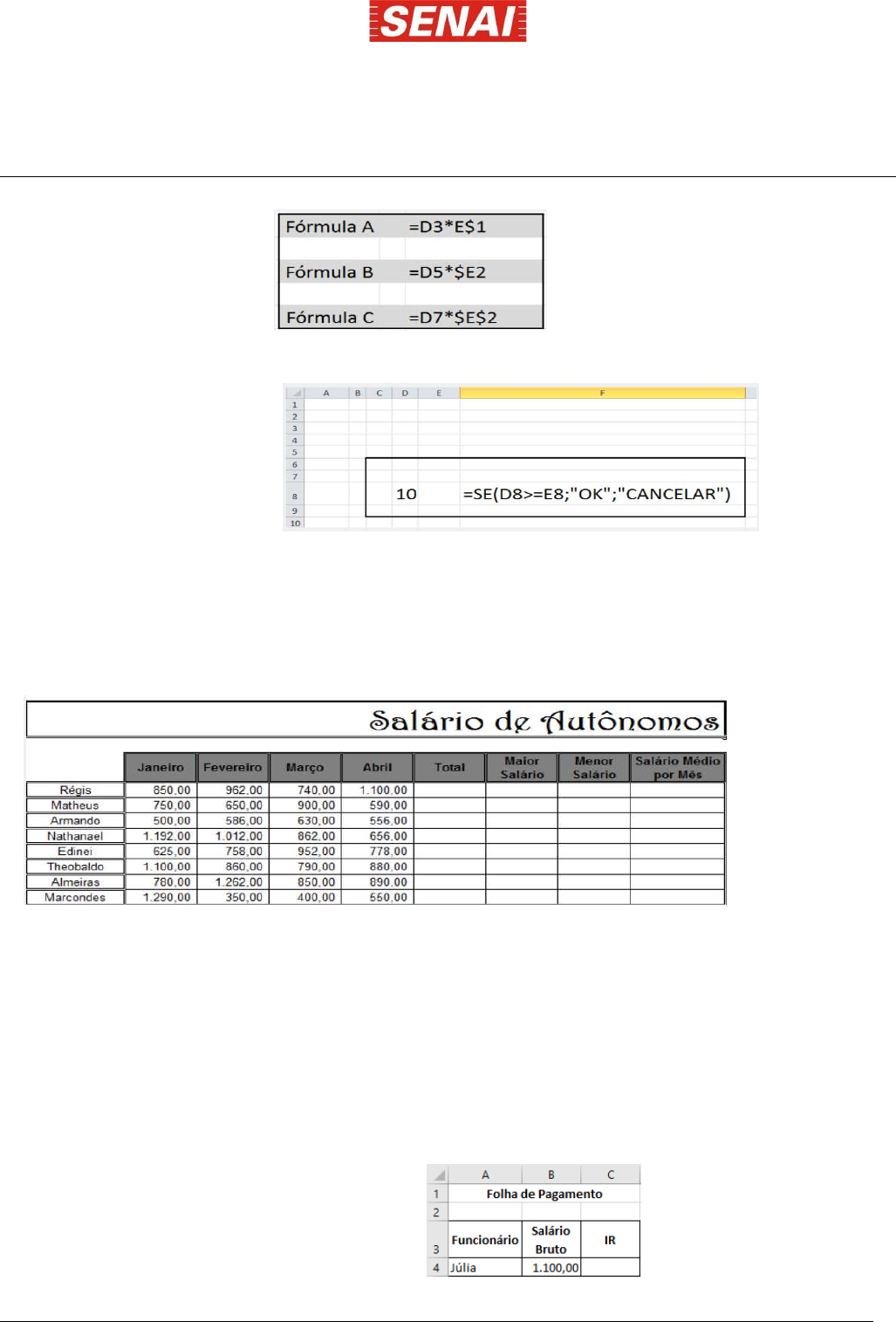 Escola SENAI Frederico Jacob Este teste visa identificar se você está pronto para fazer o curso de Excel Avançado. Estes assuntos lhe são familiares? Se sim, faça sua matrícula e bom curso. Se não, sugerimos tentar o curso de Excel Básico. P á g i n a 1 | 1 1. Qual das fórmulas abaixo corresponde a uma Cópia Relativa por Linha? a) Corresponde a Fórmula A b) Corresponde a Fórmula B c) Corresponde a Fórmula C 2. Qual será o resultado da Fórmula de Função SE apresentada abaixo: a) O Resultado será "OK" b) O Resultado será "Cancelar" c) O Resultado será "Falso" 3. Qual das funções abaixo deve ser utilizada na planilha para chegar ao resultado esperado? a) Funções: Soma - Máximo - Mínimo – Média b) Funções: Adição - Maior - Menor – SE c) Funções: SE - Maior - Menor – Médio 4. Qual função permite localizar um item através do Código e retornar dados de uma Tabela Matriz.? a) CORRESP b) DESLOC c) PROCV 5. Qual será o resultado da tabela e fórmula abaixo: =SE(B4<=100;B4*5%;SE(B4<=600;B4*6%;SE(B4<=900;B4*7%;B4*10%))) a) 110 b) 10 c) 120