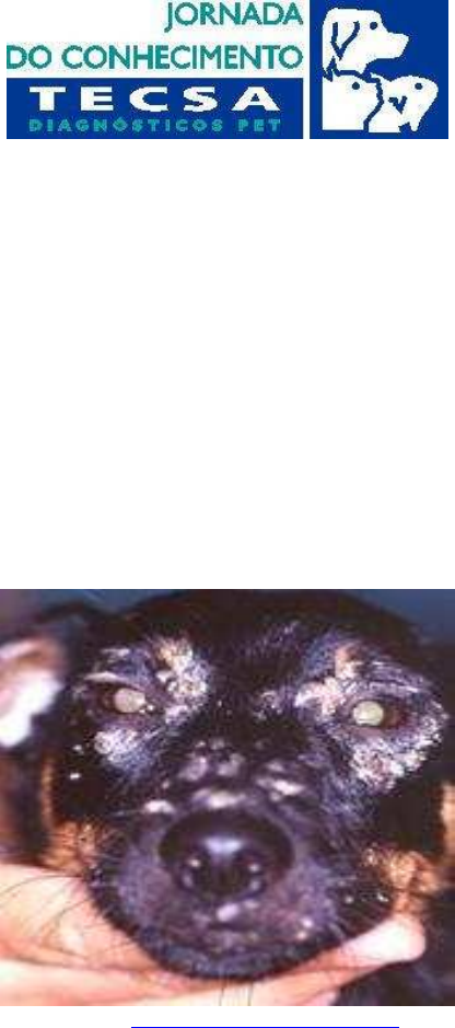 DIAGNÓSTICO DERMATOLÓGICO PARTE I – DERMATÓFITOS INTRODUÇÃO As dermatofitoses são infecções micóticas superficiais causadas pelos fungos pertencentes aos gêneros Microsporum, Epydermophyton e Trichophyton, categorizados como queratolíticos, determinando dermatopatia de curso subagudo ou crônico . Entre eles, o mais comum em cães e gatos é o M. canis, correspondendo a aproximadamente 90% dos casos. Ressalta-se também que aproximadamente 8% dos cães e 88% dos gatos carreiam assintomaticamente seus esporos. Tal fato está correlacionado a dados estatísticos que remetem ao M. canis como responsável por aproximadamente 15% das derma tofitoses humanas . Fonte : www.ciadogatopersa.com.br Figura 1 : M.canis FISIOPATOLOGIA E TRANSMISSÃO A dermatofitose geralmente se desenvolve em animais jovens (de 20 dias a 6 meses) ou de idade avançada. Afeta tanto animais de pêlo curto quanto longo, sendo mais insidiosa nestes últimos devido a dificuldade de eliminar os esporos do fungo. Os esporos, forma de reprodução do fungo, se disseminam com grande facilidade podendo viver de meses a anos no ambiente ou mesmo nos utensílios utilizados pelos animais, por exemplo, escovas e cama. A exposição ou contato com o dermatófito nem sempre resulta em infecção e, por vezes, a própria infecção não resulta em sinais clínicos. Além do contato direto, importantes fontes de infecção são os chamados portadores, isto é, animais sem sintomas visíveis mas que conduzem o material infeccioso. O dermatófito cresce nas camadas queratinizadas dos pêlos, das unhas e da pele. Não se desenvolve em tecido vivo e tem dificuldade de sobrevivência em locais com inflamação severa. O período de incubação varia de 1 a 4 semanas, dependendo das condições do substrato. O aparecimento da dermatofitose é comum em condições de falha do sistema imune tais como câncer, stress, ambiente desfavorável, vacinação e tratamentos prolongados com corticosteróide. A dermatofitose também ocorre em condições de alto requerimento metabólico, como a prenhez e a lactação, ou em ambientes que convivam muitos animais, a exemplo dos canis e gatis associados ao intenso movimento de entrada e saída dos animais. É uma doença infectocontagiosa e a infecção se dá por contato direto com pelos de animais doentes, por fômites contaminadas (escovas, toalhas, camas, tesouras, transporte, etc) ou por contaminação ambiental. Os pelos contendo artroconídeos infectantes podem permanecer viáveis no ambiente por muitos meses. Os animais assintomáticos geralmente são animais domiciliados, com livre acesso a rua, que vão a exposição adquiridos de canis ou gatis. A presença dos animais assintomáticos contribui para a infecção de outros animais, de seres humanos e dificulta o controle ambiental. SINTOMAS A manifestação clássica da dermatofitose é a alopecia circular com pápulas foliculares finas e crostas na periferia, mais comumente observada em gatos e frequentemente mal interpretada em cães. Nestes, o que comumente se observa é uma dermatite inespecífica com formação de crostas e escamas e, na maioria dos casos, há o envolvimento folicular. Escamas, eritema e prurido são sintomas variáveis de cada caso. As localizações mais comuns são na cabeça – ao redor das orelhas, olhos e focinho e nas patas. As lesões podem ser únicas, múltiplas e/ou generalizadas, afetando todo o manto piloso. Fonte : www.olivaproenca.com Figura 2 : M.canis Fonte: www.ciadogatopersa.com.br Fonte: www.ciadogatopersa.com.br Figura 3 : Lesão alopécica circular característica de M. canis. Figura 4: Lesão de M.canis em barriga de cachorro. DIAGNÓSTICO O diagnóstico definitivo da dermatofitose é laborat orial . Exames através de microscopia direta de raspados e secreções, cultivo microbiológico e análises cito e histopatológicas evidenciam os agentes envolvidos, definindo assim a etiologia da doença. Vale lembrar a importância do diagnóstico diferencial qu e inclui dermatopatias de origem endócrina/metabólica além de hipersensibilidade/ato pia. Atenção especial deve ser também destinada aos fatores predisponentes como doenças i munossupressoras , ambiente e hábito de vida do animal, com o propósito de instituir além da terapêutica específica, medidas de controle e prevenção das doenças. VETCHECK – Dermatófitos Além do diagnóstico laboratorial, o clínico pode co ntar com o VetCheck – Dermatófitos! Figura 5: Kit VetCheck TECSA Laboratórios Fonte: TECSA Laboratórios Trata-se de um kit diagnóstico para uso veterinário composto de um meio de cultura específico (4 placas/testes) e folheto de instruções. O meio é o mesmo utilizado no TECSA Laboratórios, que contém nutrientes específicos que facilitam o crescimento de dermatófitos além de antibióticos específicos que previnem o crescimento de outros microorganismos não patogênicos. A finalidade do kit abrange o auxílio no diagnóstico das dermatofitoses em cães, gatos, equinos e até mesmo bovinos e suínos. Resultados positivos são caracterizados pela mudança de cor do meio de cultivo (indicador de alteração de pH) e as colônias formadas são de cor branca, possuindo aspectos específicos. Demais crescimentos e ausência da mudança de cor do meio caracterizam o crescimento de fungos não dermatófitos ou saprofíticos. Microsporum, Trichophyton e Epidermophyton produzem metabólitos alcalinos, o que determina a mudança de cor do meio. Os resultados podem ser obtidos a partir de 48 horas (mudança de cor do meio) até 14 dias (colônias adultas características). Uma observação complementar em microscopia ótica pode ser necessária, podendo uma amostra da colônia formada ser enviada ao laboratório para a identificação do agente (gênero e espécie) e para realização de antifungiograma. Figura 6: Colônias de dermatófitos evidenciadas pelo VetCheck Fonte: TECSA Laboratórios Entre em contat