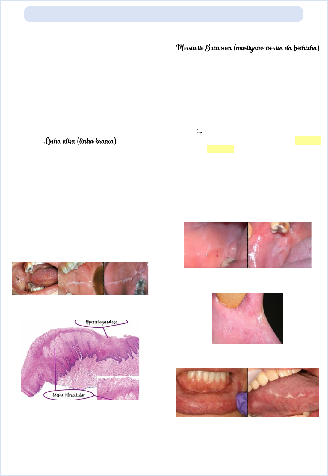 Fabiana Dantas Turino Lesões físicas e químicas da mucosa oral - Cap. 8 - Parte 1 Aula 11 – Bloco 1 – Patologia 1 Nessa aula iremos falar sobre: • Linha Alba • Morsicatio Buccarum • Ulcerações traumáticas • Queimaduras elétricas e térmicas • Lesões químicas à mucosa oral • Necrose anestésica • Queilite exfoliativa • Trauma por práticas sexuais É uma alteração muito comum que surge por pressão, irritação ou trauma de sucção na superfície vestibular. • É uma linha branca bilateral • Que se estende por toda mucosa jugal na linha de oclusão • A linha alba pode ser festonada ou proeminente. Além disso, pode apresentar áreas dentadas • Geralmente detectada em mulheres • Não necessita de biópsia • Tratamento: Somente acompanhamento clínico. Caso haja ulcerações deve-se identificar os dentes mal- posicionados. Figura 1 - Linha Alba - Linha branca leucoplásica na mucosa jugal em área de oclusão Figura 2 - Microscopia - Observa-se o epitélio pavimentoso estratificado paraqueratinizada apresentando uma maior espessura (aumento da camada espinhosa – acantose), aumento da camada de paraqueratina (deixando a lesão esbranquiçada), além de células com volume aumentado e citoplasma esbranquiçado, que representa a entrada de edema/liquido intracelular, causado pelo trauma da mastigação. Refere-se a mastigação crônica da bochecha, onde veremos: • Lesão da mucosa jugal anterior bilateral • São lesões induzidas por estresse ou quadros psicológicos • Comum em mulheres acima dos 35 anos • As lesões são caracterizadas clinicamente como áreas brancas, espessadas e fragmentadas, entremeadas a zonas eritematosas, com erosão ou ulceração. Essa superfície acometida fica dilacerada, e o paciente relata que consegue realizar a remoção de fragmentos. • Tratamento: Eliminação da causa = acompanhamento psicológico para eliminar o hábito da mastigação crônica • Quando a mastigação crônica ocorre na mucosa labial a denominação correta é morsicatio labiorum; E quando a mastigação crônica ocorre na borda lateral da língua a denominação correta é morsicatio linguarum. Figura 3 – Morsicatio buccarum – Áreas esbranquiçadas e espessadas, com alguns pontos de hemorragia pelo trauma Figura 4 – Morsicatio buccarum – Em região de mucosa jugal anterior Figura 5 - A) Morsicatio labiorum; B) Morsicatio linguarum Fabiana Dantas Turino Figura 6 - Microscopia de Morsicatio buccarum - Observa-se a mucosa revestida por epitélio pavimentoso estratificado paraqueratinizado, com grande formação de queratina chamada de hiperparaqueratose. Além de colônias bacterianas associadas e superfície dilacerada por causa do trauma da mastigação crônica. Figura 7 - Camada extensa de paraqueratina (hiperparaqueratose), colônia de bactérias, e as células com edema intracelular e aspecto balonizante em decorrência ao trauma. É importante que diferenciamos as ulcerações traumáticas das ulceras que popularmente conhecemos como afta, que tem etiologia imunológica. As ulcerações traumáticas, como o nome já diz, são causadas por um trauma. Dividimos as ulcerações traumáticas em: • Úlcera traumática simples: Geralmente associada a um dente fragmentado/remanescente radicular que irá causar uma ulcera na mucosa. • Úlcera eosinofílica (granuloma traumático): Úlcera mais profunda que pode assumir aspectos semelhantes a neoplasias que também acontecem na mucosa oral. São variantes da úlcera eosinofílica: Doença de Riga-Fede Úlceração eosinofílica atípica • São lesões comuns que podem ser agudas ou crônicas • Fonte de irritação adjacente, que geralmente é um dente • Localizações mais comuns são língua, lábios e mucosa jugal Podem ocorrer de forma secundária em lesões pré- existentes, ou seja, o paciente apresenta uma exostose óssea que está sendo traumatizada pela alimentação, resultando em úlcera traumática simples secundária. • Tratamento: Remoção da causa Figura 8 - Dente fraturado com borda bem pronunciada, causando a úlcera traumática na mucosa labial inferior. Na úlcera vemos uma área de eritema circundando uma área central recoberta por membrana fibrinopurulenta amarelada e destacável. Figura 9 – Casos de úlceras traumáticas simples, em todas vemos um halo esbranquiçado ao redor e um centro necrótico com membrana fibrinopurulenta recobrindo a lesão - A) Lesão na superfície da língua associada a dente; B) Lesão de úlcera traumática simples secundária em região de exostose óssea solitária palatina; C) Lesão de úlcera traumática simples na mucosa jugal associada a mordida; D) Lesão de úlcera traumática simples em região de fundo de vestíbulo associada ao uso de uma prótese total removível mal adaptada. Figura 10 – Microscopia da lesão de úlcera traumática simples - Podemos observar uma área de descontinuação do epitélio, onde ele é perdido, que é a área de úlcera. Logo, temos um epitélio pavimentoso estratificado paraqueratinizado, que quando chega na área central de úlcera observamos perda do revestimento epitelial. Na área de tecido de granulação (área de inflamação) vemos a formação de necrose com rede de fibrina originando a membrana fibrinopurulenta e muito infiltrado inflamatório rico em neutrófilos (também observamos linfócitos e histiócitos) e debris celulares. • É uma úlcera crônica traumática, a qual podemos chamar de processo inflamatório crônico com ulceração e eosinofilia. • Apresenta uma reação inflamatória profunda e regressão lenta (1 semana a 8 meses). • Geralmente ocorre em homens sem predileção de idade Fabiana Dantas Turino • Ocorre com maior frequência na língua, e também em gengiva, mucosa jugal, assoalho de boca, palato e lábio menos frequentes. • O aspecto clinico é muito semelhante a uma ulceração traumática simples, mas pode ocorrer forma