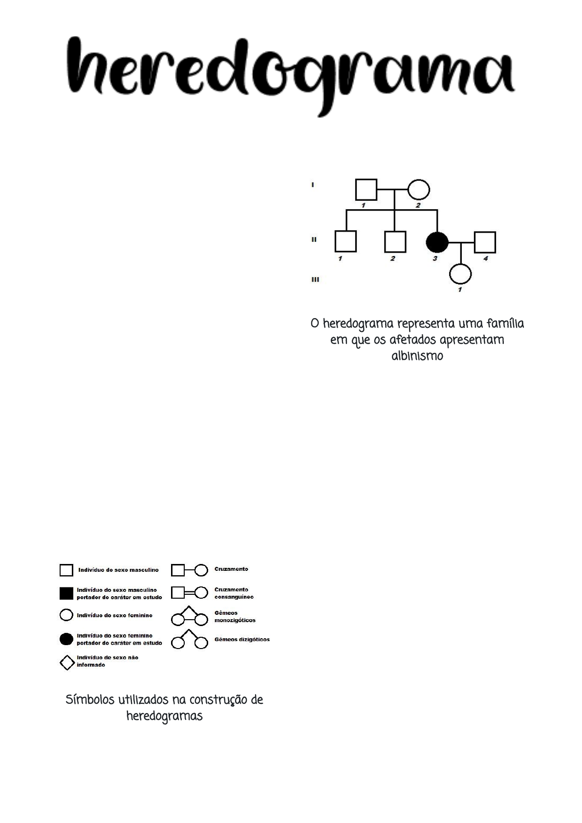 Em Genética, frequentemente analisamos questões relacionadas à hereditariedade e, para compreendê-las melhor, realizamos observações a respeito do histórico familiar do indivíduo. Para ajudar nessas análises, foram criados os heredogramas, representações que ilustram o grau de parentesco entre os organismos e em que indivíduos pode ser observada uma dada característica. → Simbologia usada nos heredogramas Na construção de heredogramas, utilizam-se algumas simbologias para ilustrar os indivíduos e as respectivas relações de parentesco. A seguir, veja algumas dessas simbologias usadas em um heredograma: Símbolos utilizados na construção de heredogramas Utilizando esses símbolos, torna-se fácil construir e entender um heredograma. O heredograma representa uma família em que os afetados apresentam albinismo Considerando que o heredograma acima representa uma família que tem o gene para o albinismo, O heredograma possui três gerações; ● O casal 1 e 2 da primeira geração teve três filhos: dois do sexo masculino e um do sexo feminino; ● O indivíduo 3 da segunda geração é uma mulher afetada, ou seja, albina; ● O indivíduo 3 casa-se com um indivíduo normal; ● O casal 3 e 4 da geração II teve uma filha. https://mundoeducacao.uol.com.br/biologia/hereditariedade.htm