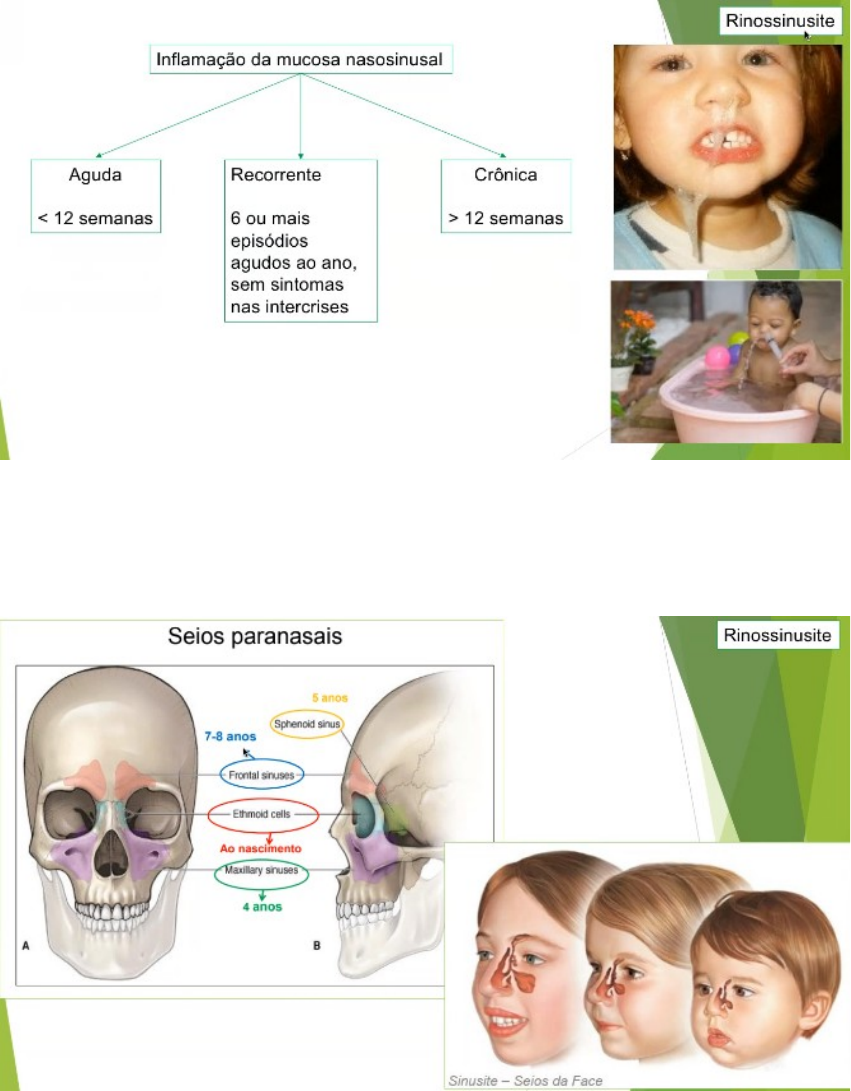 INFECÇÃO DE VIA AÉREA SUPERIOR - IVAS · Tosse piora à noite na IVAS devido ficar deitado, drena a secreção para a retrofaringe, e a tosse é um mecanismo protetor. · Seios maxilares só começam a areação aos 4 anos, os seios frontais só aos 7 ou 8 anos. Por isso só depois dos 4 anos costuma ocorrer sinusite. · Os únicos que já são areados ao nascer são os seios etmoidais. · Secreção amarelada de via aérea superior não significa necessariamente infecção bacteriana, pode ser só resto celular. · A maioria das rinossinusites começa com quadro viral. · RSA viral: resfriado, gripe. · No resfriado as 72 primeiras horas é muito ruim e depois de 72 horas começa a melhorar e a secreção fica mais espessa. E geralmente essa secreção espessa e amarelada é pela manhã, quando a secreção ficou parada à noite toda e teve resto celular, mas no resto dia fica secreção clara. · Secreção parada pode ter uma infecção secundária bacteriana: isso é rinossinusite pós viral. Deve ser suspeitada quando o paciente que vinha com um quadro só de gripe e estava começando a melhorar e aí teve uma piora após 5 dias, voltou a ter febre, caiu estado geral, aí pode ser rinossinusite pós viral. OU faz 10 dias que está com secreção parada, amarelada, espessa PERSISTENTE. · RSA bacteriana: secreção mucopurulenta nasal (o dia inteiro, e não somente pela manhã), febre, dor facial, piora clínica, duração menor que 12 semanas. · Rinossinusite viral: Gripe e resfriado tem duração menor que 10 dias. · Gripe: é devido influenza · Resfriado comum: rinovírus, coronavírus, adenovírus e os outros tipos. · Início dos sintomas da gripe é súbita, do resfriado é gradual. · Mucolítico: n-acetilcisteina · Não usar solução salina hipertônica pois isso desidrata, pois pode causar fragilidade dos vasos e causar epistaxe. · Tem que usar a solução salina isotônica Nacl · SÃO PROIBIDOS – PROSCRITOS: Afrin, decongex (descongestionante nasal tópico), faz intoxicação se SNC e não deve ser passado. Porque eles fazem depressão do centro respiratório e não tem antídoto. · Não tem evidencias que antitussígenos e anti-histamínico mude o curso da doença. Mas pode prescrever porque mal não vai fazer e pode trazer tranquilidade a família. · Antitérmico: paracetamol e ibuprofeno. RINOSSINUSITE AGUDA BACTERIANA · História pregressa de 10 dias de RSA viral ou paciente estava melhorando e depois teve piora. · Secreção mucopurulenta nasal ou retro nasal (que fica o dia inteiro, e não somente pela manhã) · Febre · Dor facial · Piora dos sintomas após fase inicial da evolução · Bactérias: s.pneumoniae, h.influenzae e M.catarrhalis. · 50% das crianças tem cura espontânea mesmo com sinusite bacteriana, mas o ATB previne complicações e causa resolução mais rápida dos sintomas. · Tratamento com ATB para prevenir: celulite periorbitária – nesses casos pedir tomografia para ver a celulite · Tratamento com ATB para sinusite é feito empiricamente que pegue as 3 bactérias mais frequentes da sinusite. · Complicações: meningite, abscesso, trombose. · Amoxicilina durante 14 dias. Dose entre 80-90mg/kg/dia pq tem cepas resistentes em SP. · Se a criança usou ATB há menos de 1 semana, usar amoxicilina com clavulanato (clavilin) · Se a criança está muito grave, usar ceftriaxone intravenosa · Diagnóstico da rinossinusite é clínico, não faz cultura de secreção. · Só faz cultura de secreção nas seguintes situações: TONSILITES(amidalite) E FARINGITES: · Tonsilite viral (amidalite): dura de 3 a 4 dias. Não costuma passar de 5 dias. · Antes dos 3 anos: prevalência bacteriana é baixa. Antes dos 3 anos a maioria dos casos é de etiologia viral a causa da amidalite. · Cocksackie: vai ter odinofagia, hiperemia de orofaringe, estomatite ulcerativa - aftas · Exantema viral: episteinn bar · Conjuntivite: adenovírus Sugere infecção bacteriana: · Adenite mesentérica causa dor abdominal, e a adenite mesentérica ocorre devido infecção bacteriana das tonsilas. · Petéquias em palato · Aumento dos linfonodos cervicais dolorosos · Amidalite bacteriana: mais frequente acima dos 3 anos, com pico entre 5 e 10 anos. · Tratamento amidalite bacteriana: ATB de escolha é penicilina · Amidalite o tratamento é sempre por 10 dias de ATB COMPLICAÇÕES · Teve história de amidalite bacteriana, Sialorreia ocorre pq a criança não consegue deglutir a saliva, odinofagia unilateral, trismo (criança não consegue abrir a boca, nem para fazer oroscopia), voz como se estivesse com uma batata quente na boca (VOZ ABAFADA). Esse abcesso peritonsilar deve internar a criança. · Mononucleose infecciosa – vírus Epstein-Barr: linfadenopatia cervical, axilar e inguinal. Exsudato na orofaringe. Rash cutâneo, hepato e esplenomegalia. LARINGITE: · Rouquidão devido edema de corda vocal, pode ter afonia, som estridor (devido diminuição da luz para passagem de ar – tosse se cachorro), tosse ladrante, dispneia. A tosse não é produtiva. · História clássica de laringite: criança que começou com quadro gripal, coriza, obstrução nasal e febre, depois de 1 ou 2 dia do quadro gripal, chama atenção a tosse e rouquidão, e depois estridor laríngeo. · Quando a criança chora, piora tosse e piora dispneia na laringite, podendo piorar hipoxemia. · Vírus parainfluenza e influenza SÍNDROME DO CRUPE: TOSSE LADRANTE, ESTRIDOR, ROUQUIDÃO · Quadro viral é a principal causa de estridor agudo. · Assim que inicia com tosse rouca e estridor, a criança piora nas próximas 72 horas. FAZER ESSE ESCORE PARA DEFINIR CONDURA: · Tratamento da laringite leve: dexametasona (por 5 dias) e alta para casa · Quadro moderado: inalação com adrenalina diluída no soro fisiológico, a adrenalina vai fazer vasoconstrição e diminuição do edema, melhorando a luz das vias aéreas. – vai ajudar na melhora da tosse, estridor. Faz dexametasona e ob