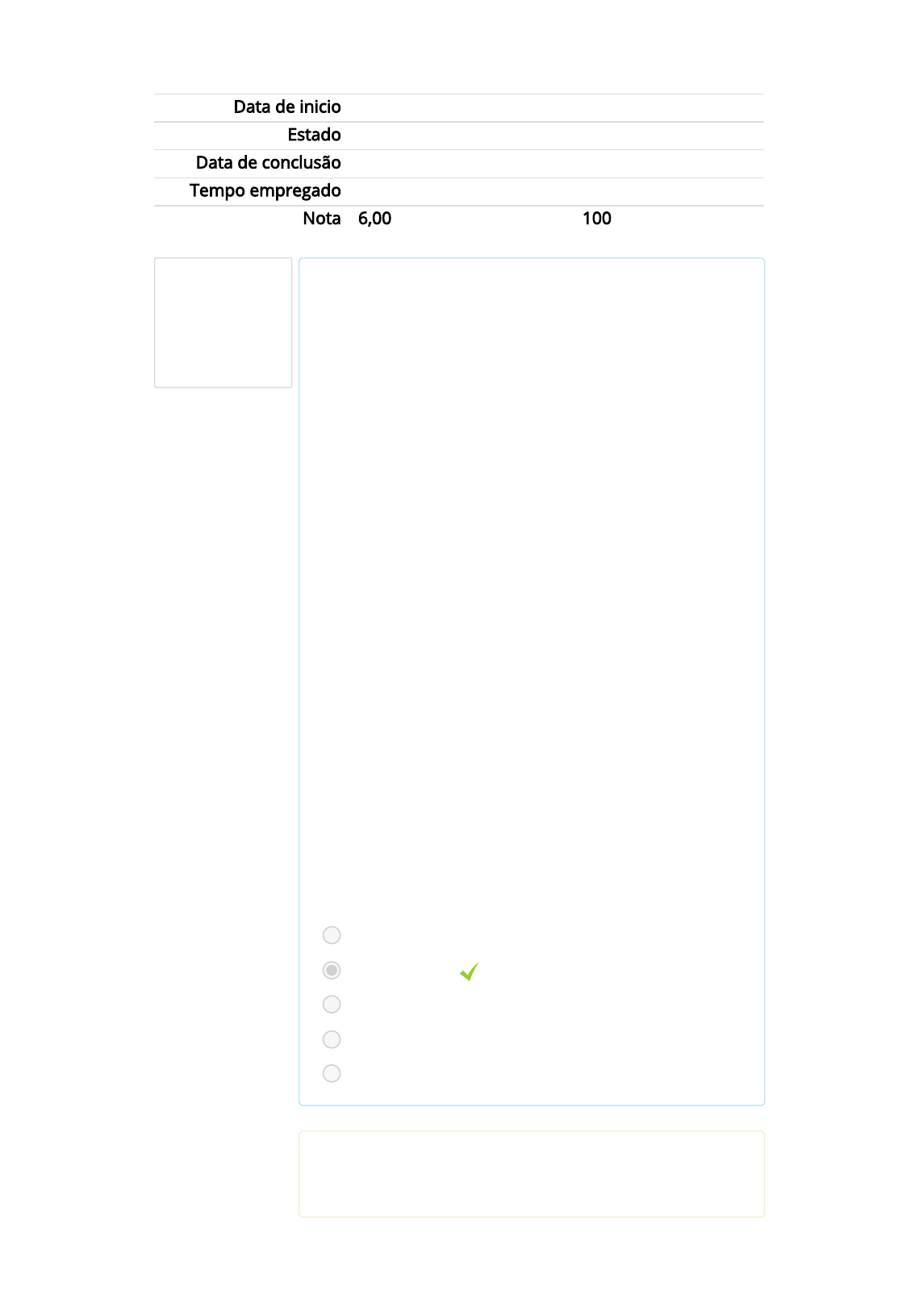 Questão 1 Correto Atingiu 0,60 de 0,60 Metodologia do Ensino e da Pesquisa → AVALIAÇÃO → PROVA Data de inicio sexta, 17 Set 2021, 14:01 Estado Finalizada Data de conclusão sexta, 17 Set 2021, 14:53 Tempo empregado 51 minutos 51 segundos Nota 6,00 de um máximo de 6,00(100%) O senso comum é uma representação da realidade que se estabelece por um conjunto de opiniões, de hábitos e de formas de pensamento utilizados rotineiramente pelos indivíduos como mecanismo que serve de orientação de suas vidas. Sobre o senso comum, assinale verdadeiro (V) ou falso (F). I - O conhecimento do senso comum acontece pelo desconhecimento do sujeito com relação ao objeto. II – O senso comum busca alcançar e estabelecer os pressupostos lógicos e válidos dos pensamentos, de ser capaz de formular questionamentos e problemáticas claras, de desenvolver raciocínios sistemáticos. III – O senso comum é o resultado das suposições e das experiências pessoais. IV – O conhecimento do senso comum acontece pela familiaridade que o sujeito possui com relação ao objeto. V – O senso comum se utiliza de termos, vocábulos e conceitos vagos, inconsistentes no seu real signi�cado, não delimitando a amplitude ou a compreensão de tais termos. Escolha uma: a. V, F, F, V, V. b. F, F, V, V, V. c. F, F, V, F, V. d. V, V, F, V, F. e. F, F, V, F, F. Sua resposta está correta. A resposta correta é: F, F, V, V, V.. https://moodle.universoead.com.br/course/view.php?id=99 https://moodle.universoead.com.br/mod/quiz/view.php?id=2323 Questão 2 Correto Atingiu 0,60 de 0,60 A avaliação resulta de um processo de negociação entre avaliadores e avaliados, envolvendo uma dialética contínua de interação, análise crítica e reanálise, e está voltada à relação dialética indivíduo/sociedade e à realidade histórica. Essa última geração é fruto, também, dos próprios debates educacionais, gerados após o processo de redemocratização do nosso país. Podemos referenciar quatro momentos das práticas avaliativas: I - A avaliação centrava-se nos objetivos, com a �nalidade de descrever os pontos fortes e fracos do que é avaliado, relativamente a um conjunto de objetivos estabelecidos. II - A �nalidade da avaliação é conduzir a discursos consensuais sobre o objeto de avaliação. É a geração em que os avaliados são coautores de sua avaliação. III - A �nalidade da avaliação foi emitir um juízo de valor acerca do mérito ou valor de um objeto. Acreditava-se que os resultados não previstos podiam ser mais relevantes que os previstos. IV - A preocupação da avaliação centrava-se unicamente na elaboração de instrumentos ou testes que veri�cassem o rendimento. A função do avaliador era técnica e esse aplicava testes e exames na classi�cação, seleção e certi�cação de alunos, a �m de determinar-lhes o progresso. Avalie as assertivas e assinale a alternativa que apresenta a correta ordem das fases: Escolha uma: Escolha uma: a. 1ª fase – 4ª fase – 2ª fase – 3ª fase. b. 3ª fase – 1ª fase – 2ª fase – 4ª fase. c. 4ª fase – 2ª fase – 1ª fase – 3ª fase. d. 2ª fase – 4ª fase – 3ª fase – 1ª fase. e. 4°Fase – 1°. Fase – 3°. Fase – 2°. Fase Sua resposta está correta. A resposta correta é: 2ª fase – 4ª fase – 3ª fase – 1ª fase.. Questão 3 Correto Atingiu 0,60 de 0,60 Questão 4 Correto Atingiu 0,60 de 0,60 Sobre os tipos de conhecimento, avalie as características a seguir e assinale a alternativa que indica o conhecimento correspondente: ESSENCIAL – OBJETIVO – REFLEXIVO – METÓDICO Escolha uma: a. Conhecimento Cientí�co. b. Conhecimento de Senso Comum. c. Conhecimento Teológico. d. Conhecimento Filosó�co. e. Nenhuma das alternativas. Sua resposta está correta. A resposta correta é: Conhecimento Filosó�co.. Há uma preocupação em todo o processo de ensino e de aprendizagem no que se refere à avaliação, de modo que essa perde o caráter punitivo ou classi�catório, ou ainda, veri�ca-se o professor enquanto parceiro do aluno no ato de avaliar. Os três tipos existentes de avaliação são: Escolha uma: a. Diagnóstica – Formativa – Somativa. b. Punitiva – Diagnóstica – Subjetiva. c. Formativa – Subjetiva – Extensiva. d. Avaliativa – Somativa – Subjetiva. e. Controladora – Diagnóstica – Exploradora. Sua resposta está correta. A resposta correta é: Diagnóstica – Formativa – Somativa.. Questão 5 Correto Atingiu 0,60 de 0,60 Planejar possibilita agir com e�ciência, ou seja, executar uma tarefa com a maior precisão possível. Contudo, além da e�ciência, é preciso considerar a e�cácia, ou seja, não basta “fazer bem feito”, é preciso fazer algo que leve a alguma coisa concreta, seja a construção de uma casa, uma viagem ou um projeto educativo que se pretende colocar em prática. Sobre planejamento, leia as a�rmativas e classi�que-as em verdadeiras (V) ou falsas (F). • Planejar demanda uma tomada de decisão. • Planejar é seguir passos especí�cos, integrados num conjunto de ações que levam à realização dos objetivos que nos propomos atingir. • Planejar é uma atividade isolada. • Todo planejamento encerra uma ação, do contrário seria inútil: planejar para não fazer não faz o menor sentido. Escolha uma: a. V – V – F – F. b. V – F – V – F. c. V – V – F – V. d. V – F – V – F. e. F – V – V – F. Sua resposta está correta. A resposta correta é: V – V – F – V.. Questão 6 Correto Atingiu 0,60 de 0,60 Questão 7 Correto Atingiu 0,60 de 0,60 Conhecimento em que o sujeito assume uma posição ativa, passa a agir de forma racional e sistemática. Por meio dessas ações, desenvolve metodologias capazes de ordenar, classi�car, compreender, explicar e dominar determinados fatos, fenômenos ou acontecimentos. A descrição acima se refere ao conhecimento: Escolha uma: a. Cientí�co. b. 