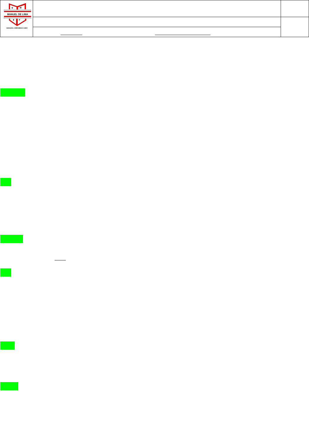 ESCOLA MUNICIPAL DE ENSINO FUNDAMENTAL MANUEL DE LIMA NOTA: ALUNO(A): ________________________________________________ Nº_____ SÉRIE: 6º ANO TURMA: ____ PROF.: RENATO SANTOS DATA: ___\___\____ AVALIAÇÃO DE MATEMÁTICA SOBRE EXPRESSÕES NUMÉRICAS, POTENCIAÇÃO E RADICIAÇÃO COM NÚMEROS NATURAIS - 2º BIMESTRE 01. Complete: Toda potência de expoente 1 é igual _______. a) à base b) ao expoente c) a dois d) a zero e) a um 02. Complete: Toda potência de expoente zero e base diferente de zero é igual a ____. a) 3 b) 5 c) 2 d) 4 e) 1 03. Complete: Toda potência de base 10 é igual ao número 1 seguido de tantos ______ quantas forem as unidades do expoente. a) quatro b) três c) dois d) zeros e) seis 04. Na operação , quem é o índice? a) 6 b) 3 c) 2 d) 5 e) 4 05. O resultado da expressão (3 . 6 - 4 + 8) : 2 = a) 33 b) 22 c) 11 d) 44 e) 55 06. Determine o resultado da seguinte potência 14² = a) 196 b) 225 c) 144 d) 100 e) 121 07. Qual o resultado de 8² = a) 16 b) 25 c) 36 d) 49 e) 64 08. Qual é o quarto termo da sequência 5, 25, 125, ...? a) 225 b) 325 c) 425 d) 525 e) 625 09. Qual é a ? a) 13 b) 14 c) 15 d) 16 e) 17 10. Determine a ? a) 7 b) 8 c) 9 d) 10 e) 11 ORIENTAÇÕES AO(A) ALUNO(A) ▪️ A AVALIAÇÃO é composta por 13 questões (3 de identificação + 10 relacionadas ao CAPÍTULO 02); ▪️ Cada questão relacionada ao CAPÍTULO 02 valerá 1 ponto, totalizando 10 pontos; ▪️ Só é permitido que o aluno(a) responda o questionário UMA ÚNICA VEZ. ▪️ Caso o aluno responda mais de uma vez, prevalecerá a MENOR NOTA; ▪️ O(a) aluno(a) terá até o final da aula para realizar A AVALIAÇÃO. Após esse tempo, o sistema não permitirá mais o envio de respostas; ▪️ É obrigatório a permanência do(a) aluno(a) no link da AVALIAÇÃO, de no mínimo 20 minutos. O não cumprimento desse quesito acarretará nas seguintes penalidades: anulação parcial ou total do AVALIAÇÃO; ▪️ Preencher o NÚMERO, NOME COMPLETO (sem abreviações), e marcar sua respectiva TURMA; ▪️ O questionário está dividido por seções; ▪️ As questões são escolhidas de forma aleatória pelo sistema, de acordo com o banco de questões; ▪️ Fique atento a barra de progresso que consta no final da página. Através dela, é possível acompanhar o progresso na resolução das questões, de modo que nenhuma questão poderá ser entregue em branco; ▪️ Após o término, clicar em ENVIAR. NÃO APARECERÁ NOTA OU GABARITO, apenas a confirmação de entrega da AVALIAÇÃO; ▪️ Após envio não é possível alterar as respostas; ▪️ Vou querer a resolução das 6 (seis) últimas questões no caderno, pois solicitarei o envio das mesmas posteriormente. BOA PROVA!