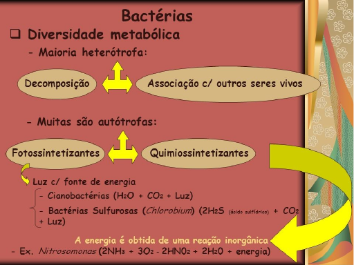 A Diversidade Metabólica das Bactérias Se há um grupo de seres que apresenta grande diversidade metabólica, certamente é o das bactérias. Existem espécies heterótrofas e espécies autótrofas. Dentre as primeiras, destacam-se as parasitas, as decompositoras de matéria orgânica e as que obtêm matéria orgânica de outros seres vivos, com os quais se associam sem prejudicá-los. Dentre as autótrofas, existem espécies que produzem matéria orgânica por fotossíntese e outras que produzem por quimiossíntese. Bactérias Heterótrofas As bactérias parasitas são as que, por meio de inúmeros mecanismos, agridem outros seres vivos para a obtenção de alimento orgânico e causam inúmeras doenças. As decompositoras (frequentemente denominadas sapróvoras, saprofíticas ou saprofágicas) obtêm o alimento orgânico recorrendo à decomposição da matéria orgânica morta e são importântes na reciclagem dos nutrientes minerais na biosfera. As que são associadas as outros seres vivos são denominadas de simbiontes, e não agridem os parceiros. é o caso das bactérias encontradas no estômago dos ruminantes (bois, cabras), que se nutrem da celulose ingerida por esses animais, fornecendo, em troca, aminoácidos essenciais para o metabolismo protéico do mesmo. Muitas bactérias heterótrofas são anaeróbias obrigatórias, como o bacilo do tétano. São bactérias que morrem na presença de oxigênio. Nesse caso a energia dos compostos orgânicos é obtida por meio de fermentação. As anaeróbicas facultativas, por outro lado, vivem tanto na presença como na ausência de oxigênio. Outras espécies só sobrevivem em presença de oxigênio - são as aeróbias obrigatórias. Um curioso grupo de bactérias é o que realiza a respiração aeróbia. Nessa modalidade de metabolismo energético existem todas as etapas típicas da respiração celular. Muda apenas o aceptor final de elétrons na cadeia respiratória. No lugar do oxigênio, essas bactérias utilizam nitrato, nitrito ou sulfato, obtendo no final, praticamente o mesmo rendimento energético verificado na respiração celular aeróbia. é o que ocorre com as bactérias desnitrificantes que participam do ciclo do nitrogênio na natureza. Nelas o aceptor final de elétrons é o nitrato.